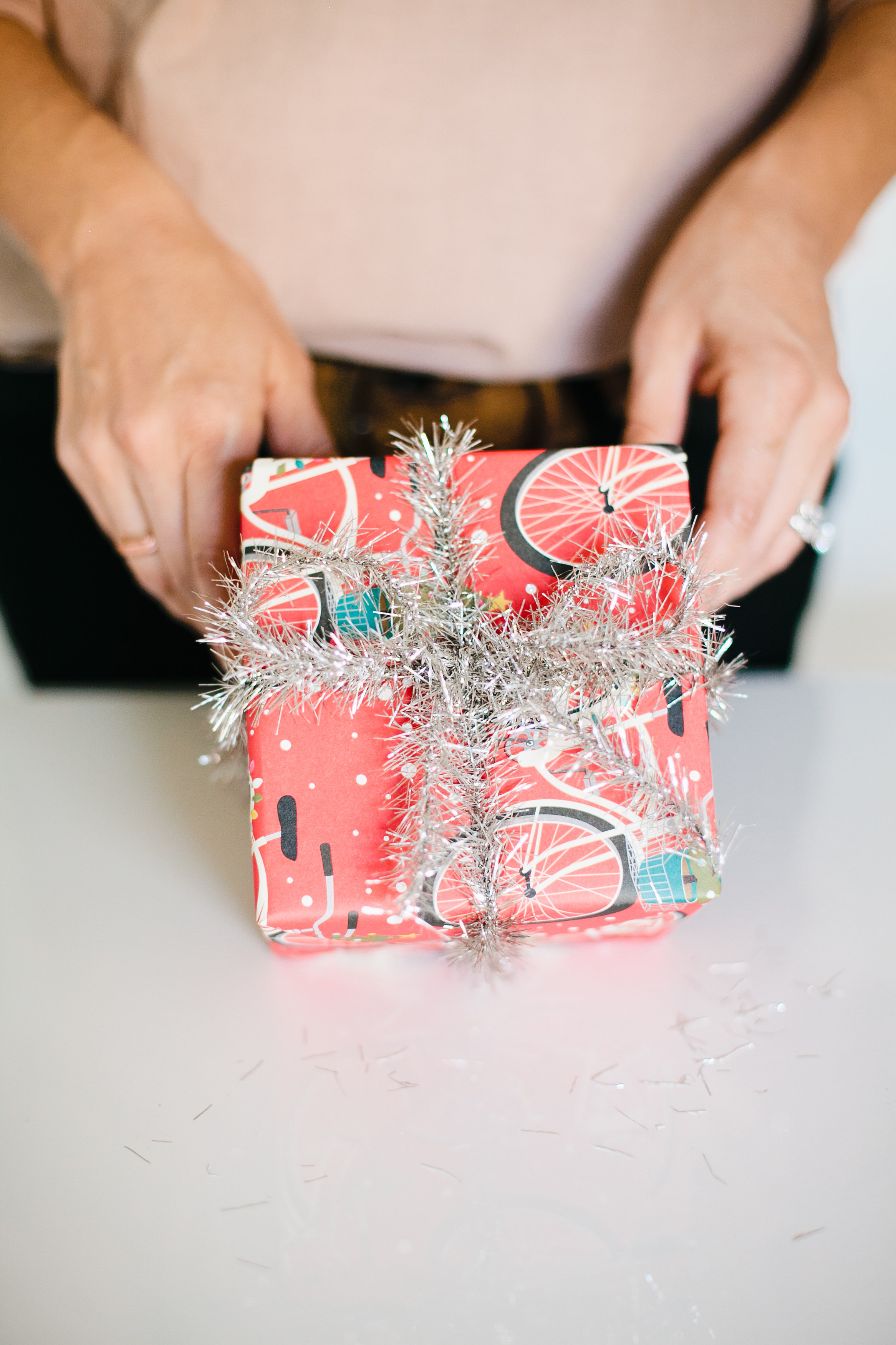 For the third theme I went to my favorite paper store … Paper Source. They have great quality paper, along with beautiful and unique designs, with great inspiration for crafting/gifting. Since I had a couple of clean and simple themes, I needed a fun option to play with this time. I love the pop of Christmas red, paired with delicate silver tinsel ribbon, and tied tradtionally to give it a vintage look.