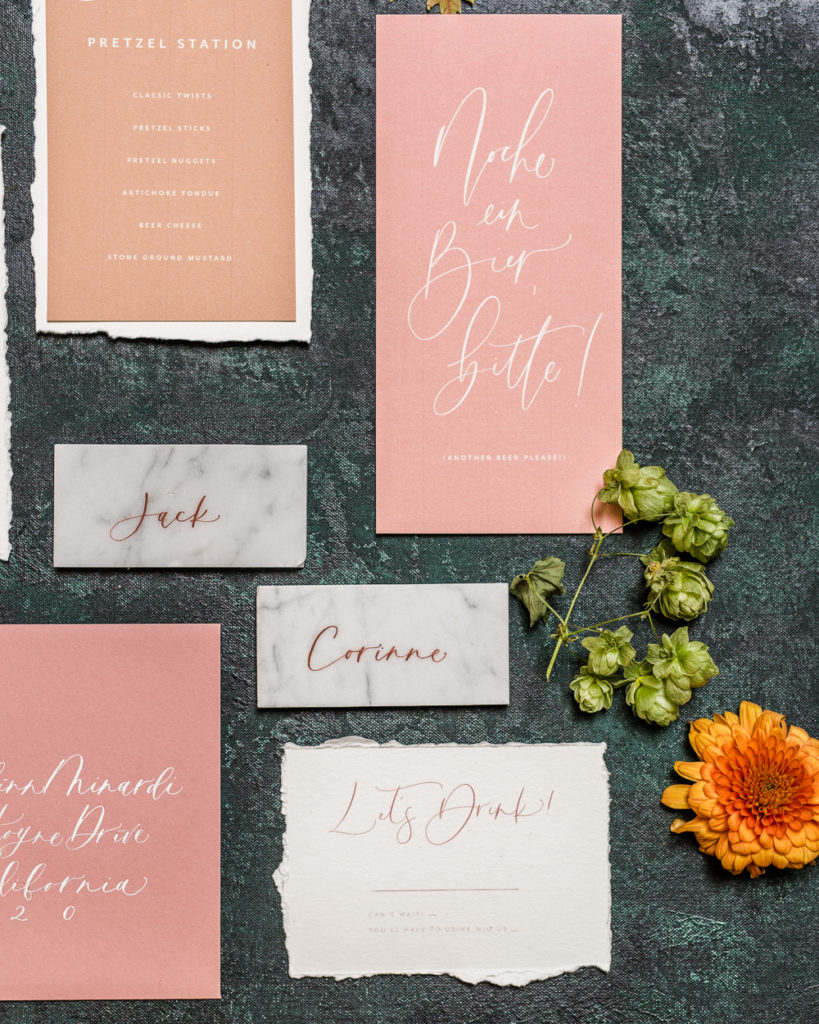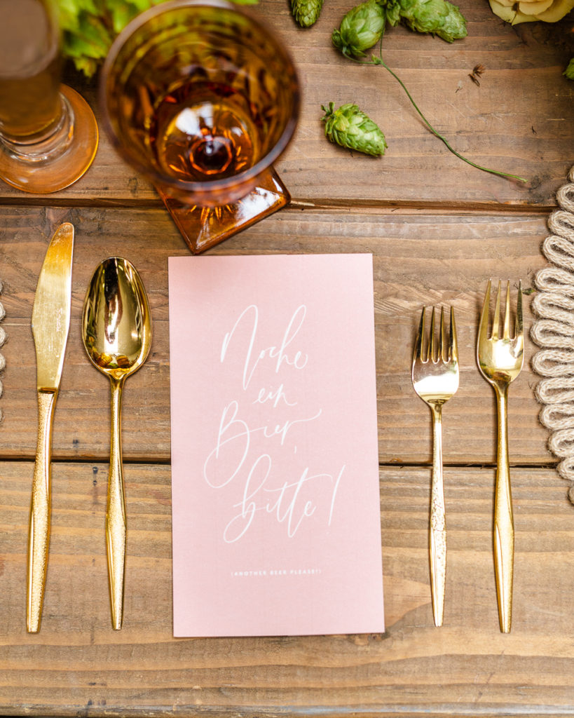 All of those pretty details are by Proper Letter, I told you she was good! These blush toned menus really feminize this table up a bit and I’m all about it! This one says “no more beer” though, just in case you need to tap out!