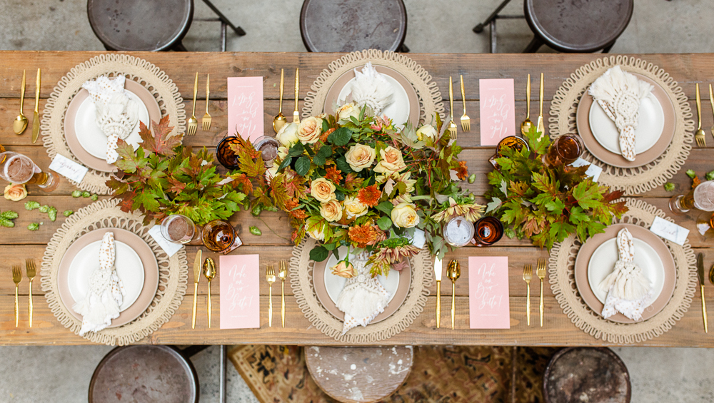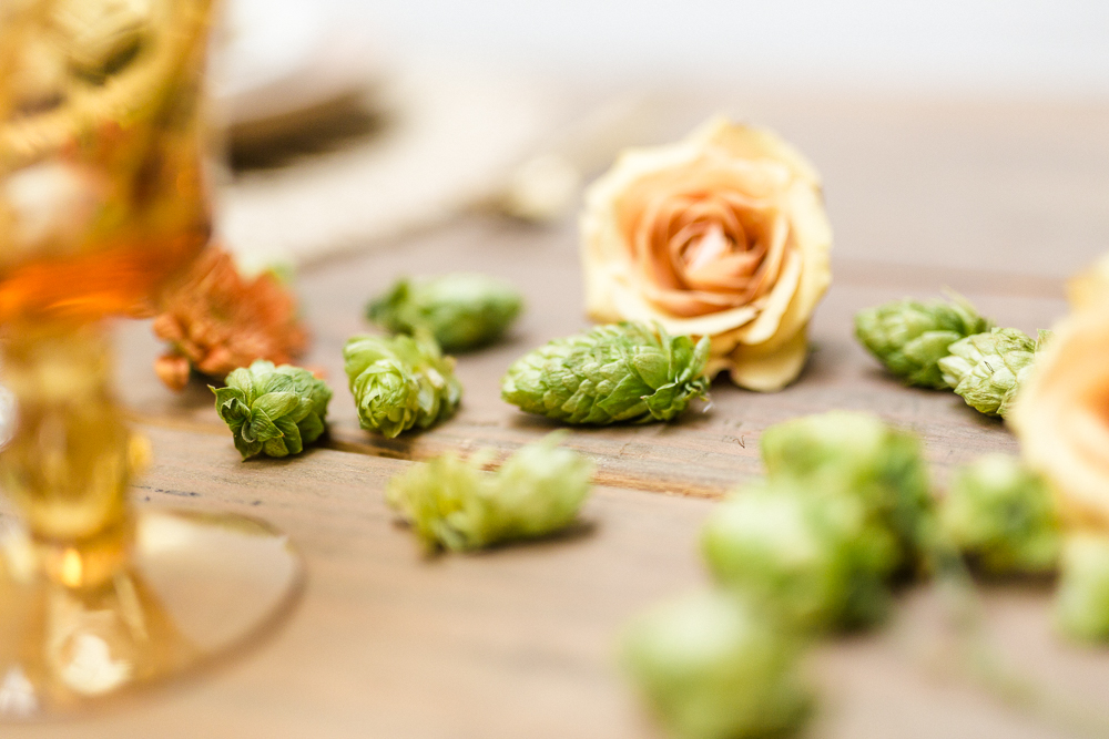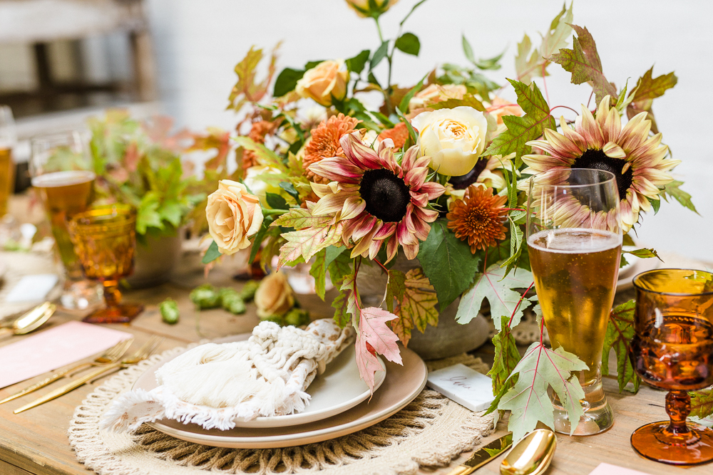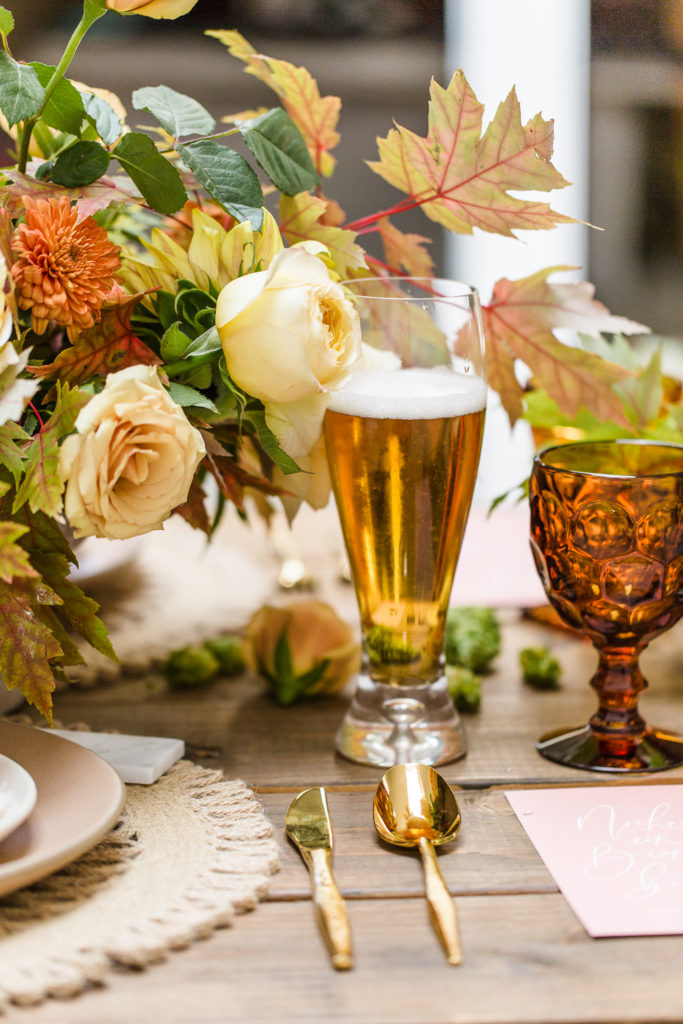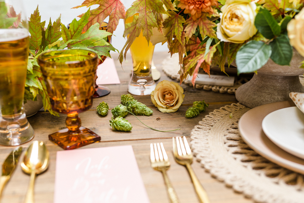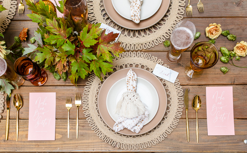 I love seeing a bit of Mother Nature on our tables and those leaves really lent themselves to this beautiful display. She also added hops, which I think speaks for itself on an Oktoberfest themed tablescape! You can even see some of it hanging above our pretty table!