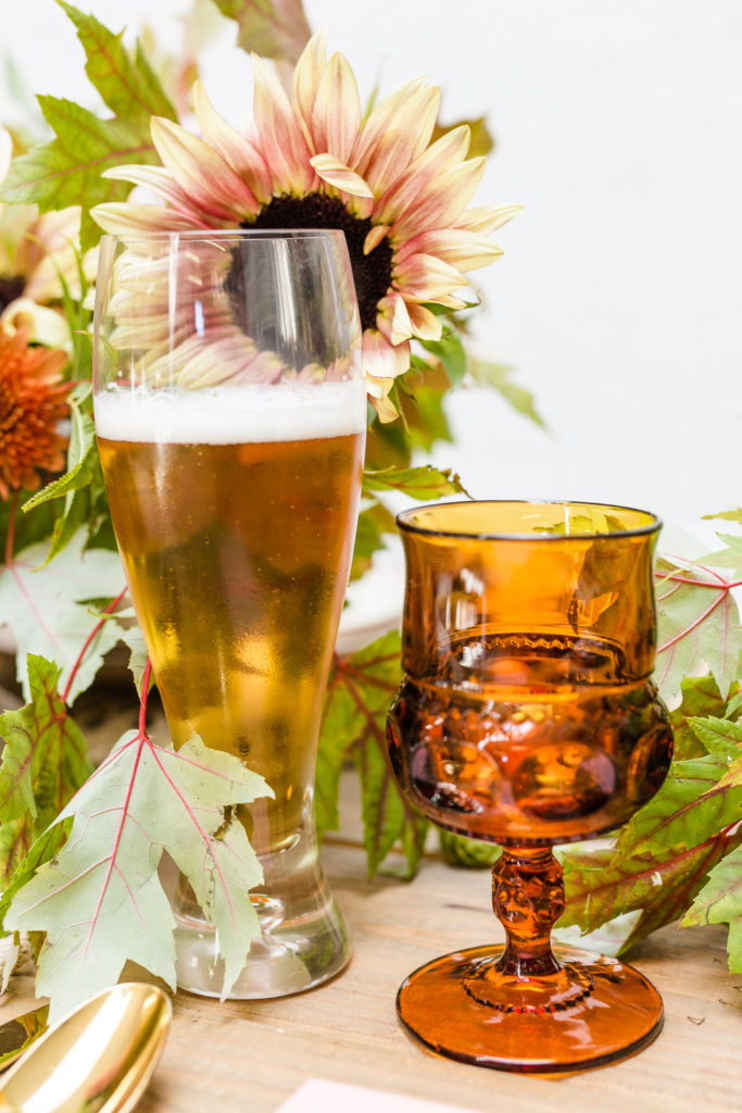I used Cherished Rental’s gorgeous tabletop items to set this sucker! Their heath ceramic plates are some of my favorites, especially this fun clay and bone color. Their gold flatware and amber glassware sat perfectly with my personal beer weiss glasses.
