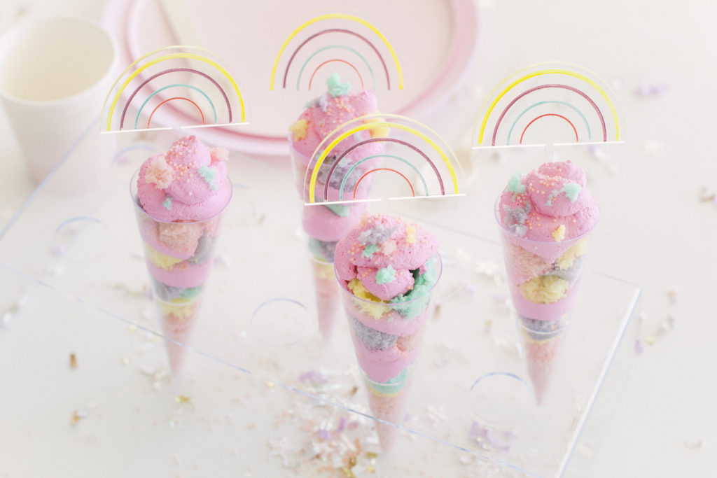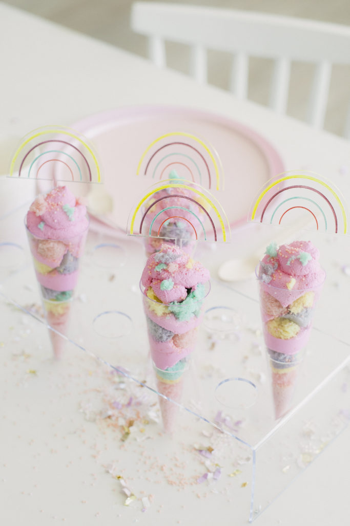 You can use little cups or some cones. Assemble to your liking! I did pancake, whipped cream, and a few sprinkles. Repeat until you hit the top! I would have loved to add lemon curd, but my kids wouldn’t eat that. But duly noted for an adult version. Top off with whipped cream, sprinkles, and some little bits of pancake.