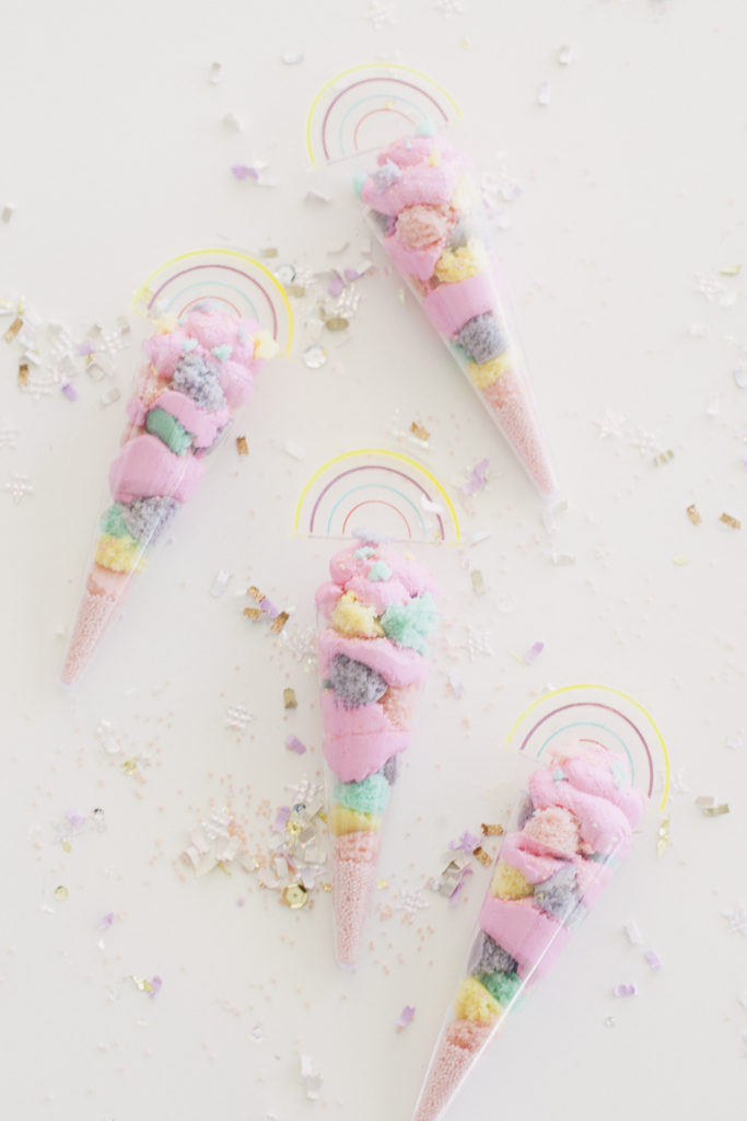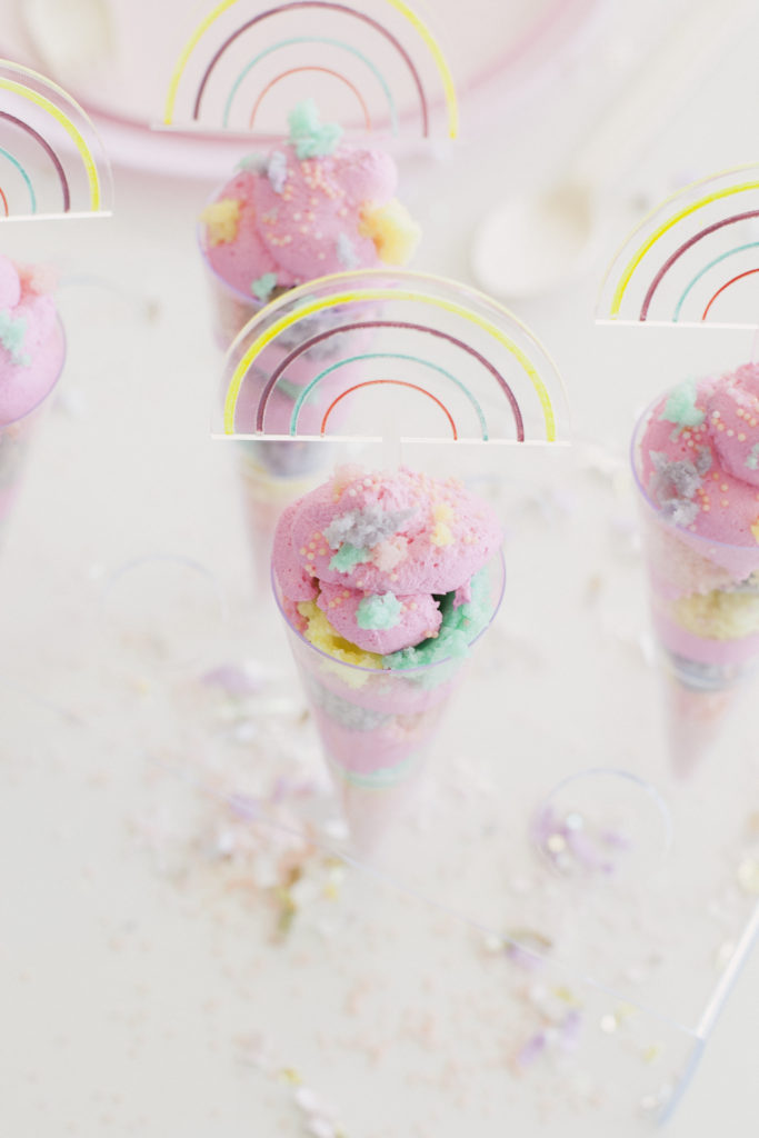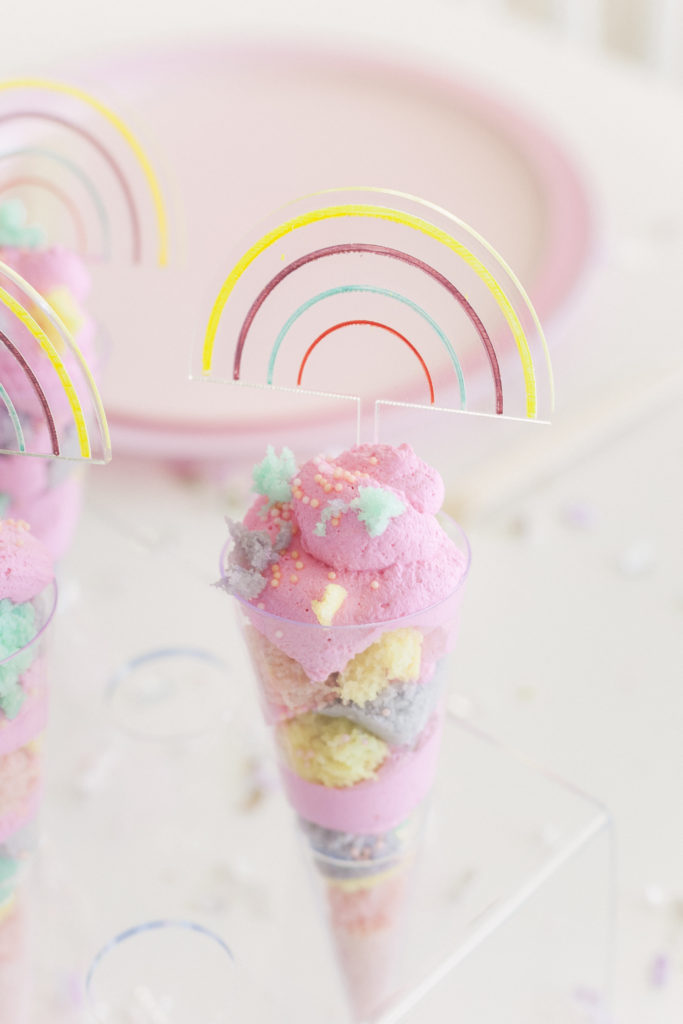 Make the pancake mix according to the package. I followed the smallest batch for each color. After you mix the batter, add the food coloring. I used pink, yellow, blue, and purple. Set the oven to 350 and grease your 6-inch cake pans. Pour the batter into each cake pan—Cook for 15-17 minutes. Take out of the oven and cool on a cooling rack. Using your watermelon baller, create little circles. If you don’t have one, you can create rustic looks by using your hands and tearing small pieces. I prefer the rustic look over the “ball” look, but totally up to you!