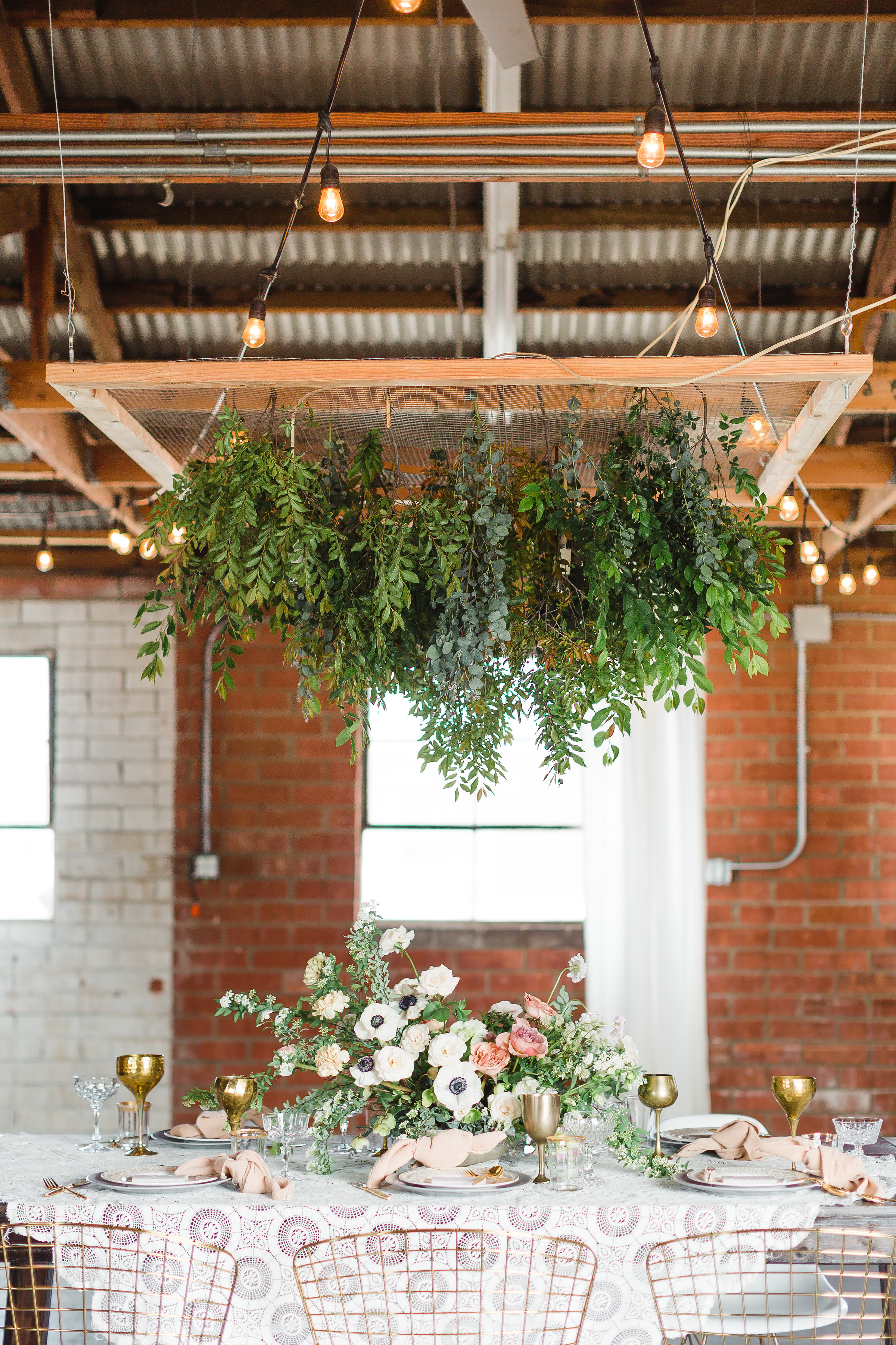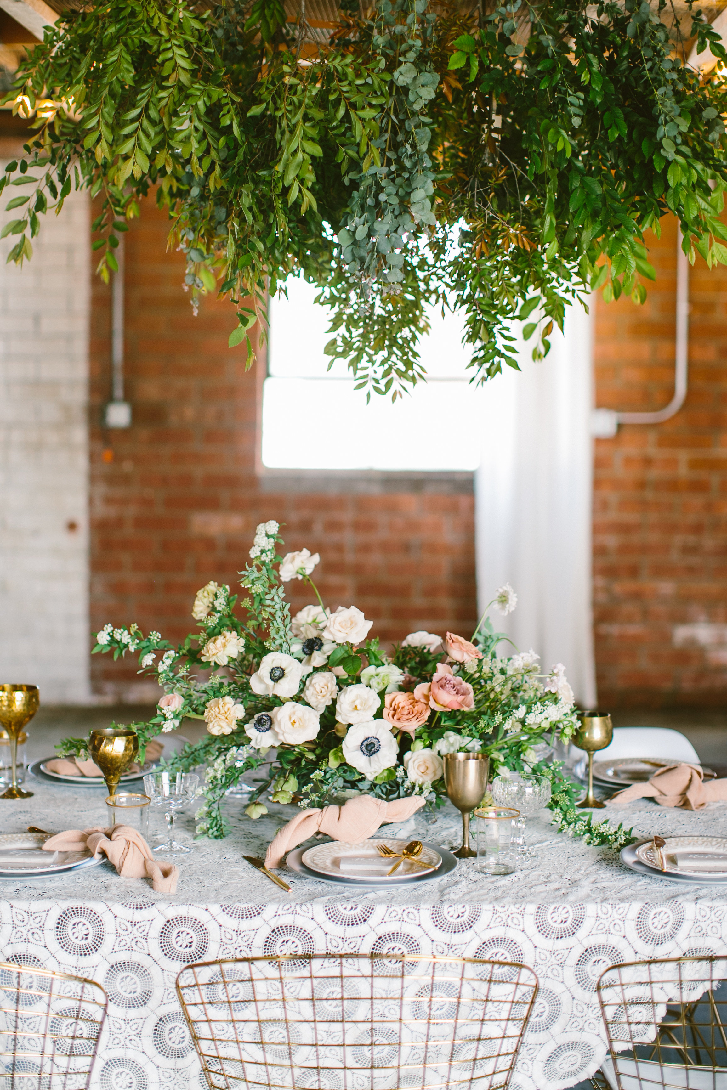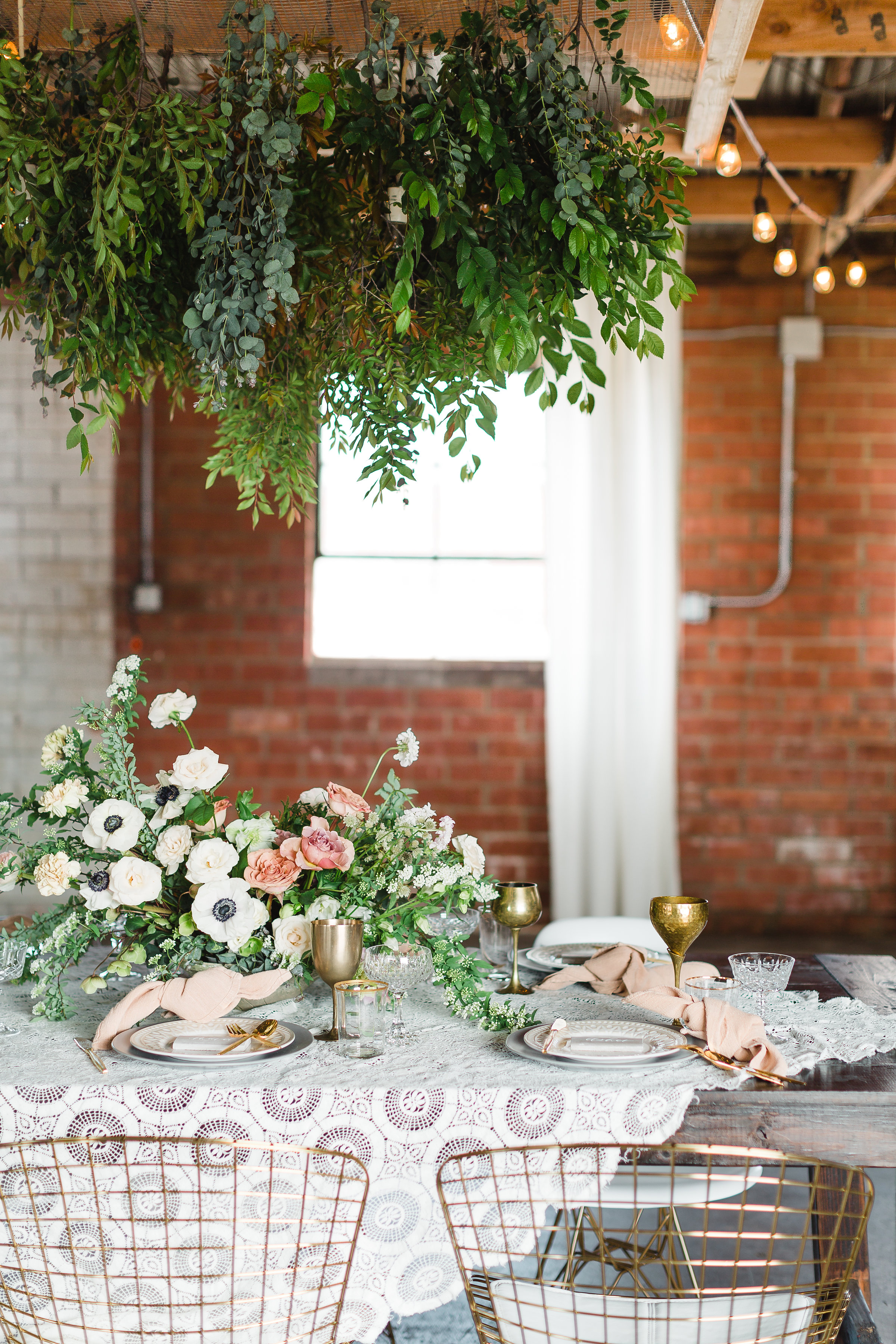 I especially love the softness of the vintage lace tablecloth compared to the industrial metal chairs and brick walls. And can we take a second to talk about that greenery install Catalina Neal created?! It really makes it feel like Spring is in the air!