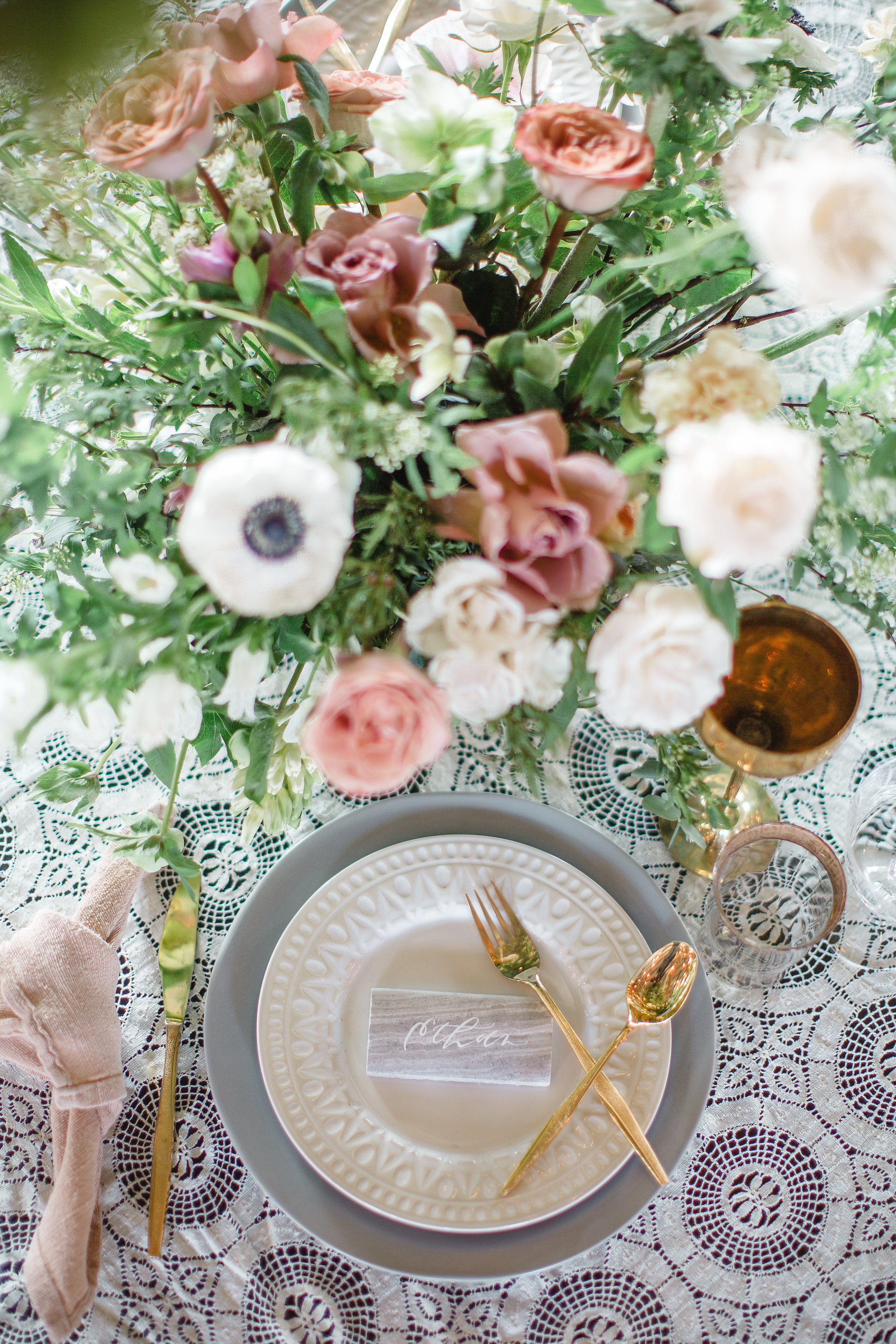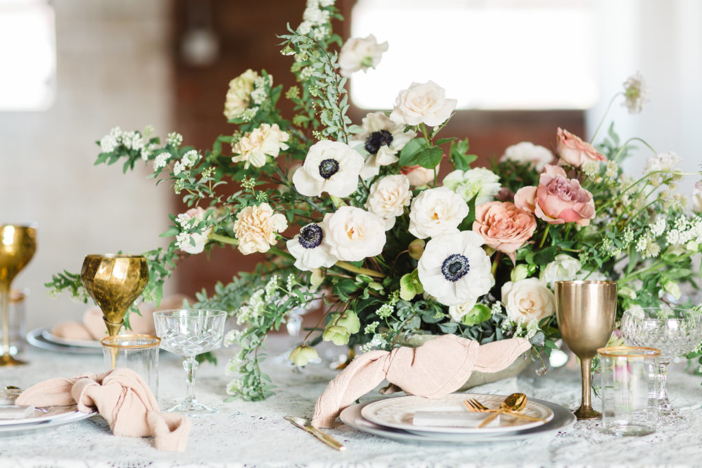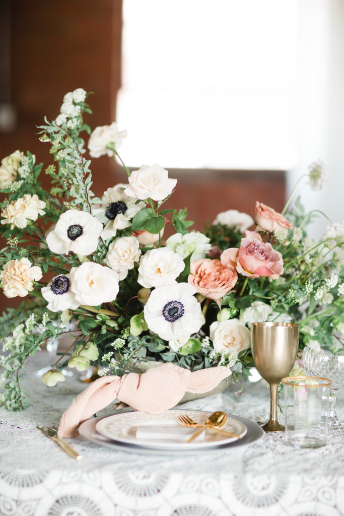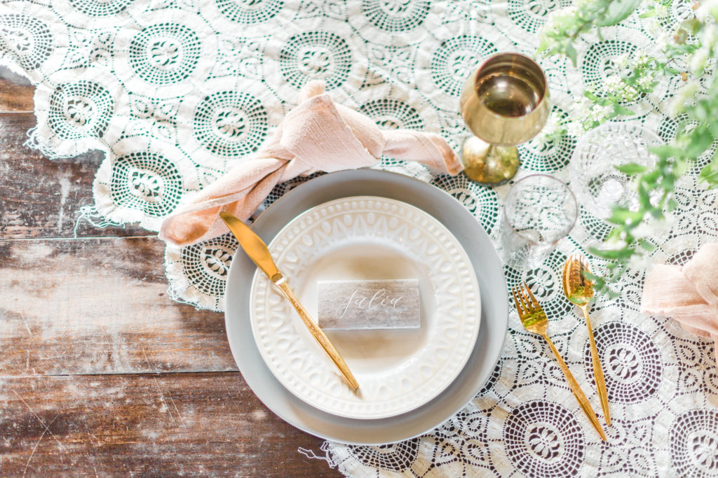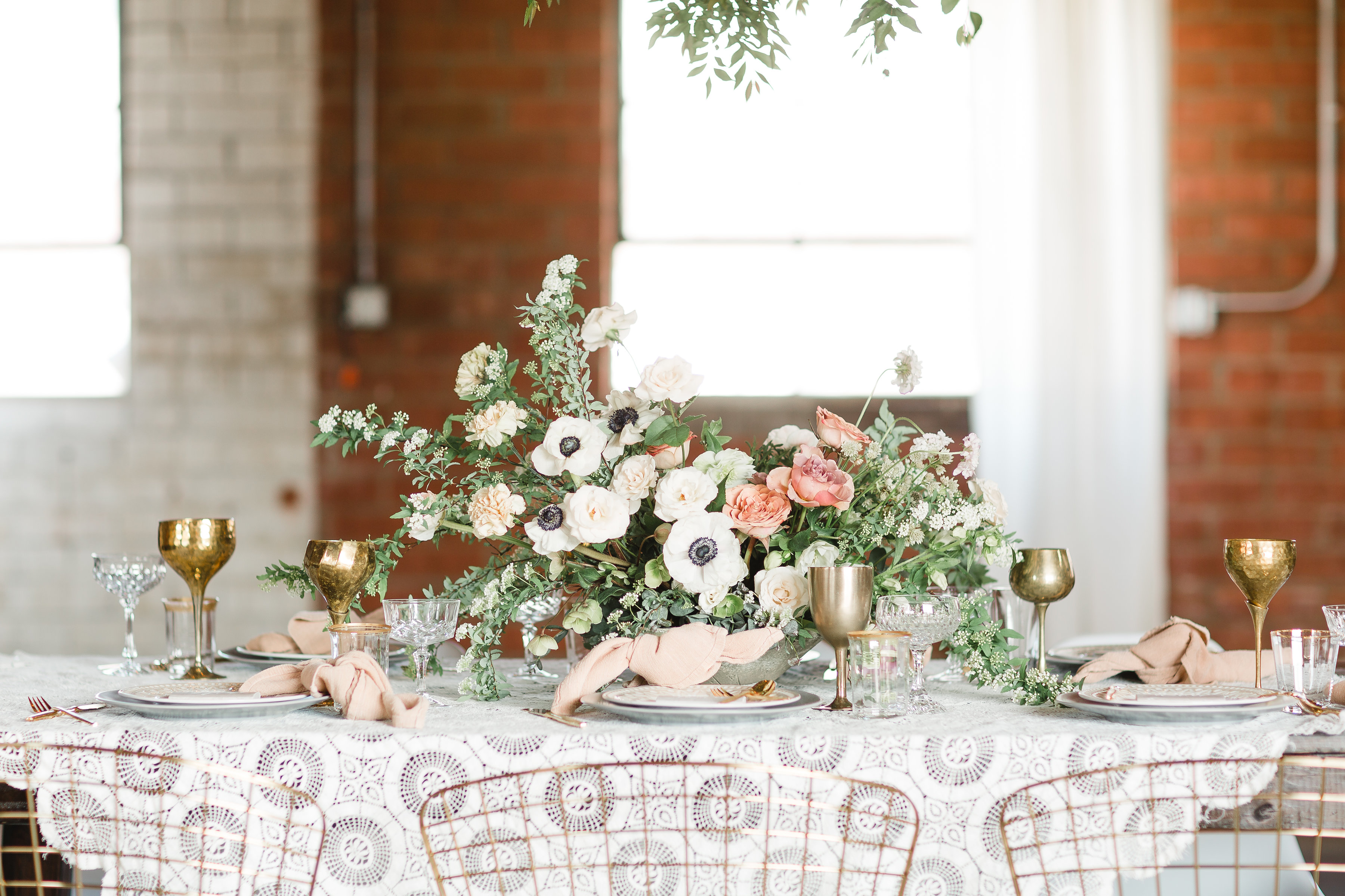 I especially love the softness of the vintage lace tablecloth compared to the industrial metal chairs and brick walls. And can we take a second to talk about that greenery install Catalina Neal created?! It really makes it feel like Spring is in the air!