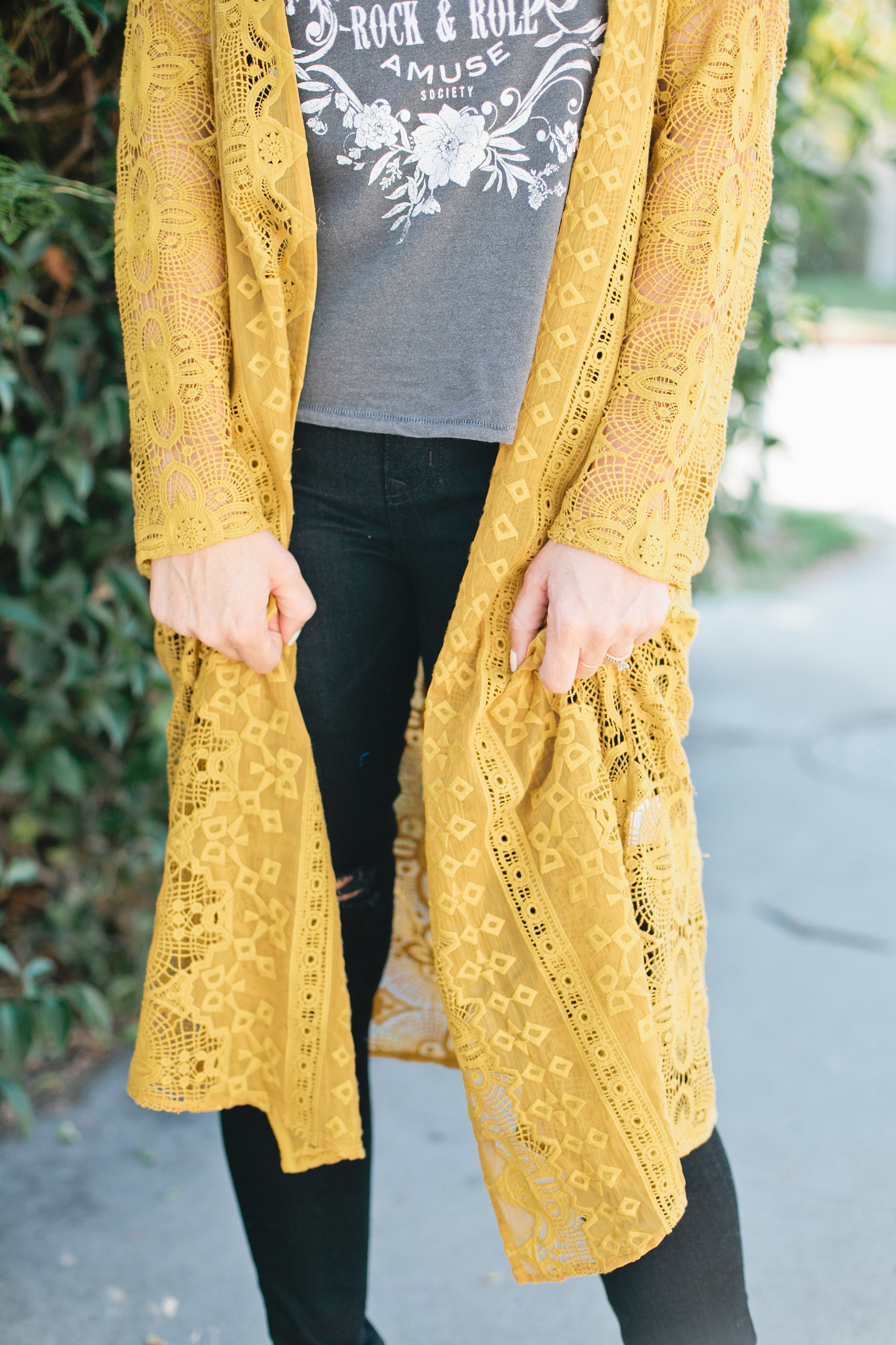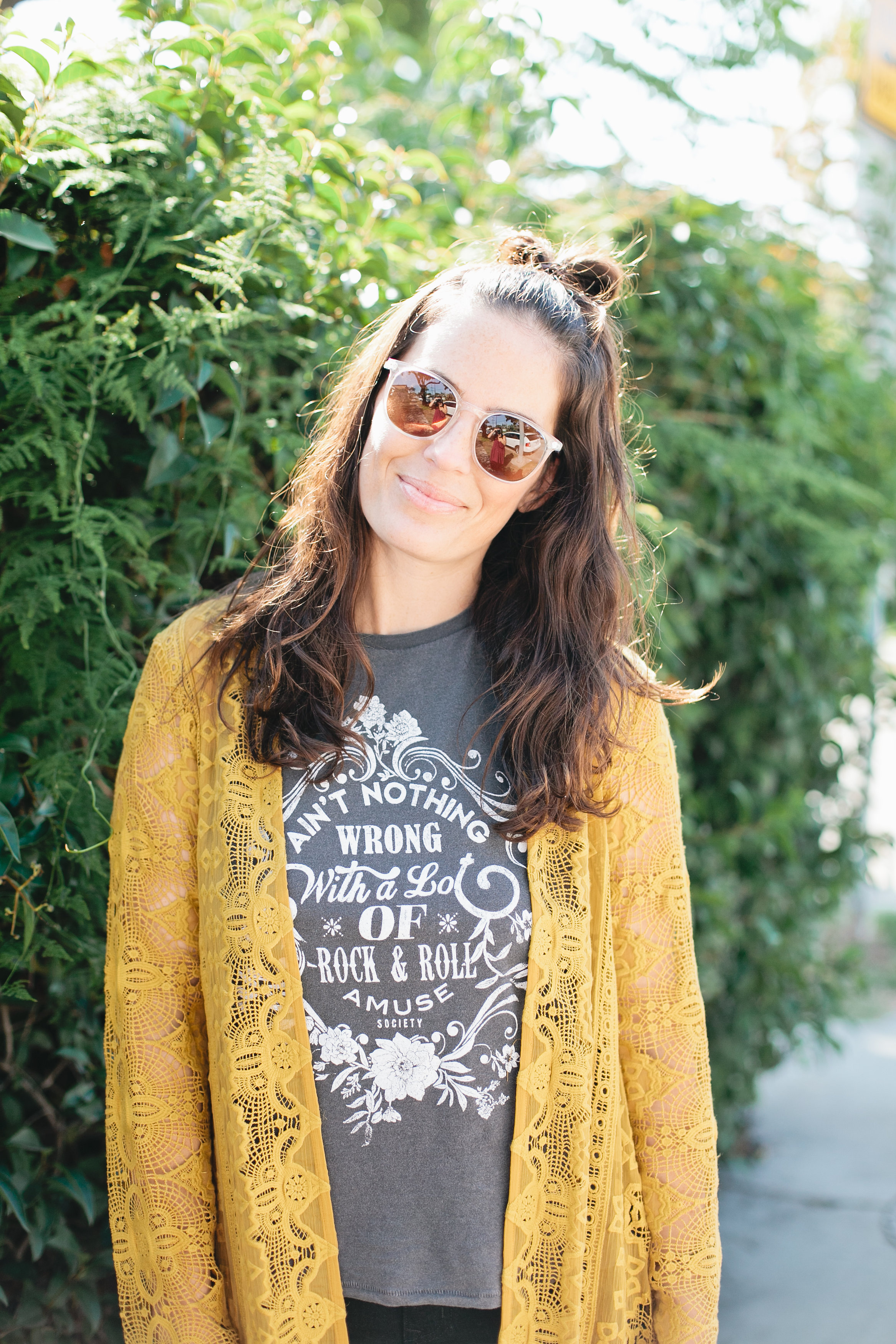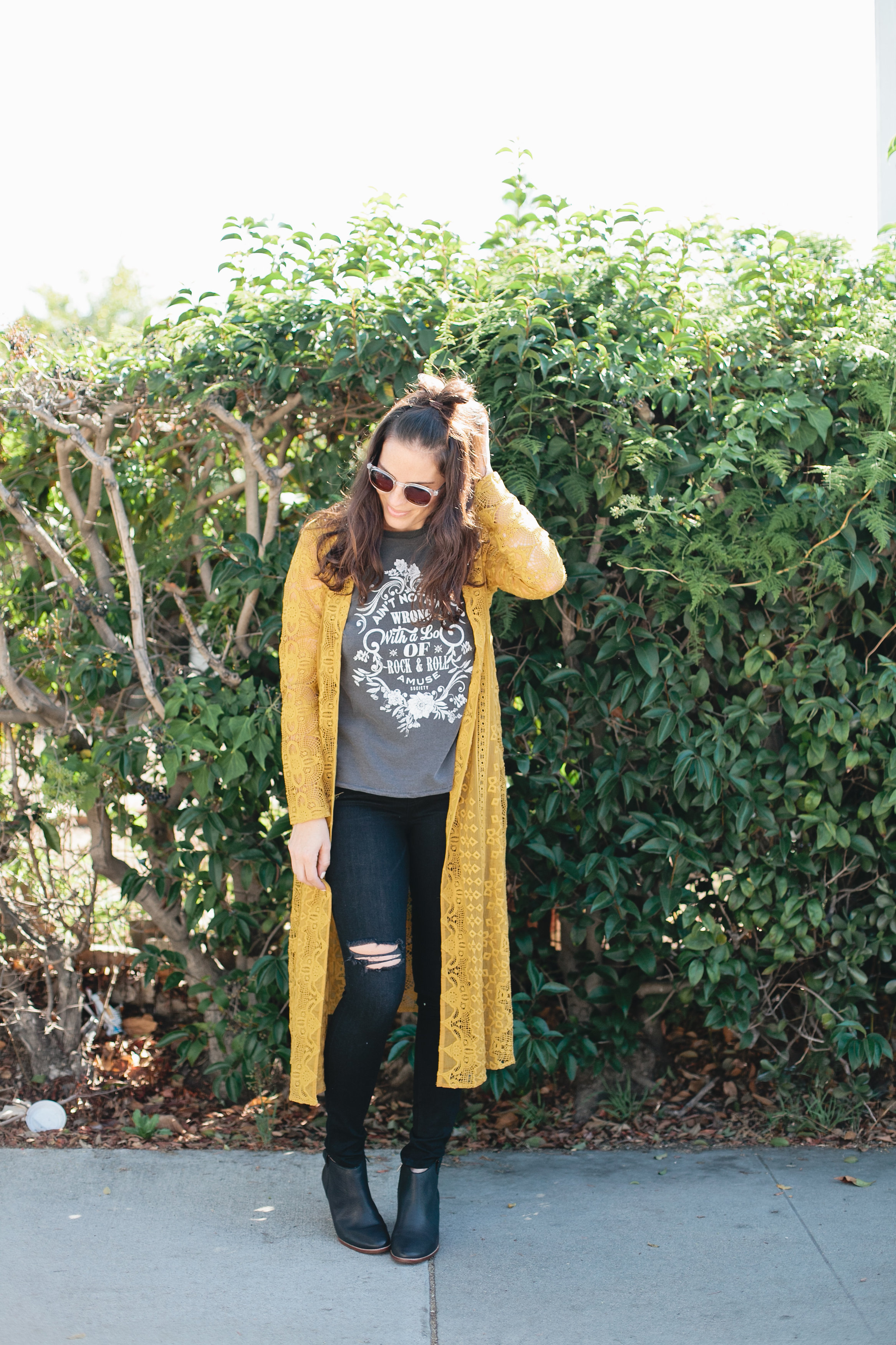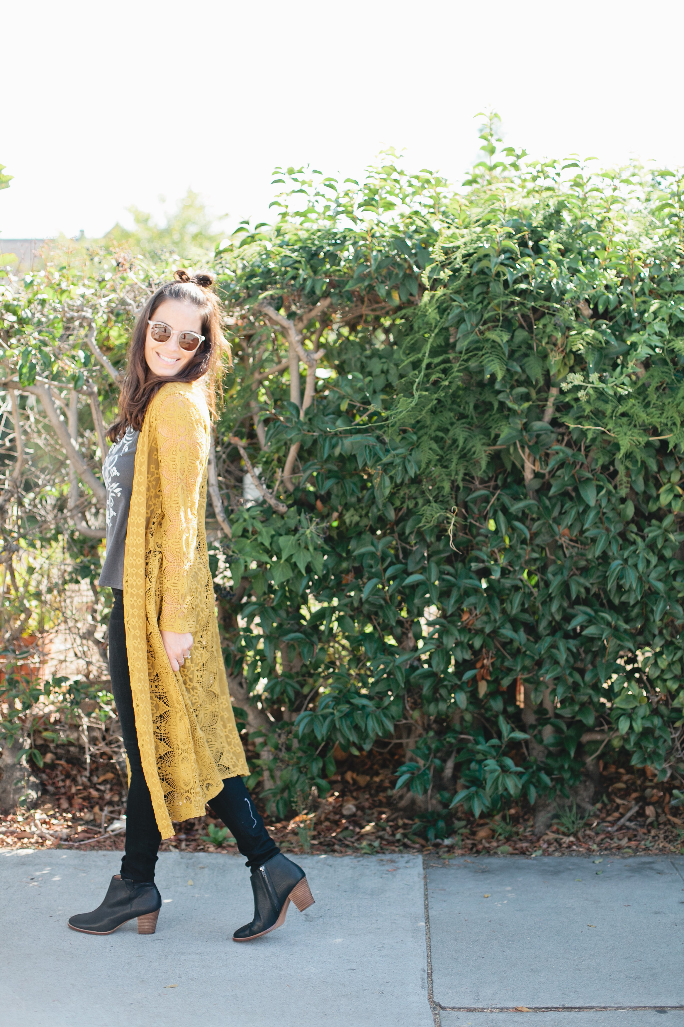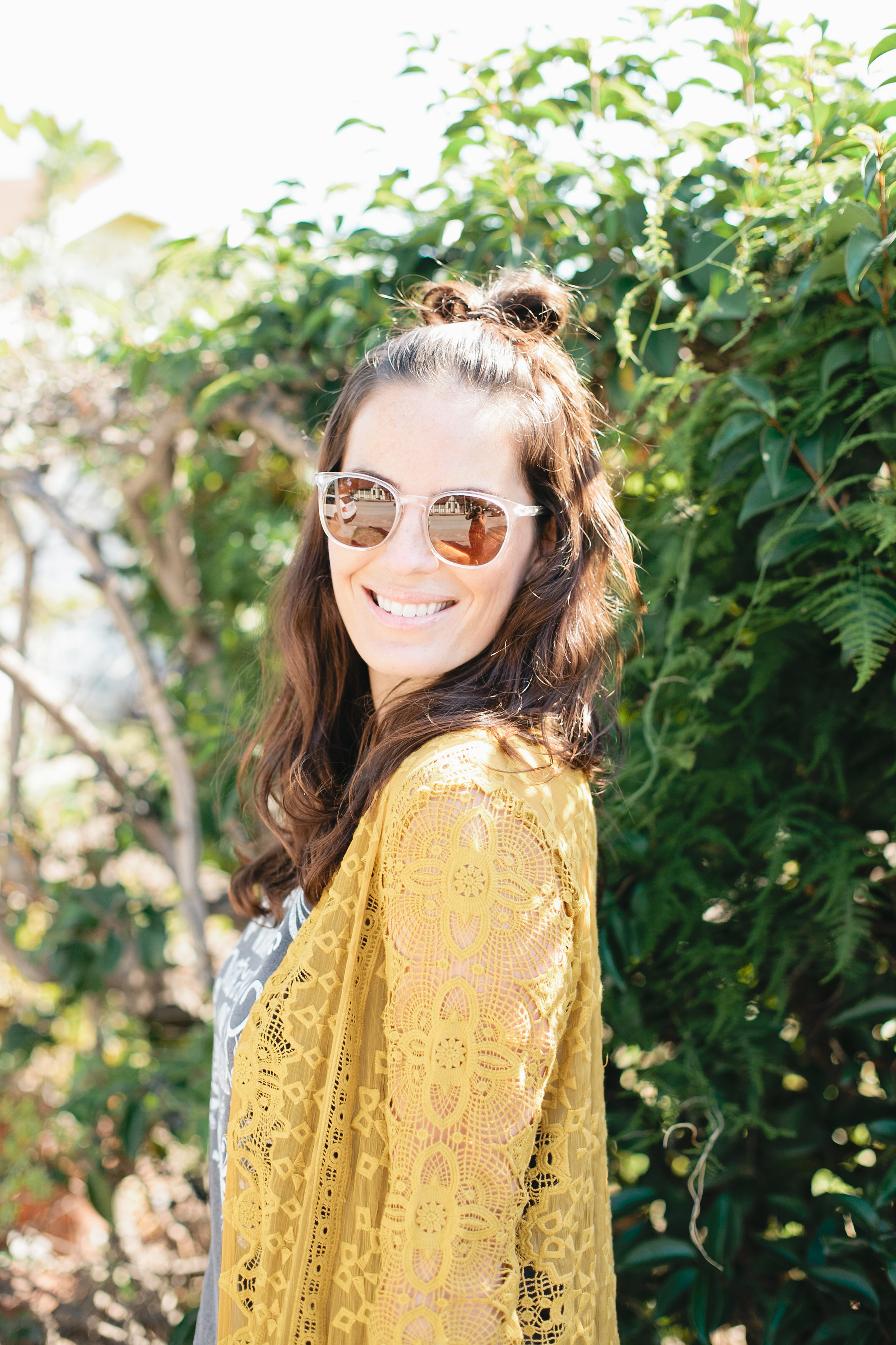 meganwelker-beijos-prism-37This next outfit is super fun because it has my favorite color… YELLOW!!!  I have always loved yellow, it reminds me of sunshine and it was also my late grandpa’s favorite, and reminds me of him.  The minute I saw this For Love & Lemons kimono on the rack I jumped for it!!  It’s seriously the last one in the shop so if it hasn’t sold yet, one of you HAVE to get it…  I also loved these high waisted black denim skinnies by Level 99… I am really feeling the high waisted as of late, especially since it helps slim down my mommy pouch… Hehe… But seriously, these are super cute, fit like a glove and I’m loving the ripped knee detail.