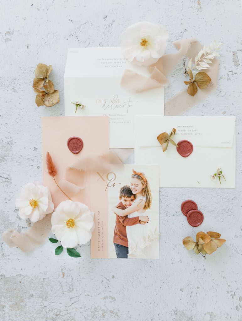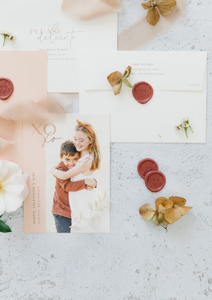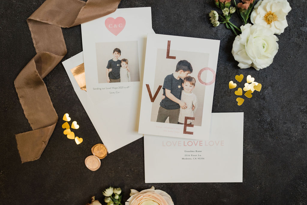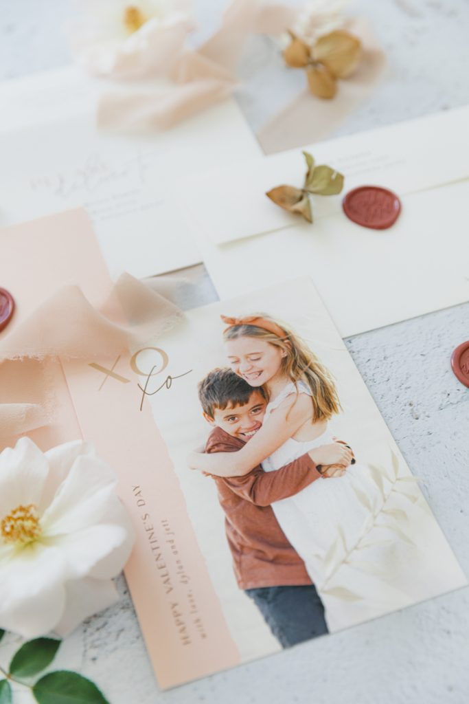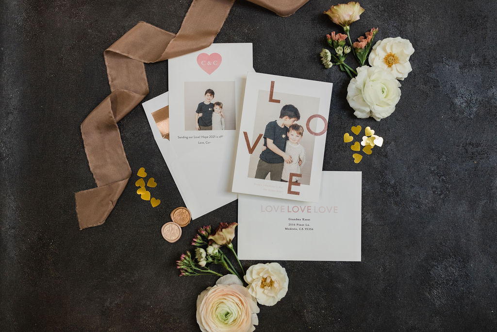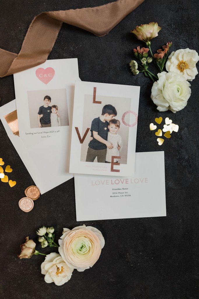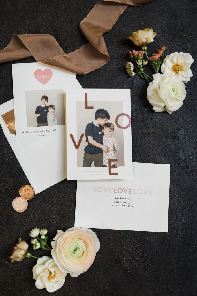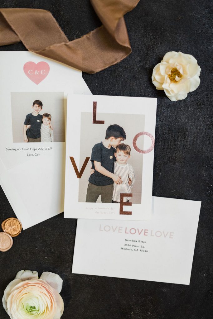 I chose the Eternal Love foil print card because I loved the modern feel, simplicity, and who doesn’t love that pretty foil detail? I did a simple photo of my boys loving each other that I know our friends and family will love! Also, I love the copper envelope liner that I added, it’s all about those little details, don’t you think? Lastly, the Artisaire “With Love” wax seals were the perfect final touch! What a great idea to make those into stickers and add some pretty in an easier way!