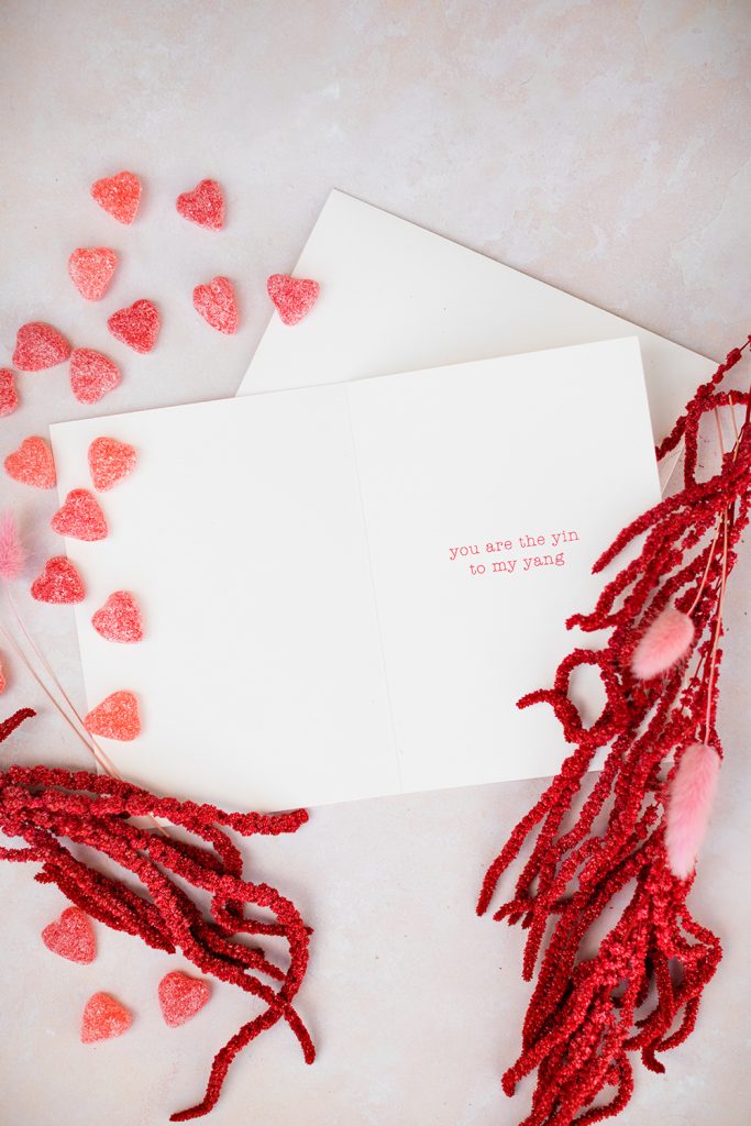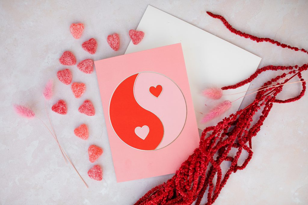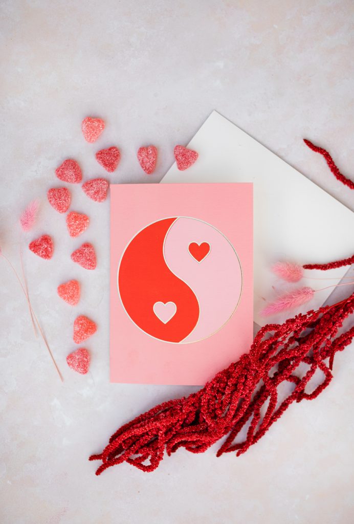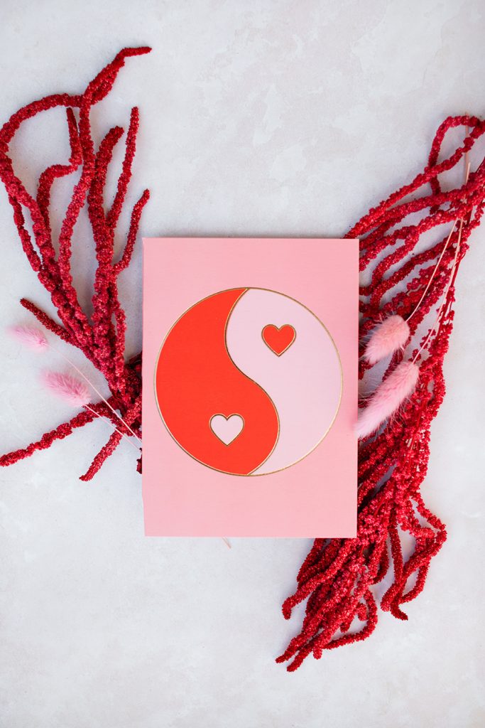 This Yin & Yang card made me smile! A little bit funky with the cutest Valentine’s Day colors of red and pink. The graphic is so fun and you always need a Yin to your Yang!!
