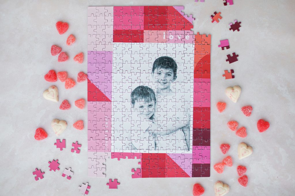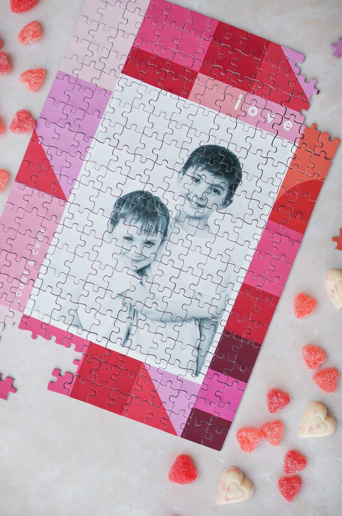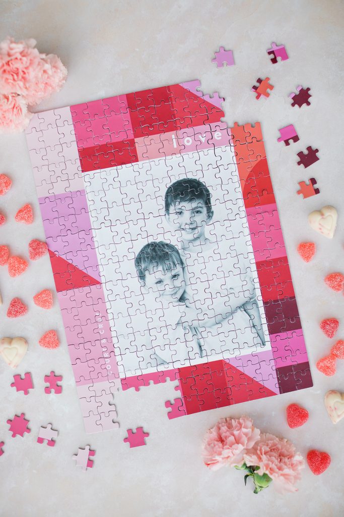 The puzzles at Minted are so fun and make for such a great gift idea! They even have ones in a heart shape now! I opted for this fun abstract Valentine’s Day print with a photo of my boys. We had so much fun putting this puzzle together with our friends. It took 4 adults + 4 kids + a lot of patience and teamwork to make this happen, haha! You should have seen all of us huddle around putting it together. It’s a fun activity and a lifelong piece you’ll have fun putting together for years to come!