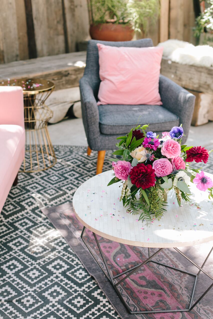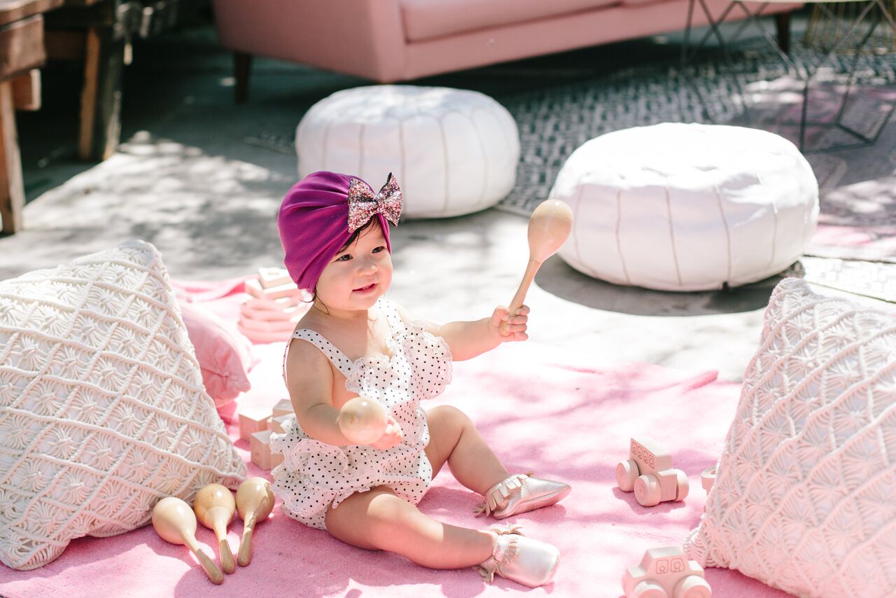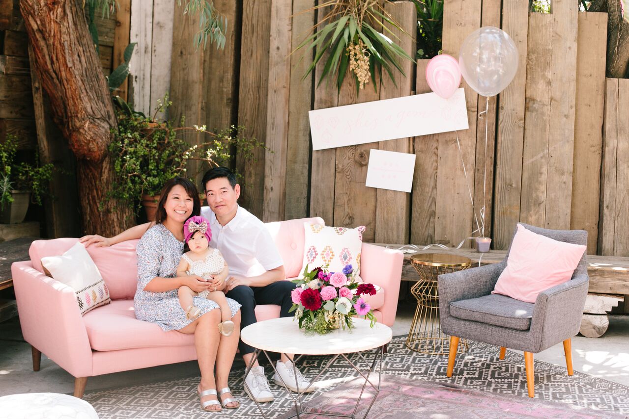 Every party needs a lounge space for people to kick back and enjoy themselves, and 1st birthdays are no exception! They are also utilized as a space for parents to relax with their little ones, hold them or even let them play on a soft space like a rug. Lucky us the venue the party was held at, The Forge in Los Angeles, has an indoor and outdoor space. Southern California weather stays warm well into the Fall so we thought the lounge would fit perfectly outside so families could enjoy some sunshine. Circa Rentals had the perfect pieces to really make this lounge pop and blend well with our overall decor with some pinks and pops of metallic! But first, how cute are our clients and baby Aveline?!