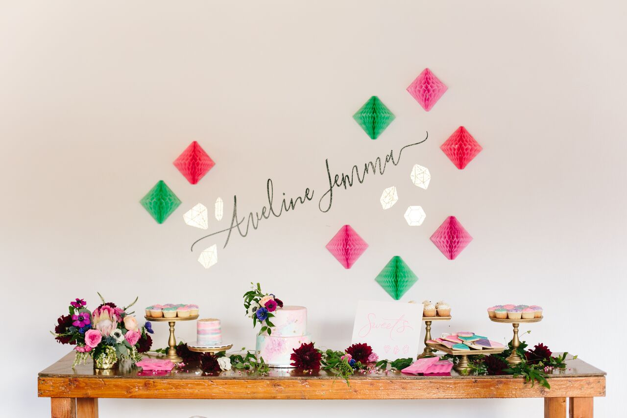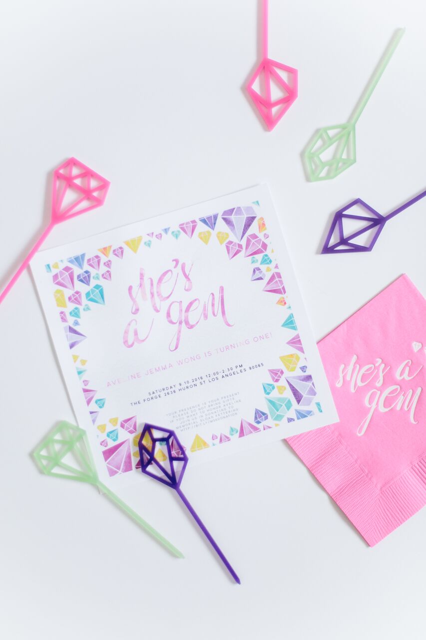 We went with gem theme as Aveline’s middle name is Jemma and that sparked some wordplay inspiration for her 1st birthday party. We opted to throw in some brighter colors on top of jewel tones as we are in Los Angeles and September here does not resonate Fall yet and actually still feels like Summer! Jacquelyn from Beijos Events came up with the most amazing details for the theme that made the party feel really special and personal. We are lovers of details!