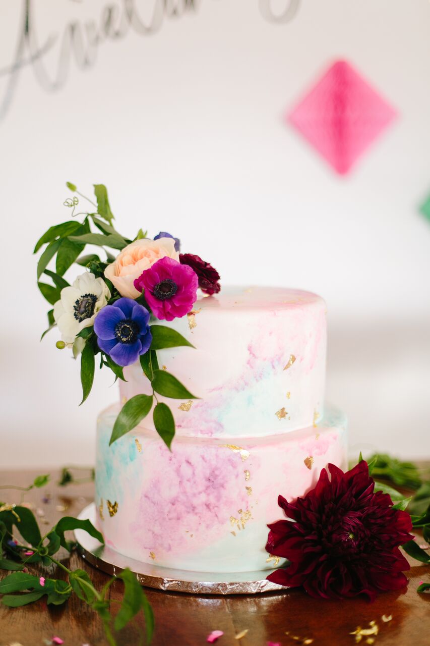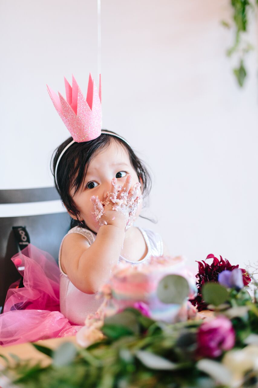 We asked our friend Sarah from SarieCakes to create these pretty watercolor cakes and super cute gem shape cookies. Aveline loves to eat and she sure did not disappoint as she ate half of her smash cake in under a minute!