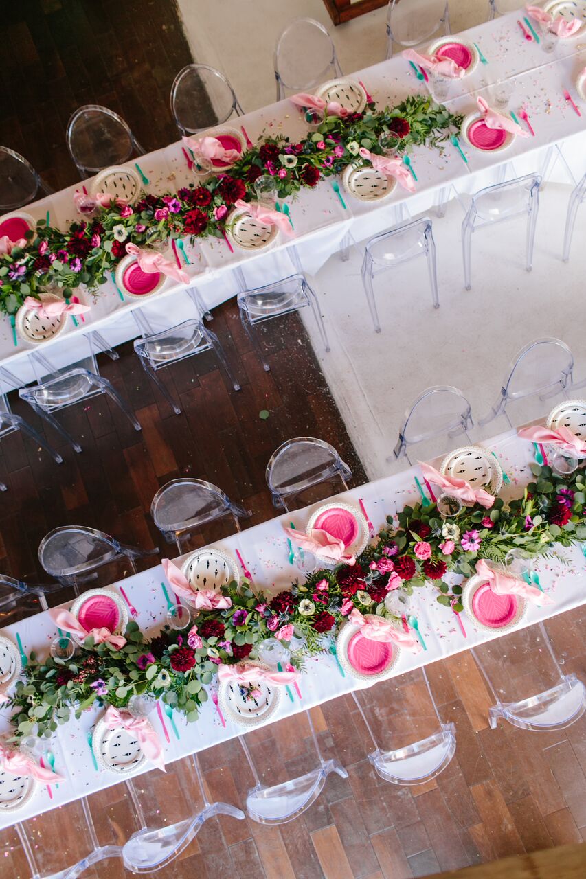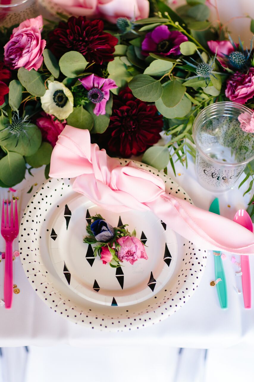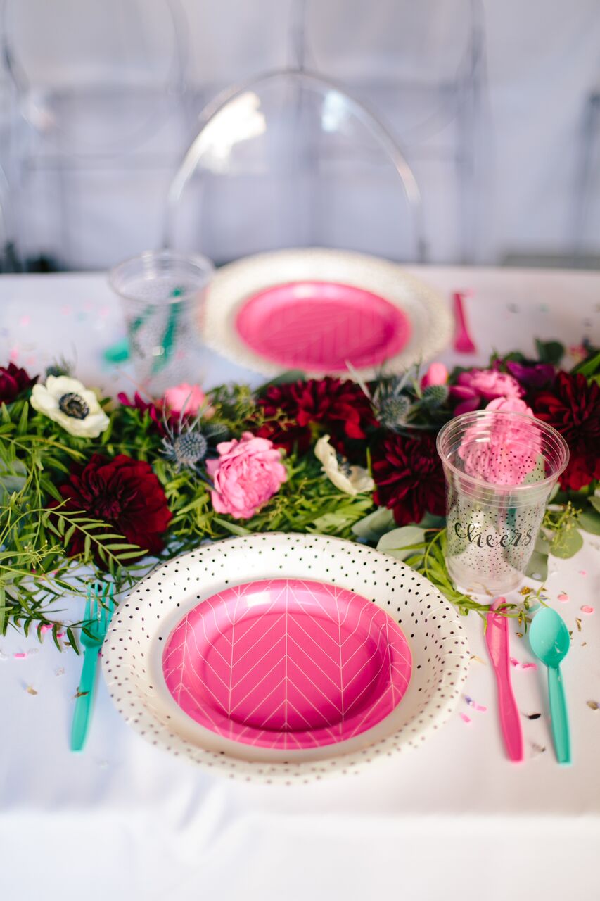 We styled the tables with Cheeky for Target by Design Love Fest’s collection of paper plates, napkins, flatware and cups. This collection is so amazing and we have used it before and we can’t recommend it enough! Not only is it cute but it’s also cost effective and practical, I mean who wants to do THAT many dishes after throwing a party?! Totally exhausting , right?! They dress up a table immediately and their design is easy to use with multiple themes… And how absolutely amazing are the florals by MV Florals?! That garland with touches of jewel toned flowers is so gorgeous, we can’t get enough!