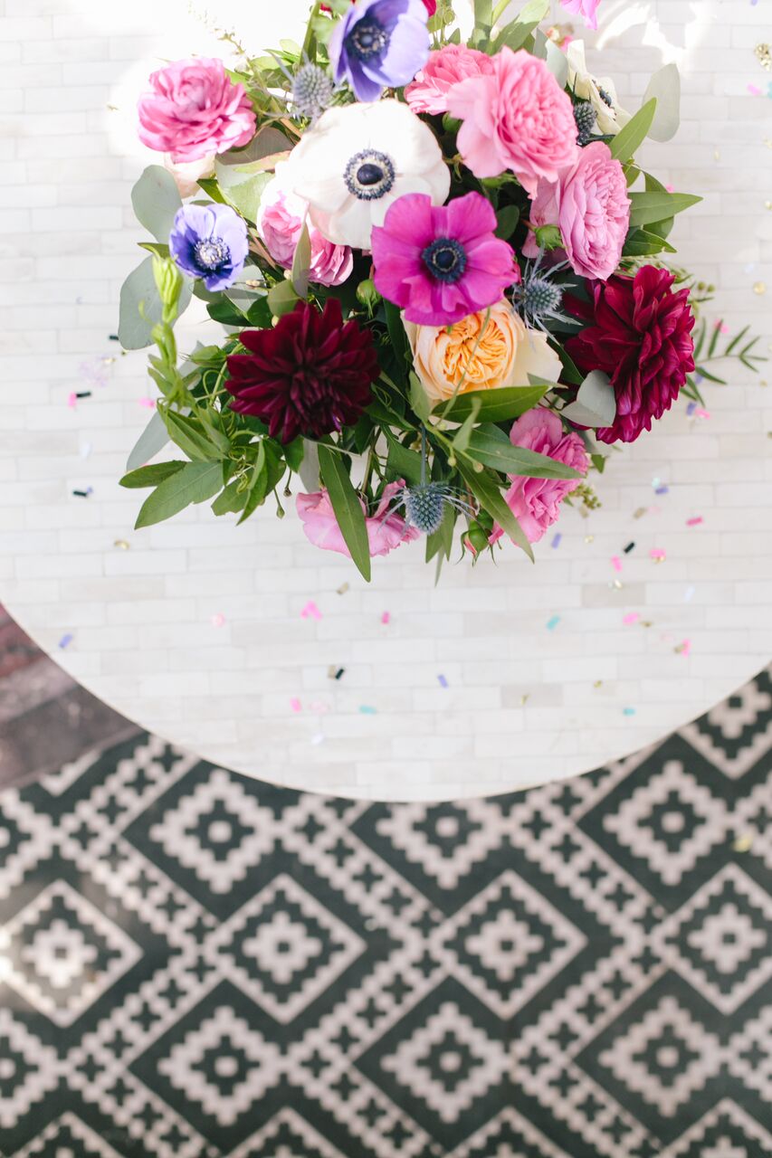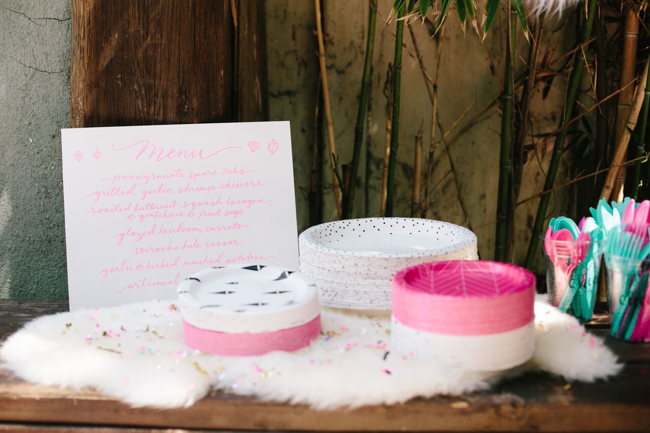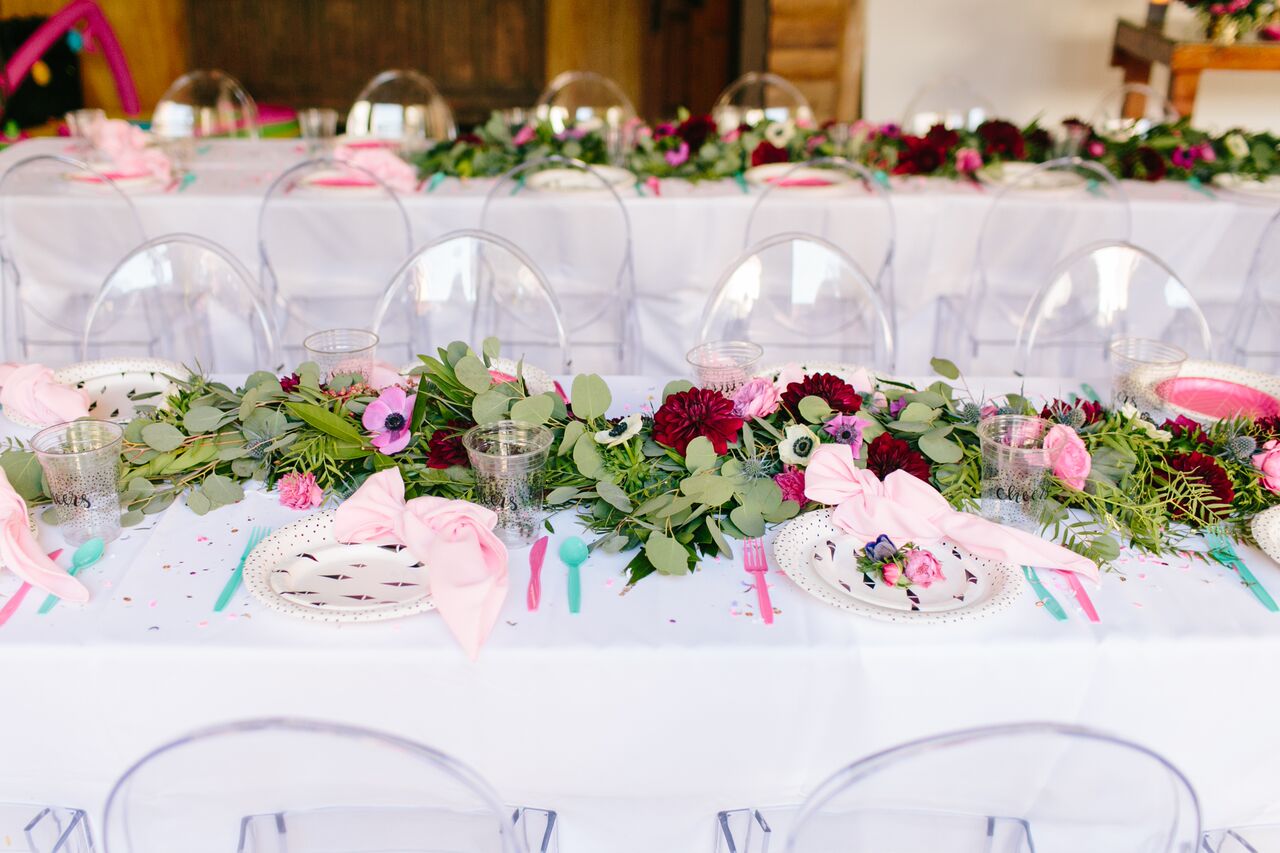 We styled the tables with Cheeky for Target by Design Love Fest’s collection of paper plates, napkins, flatware and cups. This collection is so amazing and we have used it before and we can’t recommend it enough! Not only is it cute but it’s also cost effective and practical, I mean who wants to do THAT many dishes after throwing a party?! Totally exhausting , right?! They dress up a table immediately and their design is easy to use with multiple themes… And how absolutely amazing are the florals by MV Florals?! That garland with touches of jewel toned flowers is so gorgeous, we can’t get enough!