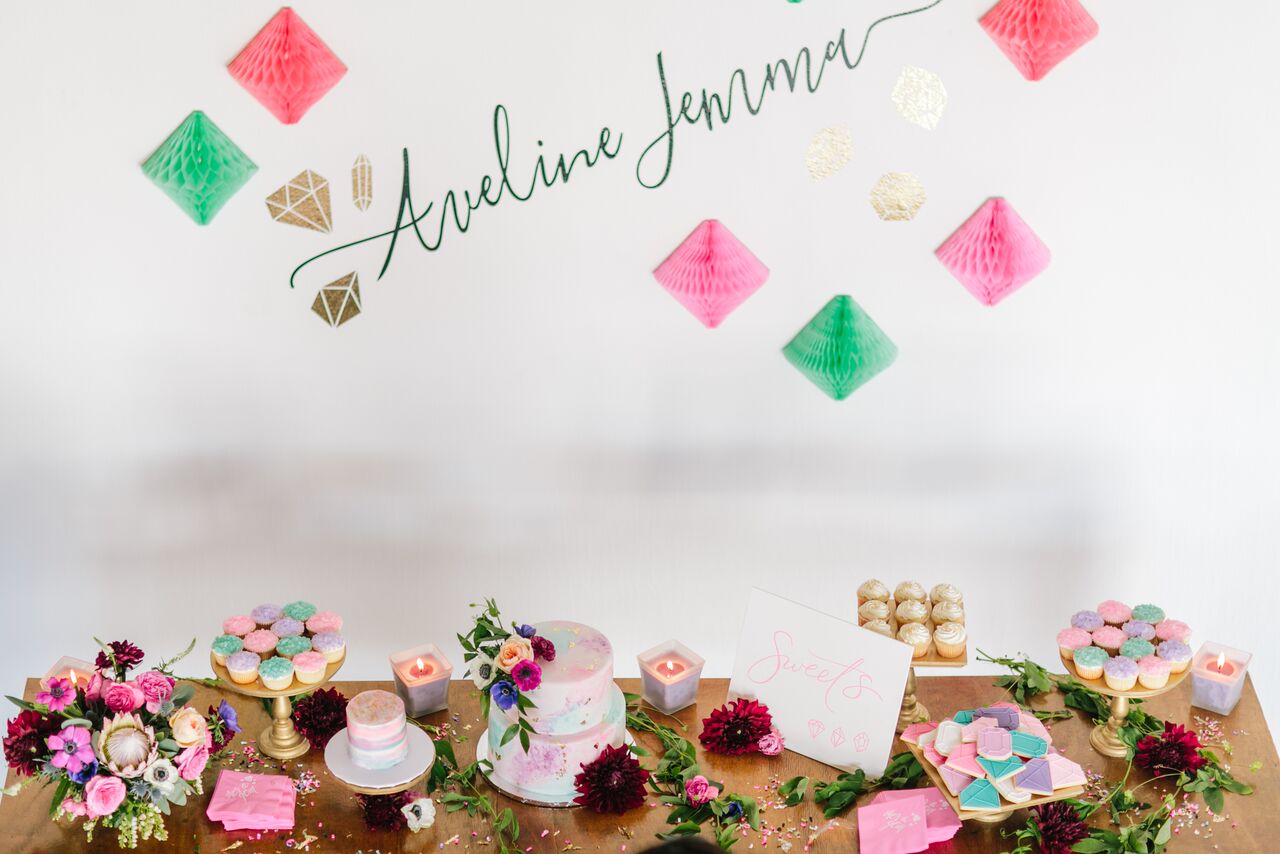 Us Beijos ladies have become quite accustom to planning and designing 1st birthday parties and quite frankly, we love it! First of all, our clients have the absolute cutest babies and secondly, we love celebrating something so fun and memorable with them. Plus, each party is so unique and different with their themes that we get to play and really get creative which is extra fun! This one was easy because Aveline’s mama Misherr was so sweet and gave us a new theme we had never tackled before – a she’s a gem 1st birthday party that we know you will love! This party is also featured on 100LayerCakelet today and you just can’t miss it! Keep scrolling here to see all of the gorgeous photos from Heather Kincaid and all of the fun details that made this party shine!