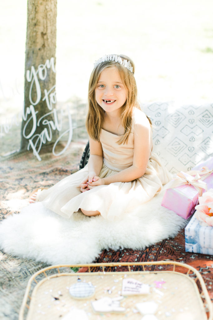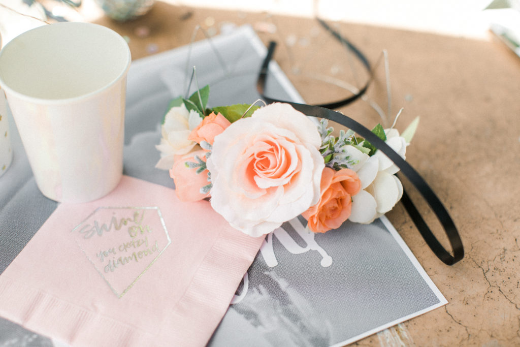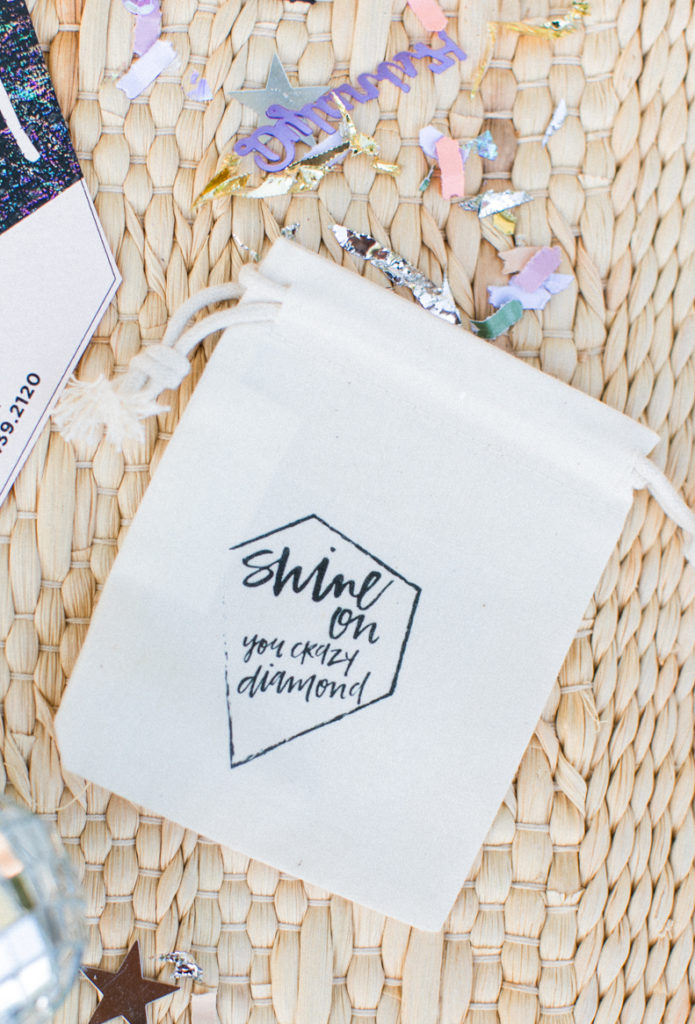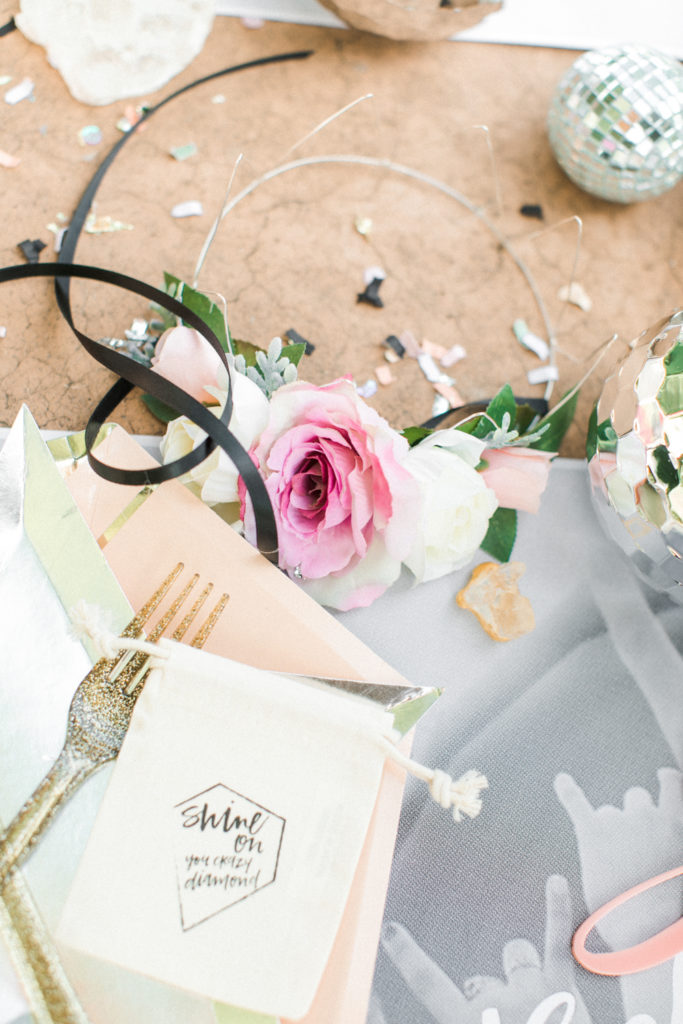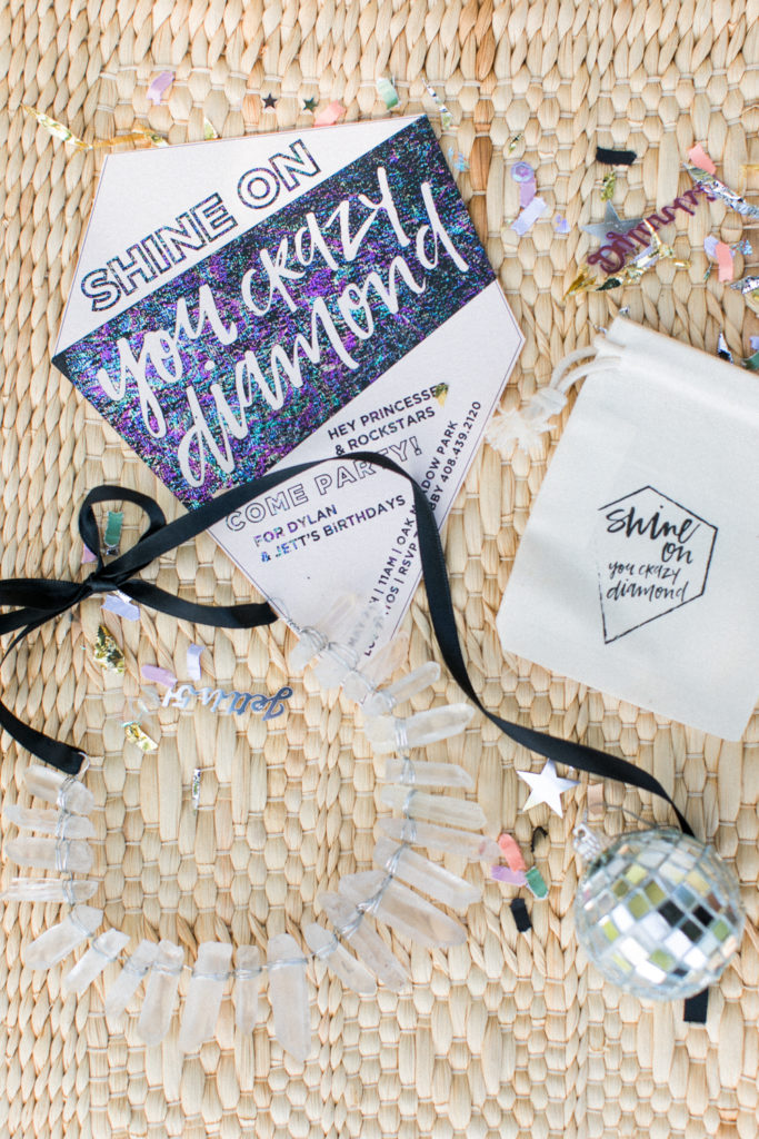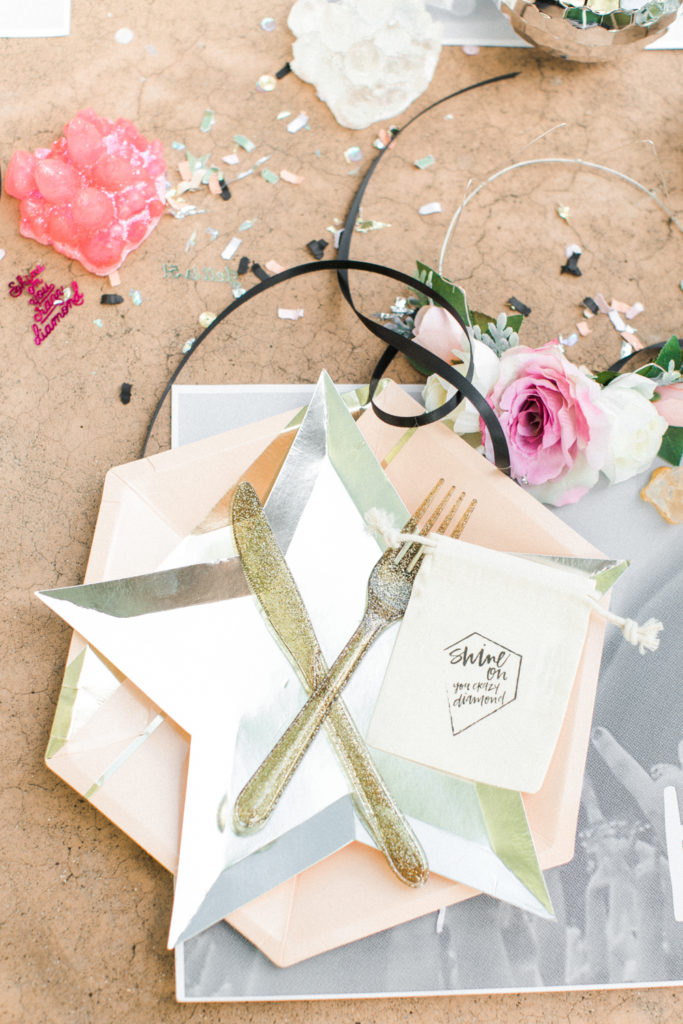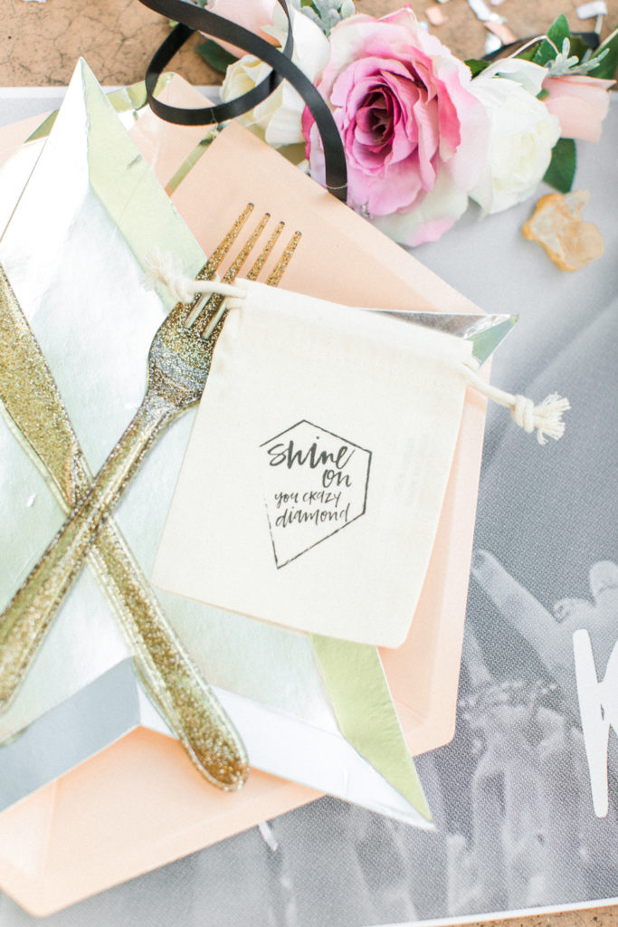 Beau-Coup is a great resource for party goods. I love that you can do custom work on a ton of items. I had them create “Shine on You Crazy Diamond” napkins, cups, and favor bags for each place setting. They even carry the brand Meri Meri partyware which I adore. This was a great resource for a kids party. I did a mix of metallics and blush for the plates and paper cups. Its fun to mix up the plates at each place setting.