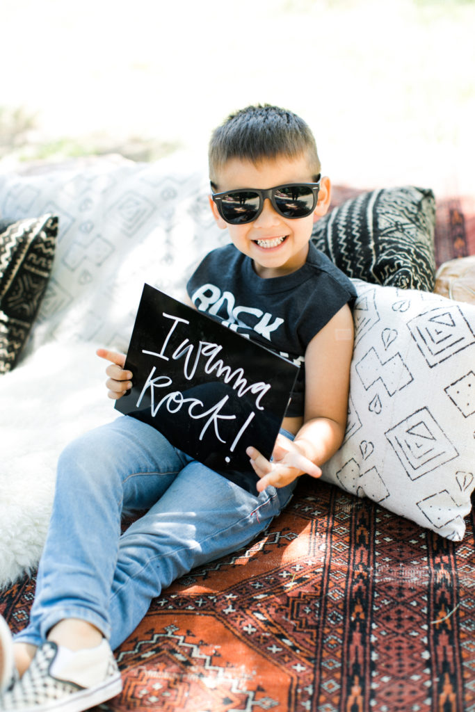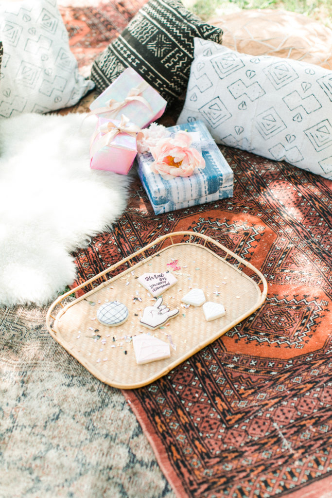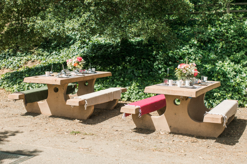 The Confetti Bar made custom confetti that had pieces like, “shine in your crazy diamond,” “ Dylan is 7”, “Jett is 5”, and “Rock On!”. Lucitini Cakes makes these SUPER cute gemstone sugar candies that we used on the table as a rad detail and on Dylan’s cake. These were a hit with the kids! The parent’s not so sure after I sent them home with rock sugar. Sorry! All these fun details were placed on these cool concrete park picnic tables. Gunn & Swain blankets at each table setting to give a little soft cushion, and of course, add a cool factor.