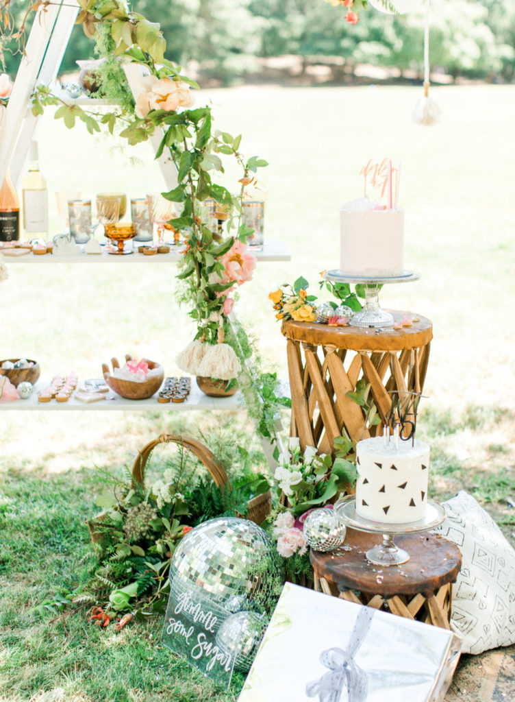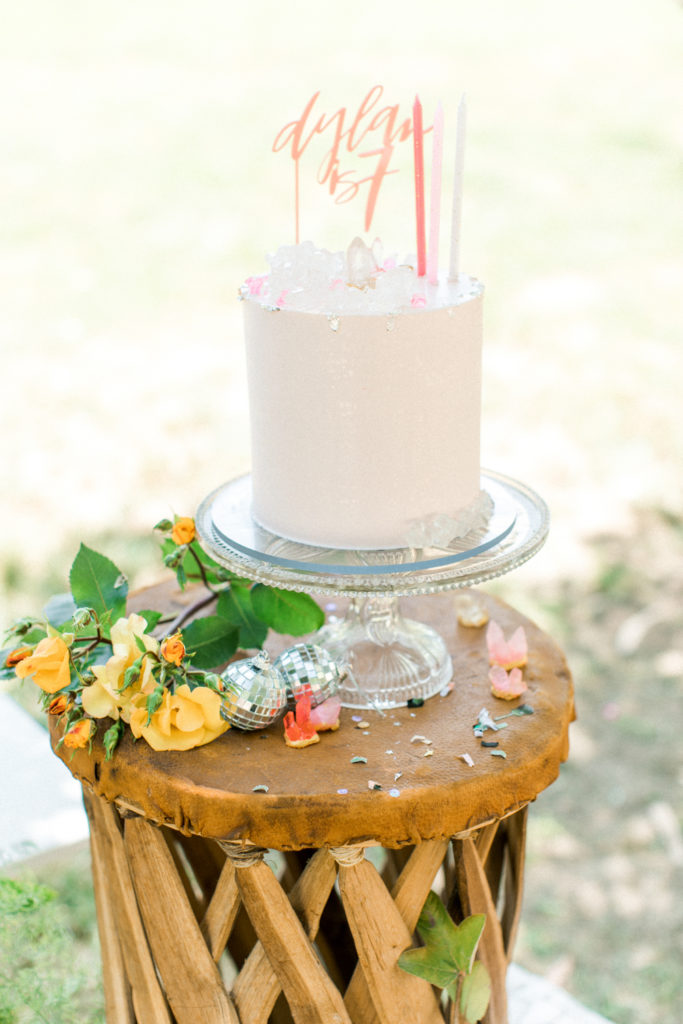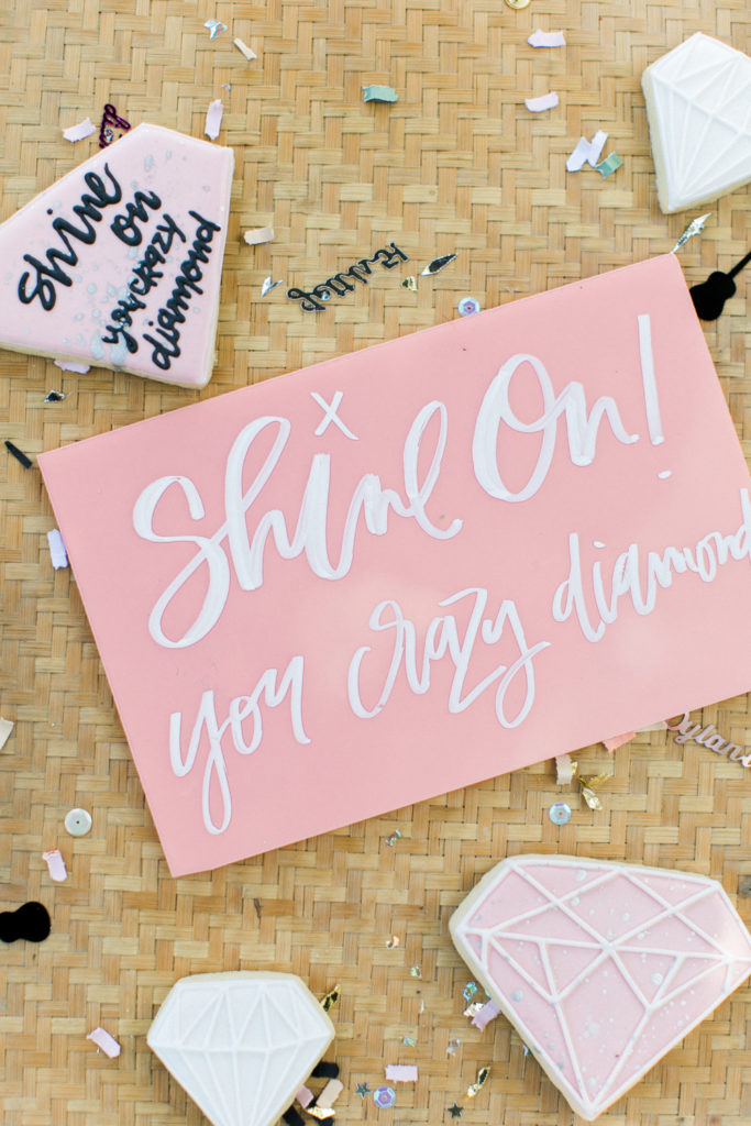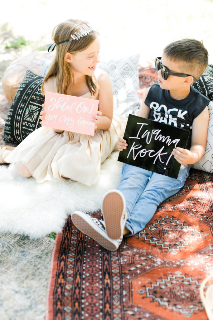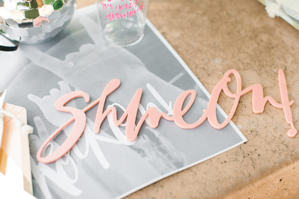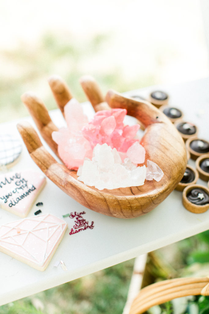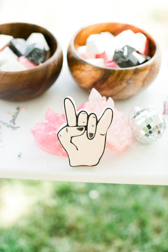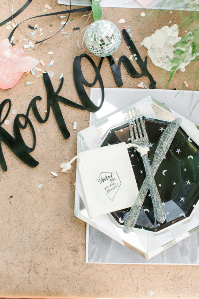 The invite is probably one of my favorite parts of this party. My talented pal, Meghann Miniello designed this holographic gem invite. On blush paper with black holographic, it couldn’t had come out any cooler. She is amazing as I can give her a couple ideas, and she always surpasses my expectations. She also created acrylic signage that was among the party, and the cutest cake toppers for each kids cake. Her handwriting is on all the custom tableware too!