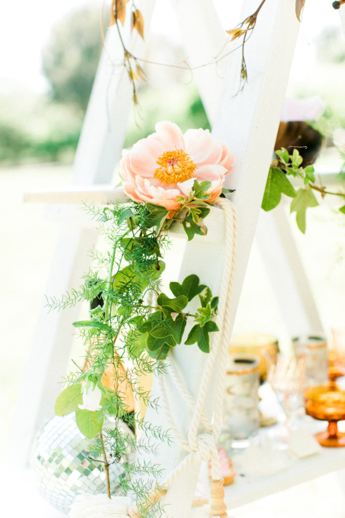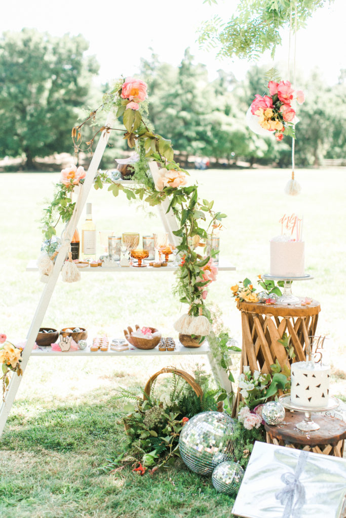 We had this party at a park in Los Gatos, where there are so many pretty trees among the tables. I had this vision to have hanging dessert shelves in the trees with greenery and flowers hanging from them. One tiny problem, the trees were way to thin, the limbs would break in a heart beat. So the night before, my dad and I went to Lowes. About an hour later, he whipped up this ladder shelf. He wouldn’t let my dreams be crushed, or maybe it was the sad face I made. Either way, he was there and made it happen right then and there.