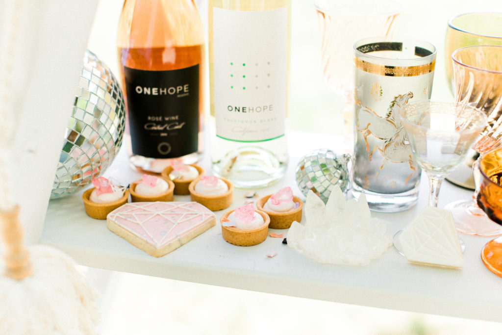 Having a shared party with a sibling, you gotta have two cakes. I mean what kid would be ok with sharing their cake with their sister or brother and taking turns blowing out the candles? Plus, I think it just makes it special for each of them to have something of their own. Hilary from Sugar Studio whipped up these yummy cakes and treats. From gem stone chocolates to tiny little tarts, and of course those cakes. Heart eyes all around. Too add into the mix, Nancy from I Dream of Cookies created these princess and Rockstar cookies that literally put the cherry on top to this dessert shelf. More of those sugar gem rocks from Lucitini Cakes sprinkled in. A little One Hope Wine for the adults with their desserts.