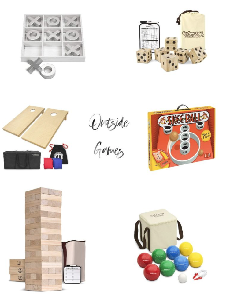 tic tac toe game board | wooden playing dice | cornhole set | skee ball | giant outdoor jenga | backyard bocce ball set