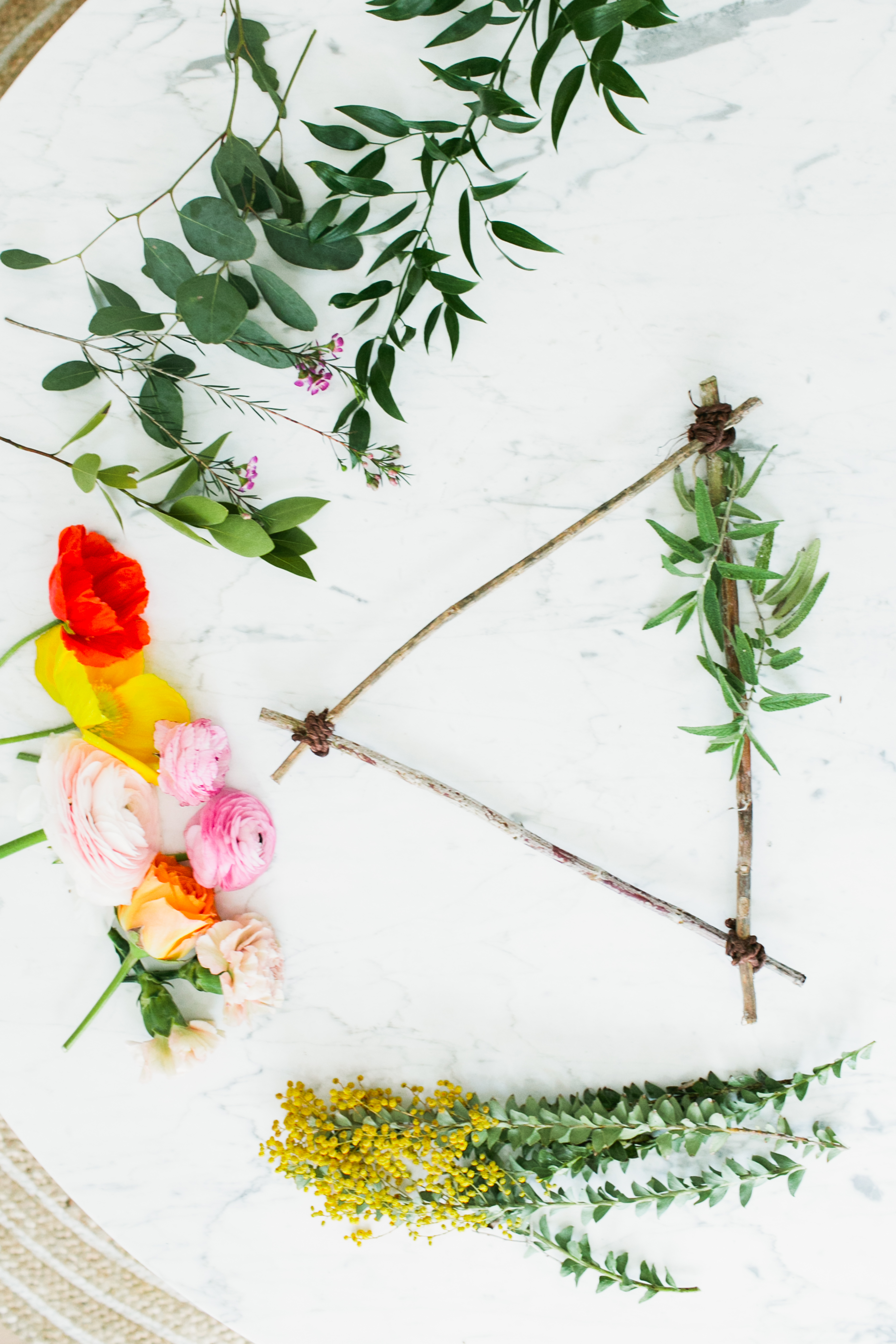 To create this springtime DIY, start with 3 sturdy branches (we found ours just in the front yard!). Use twine wire to secure the ends together to make a triangle shape. Once we decided on the top and bottom of the wreath, we added our greenery, such as acacia, italian ruscus, and laurel, to various areas using floral wire.