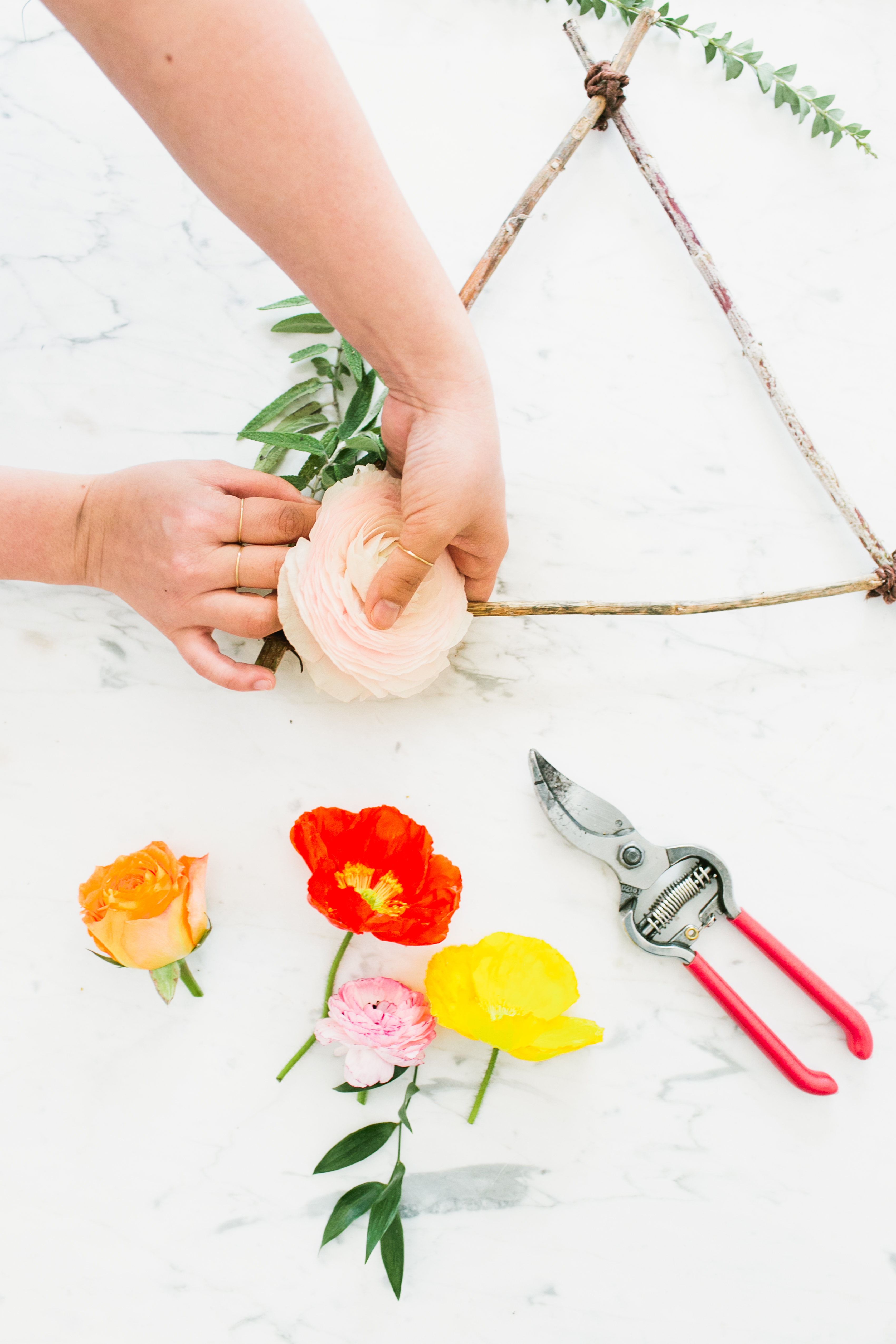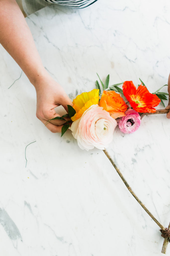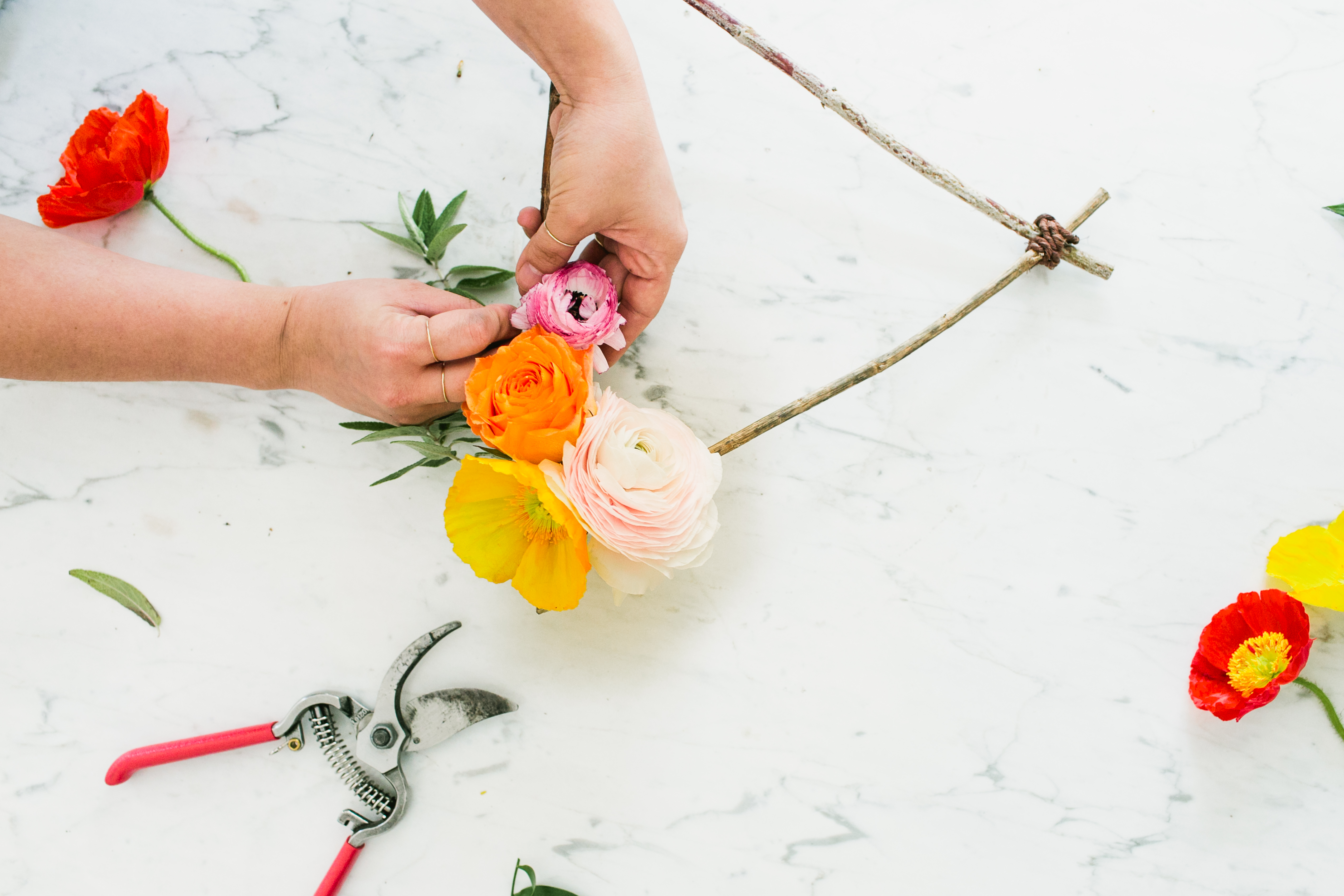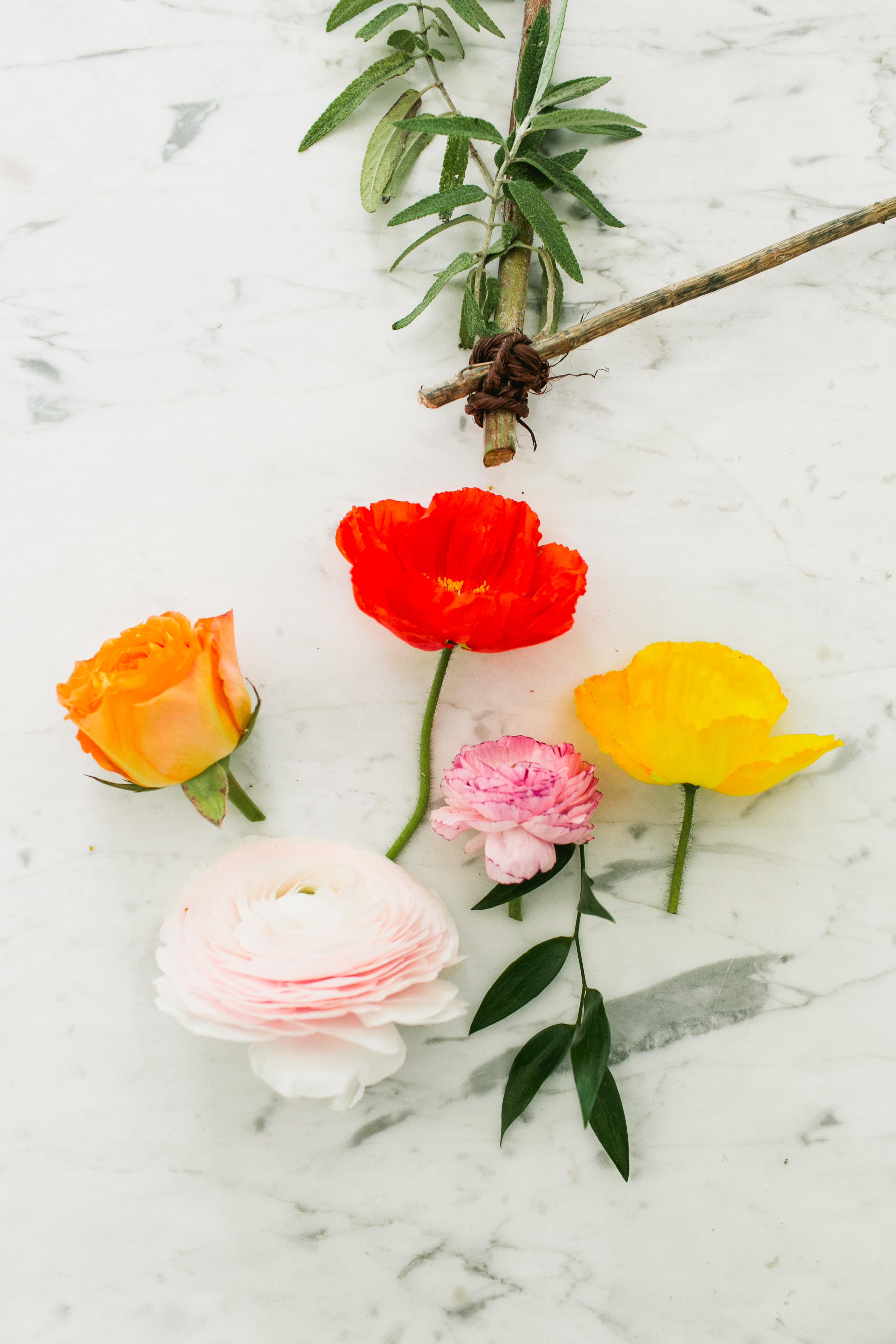 Now it’s time to pick your favorite blooms and get creative! We like to work in odd numbers, so we set aside 3 blooms for the top and 5 blooms for the bottom right. Some flowers we used for this DIY were poppies, ranunculus, and garden roses, but any of your favorites will do!