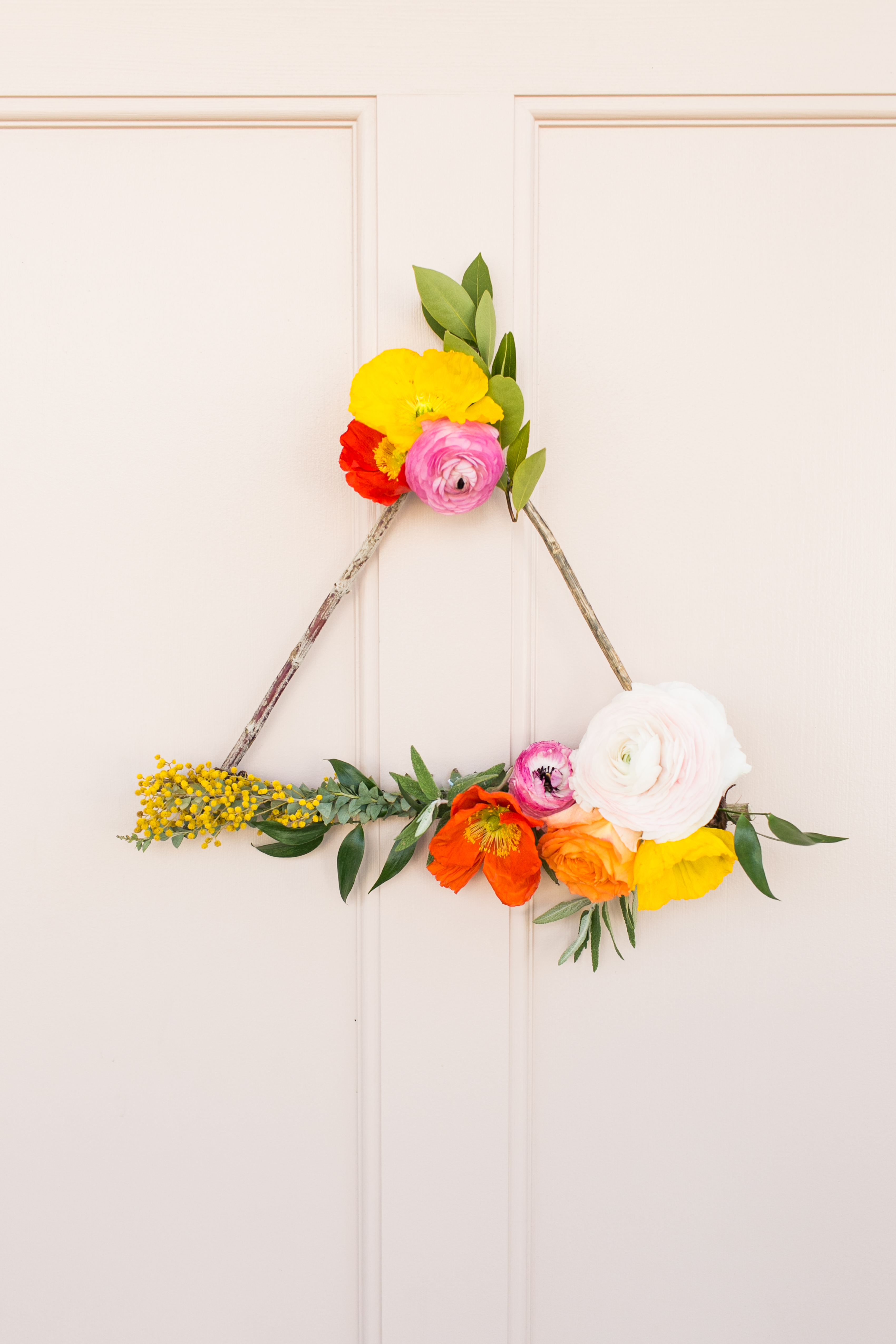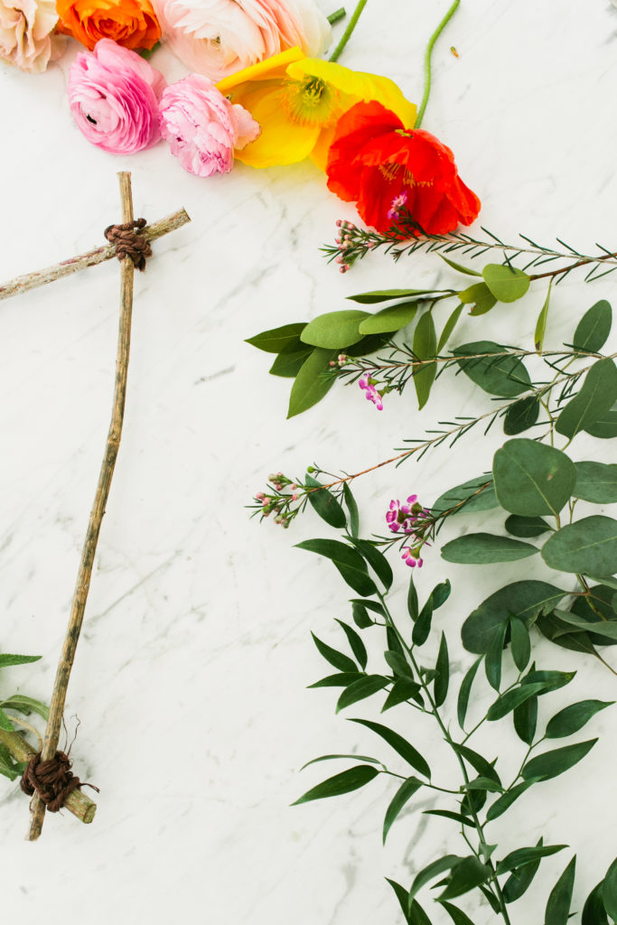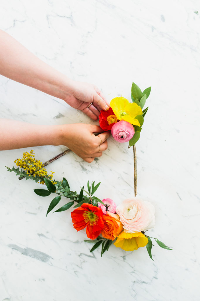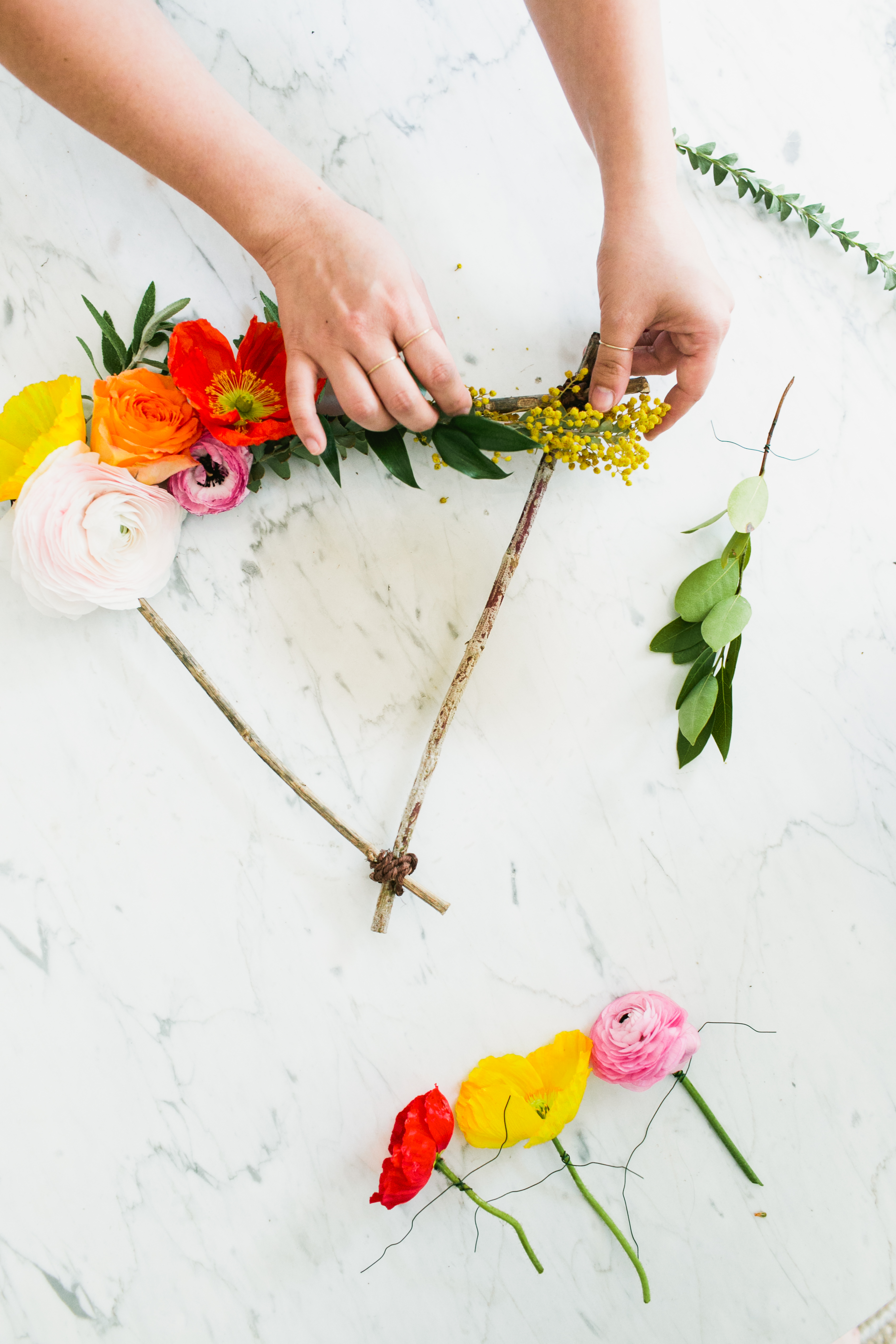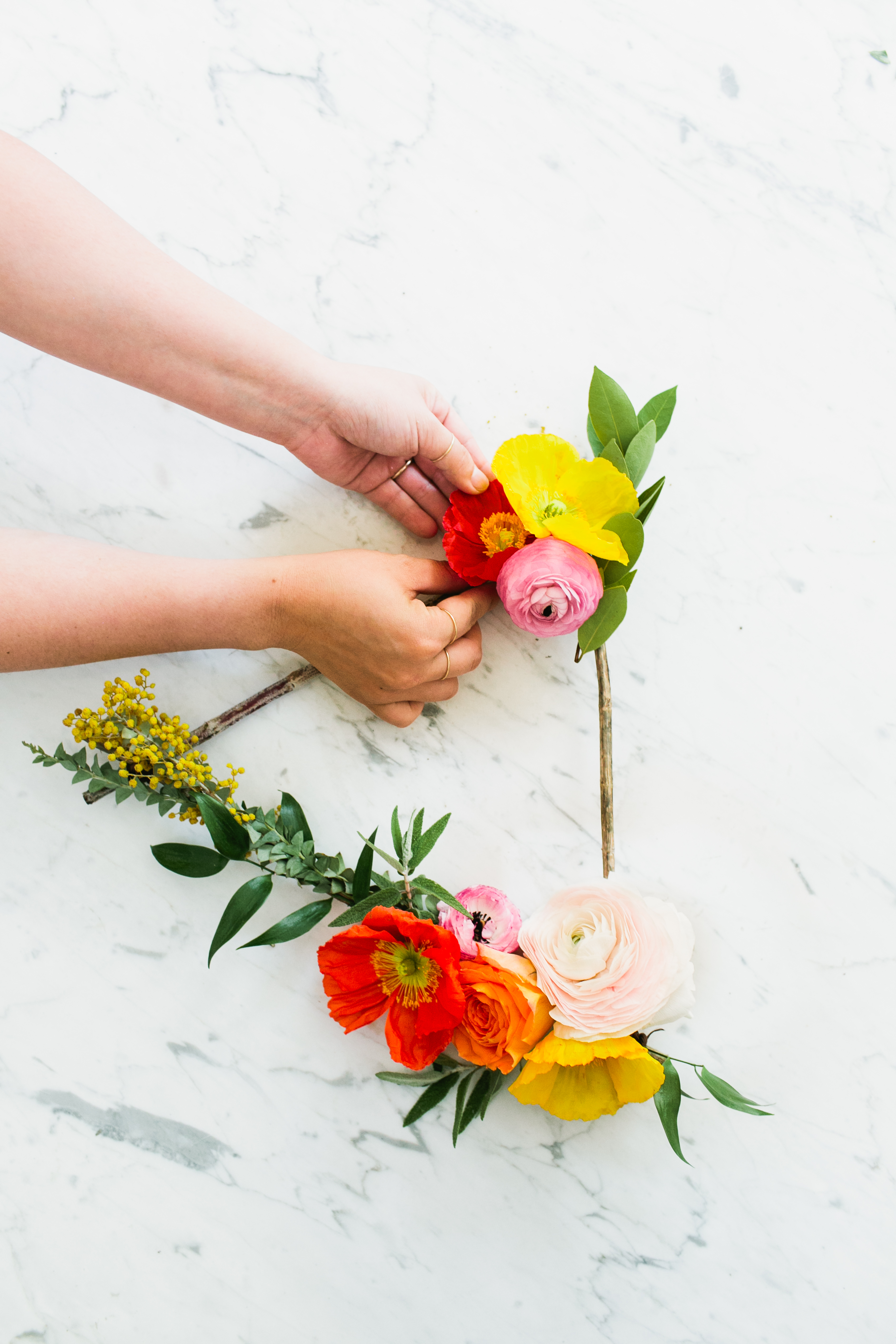 Now it’s time to pick your favorite blooms and get creative! We like to work in odd numbers, so we set aside 3 blooms for the top and 5 blooms for the bottom right. Some flowers we used for this DIY were poppies, ranunculus, and garden roses, but any of your favorites will do!