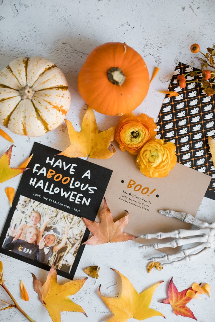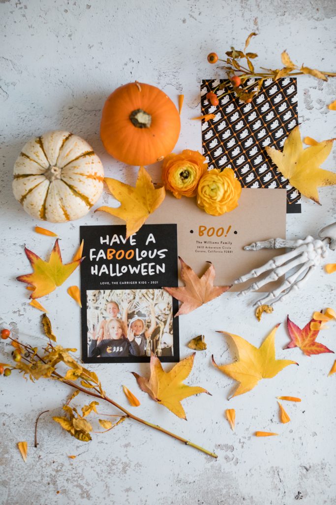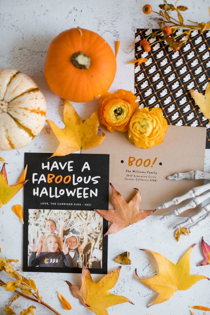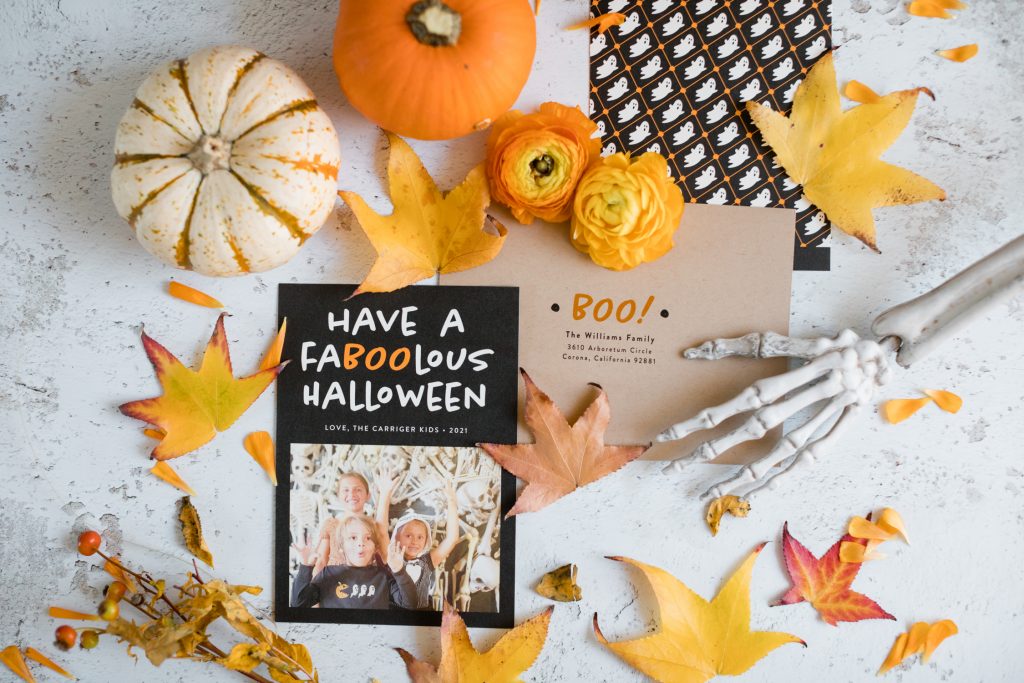 Leah took her three littles to an Orange County festive treasure – Roger’s Gardens! They always have the best set ups for the holidays, and Halloween is usually the most amazing one! Tied with Christmas I’d say. They got dressed in their Halloween attire and headed over and found this amazing skull wall! She knew this was the perfect spot to capture them for their Halloween card, and it just proves you don’t always need professional photos for these cards! Memories being made in the moment is much more important than a posed photo! Cheers to all of the festive fun Fall brings and this Fa-BOO-lous card!!