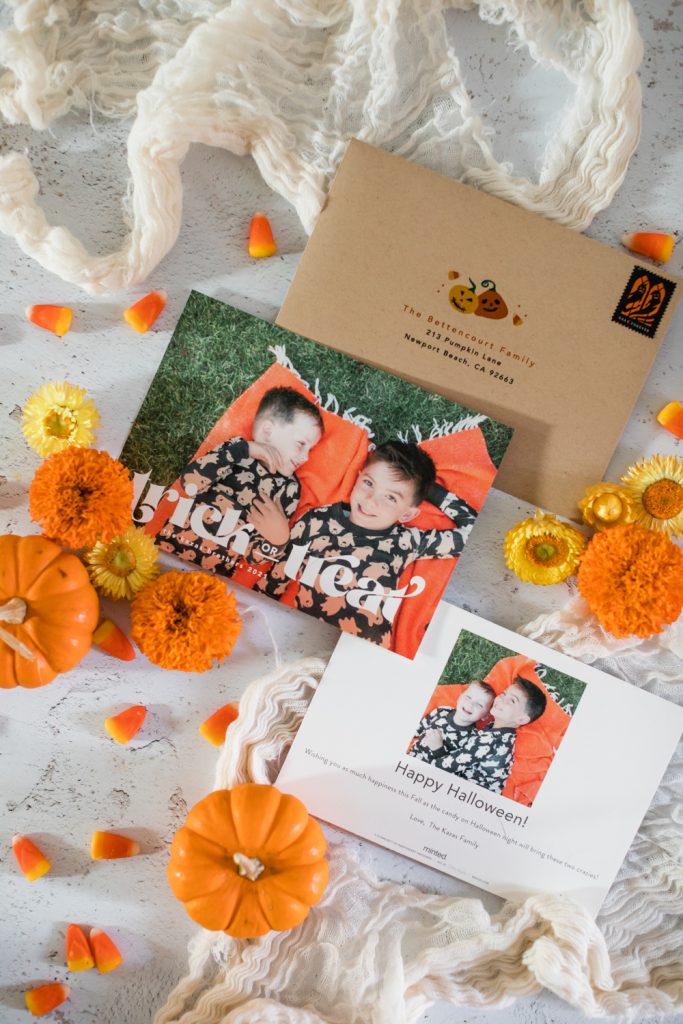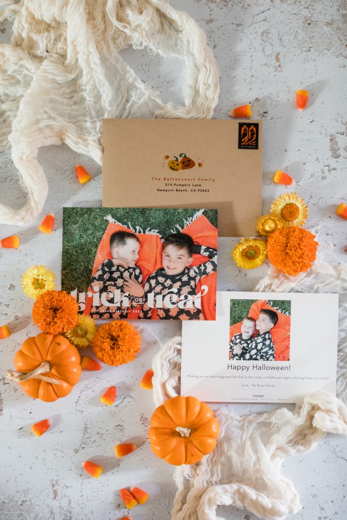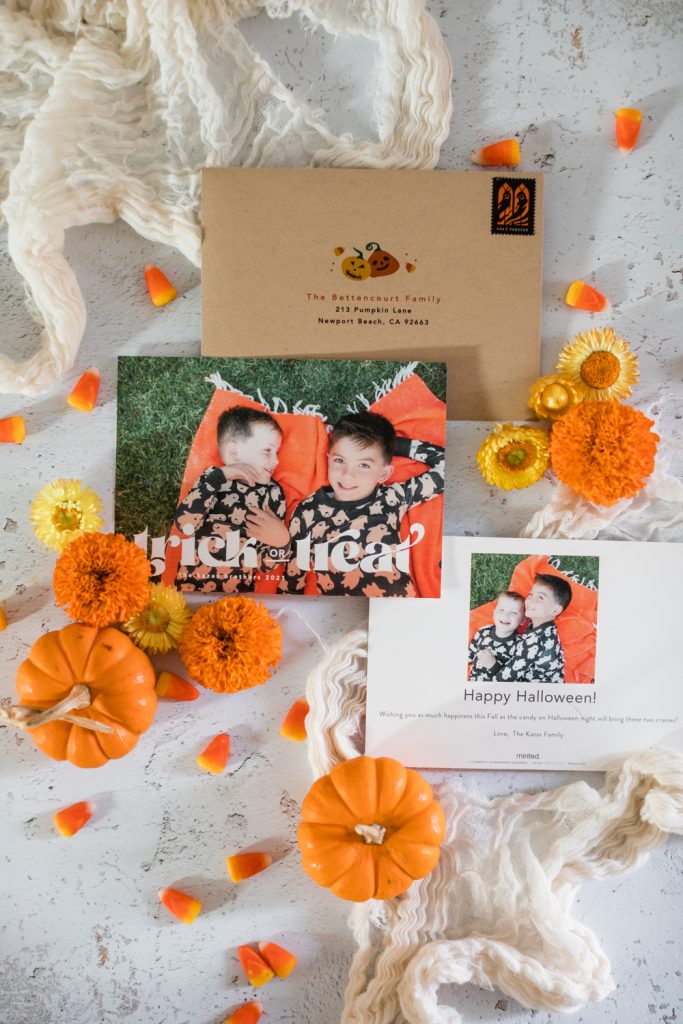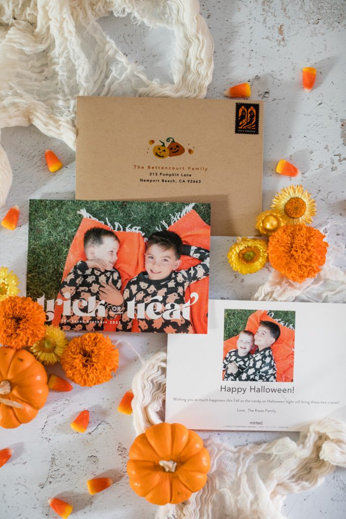 I love the idea of sending seasonal cheer to your friends and family, Halloween of course included! It’s my boy’s favorite holiday and we go all out at our house. All month we are doing fun Halloween outings or activities, so of course, we had to share the love!! Every year I get my boys matching Halloween pajamas, and since they are getting bigger and this probably won’t last forever, I decided to capture them in this year’s set. When choosing my card the font on this one really caught my eye, I love it!! I know our friends & family will love receiving this card and it will put smiles on their faces knowing these boys are living their best lives on Halloween!