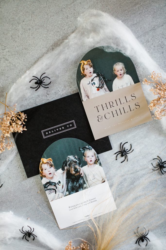 Alison chose this spooky Thrills & Chills card and I love the modern cut and neutral tones to it! She dressed her three girls up in their spookiest attire – Olivia, Penny, and their new pup Matilda! I’m loving the scared and spooked faces they made for their cards, they gave me a good chuckle! And I think it will do the same to for their family and friends. Who wouldn’t want to see two of the cutest little ladies in top comedic form?! This is one for the memory books for sure!!