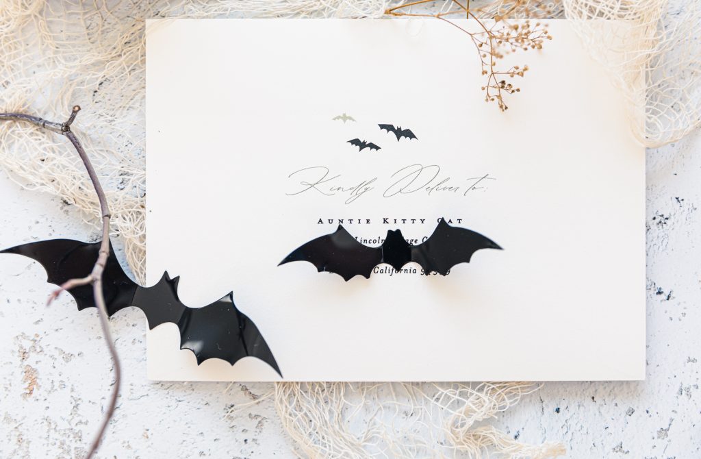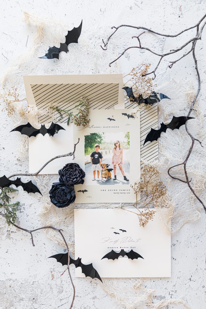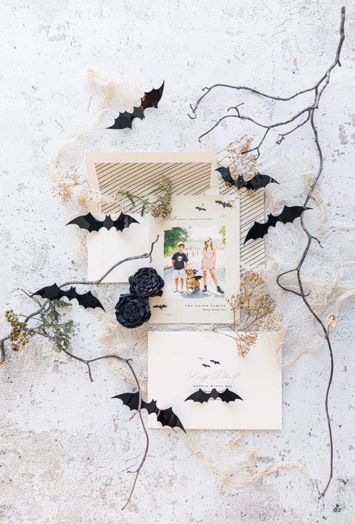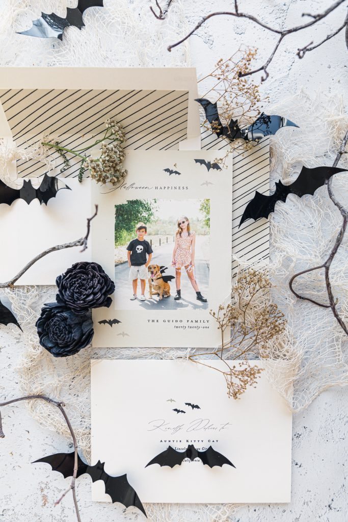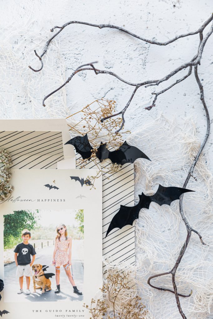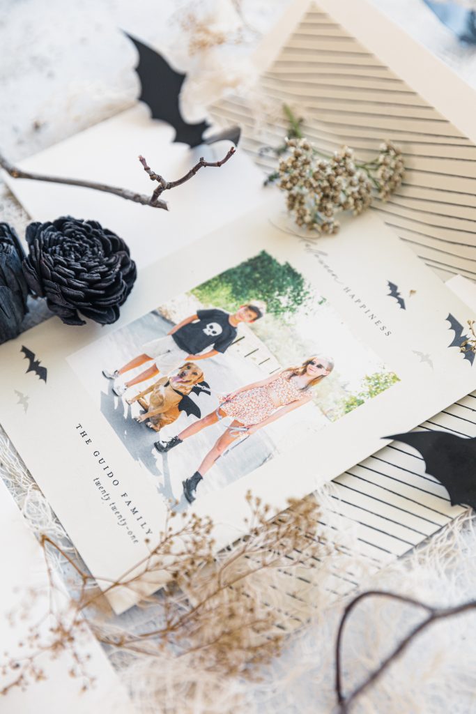 Halloween cards mailed to family and friends have become my favorite over Christmas. Did I hear a gasp? In my defense, it’s the 1st holiday of the holiday trio months, and well, it’s Halloween; I love it all! Being a bit away from family and friends, sending cards is a great way to show your love for them. This year, we were all about the bat theme, from Dylan’s sunnies to Penny’s bat wings. This outdoor scene paired perfectly with the my card I picked this year, the Halloween Happiness. To go the extra mile, include some bats inside your card.
