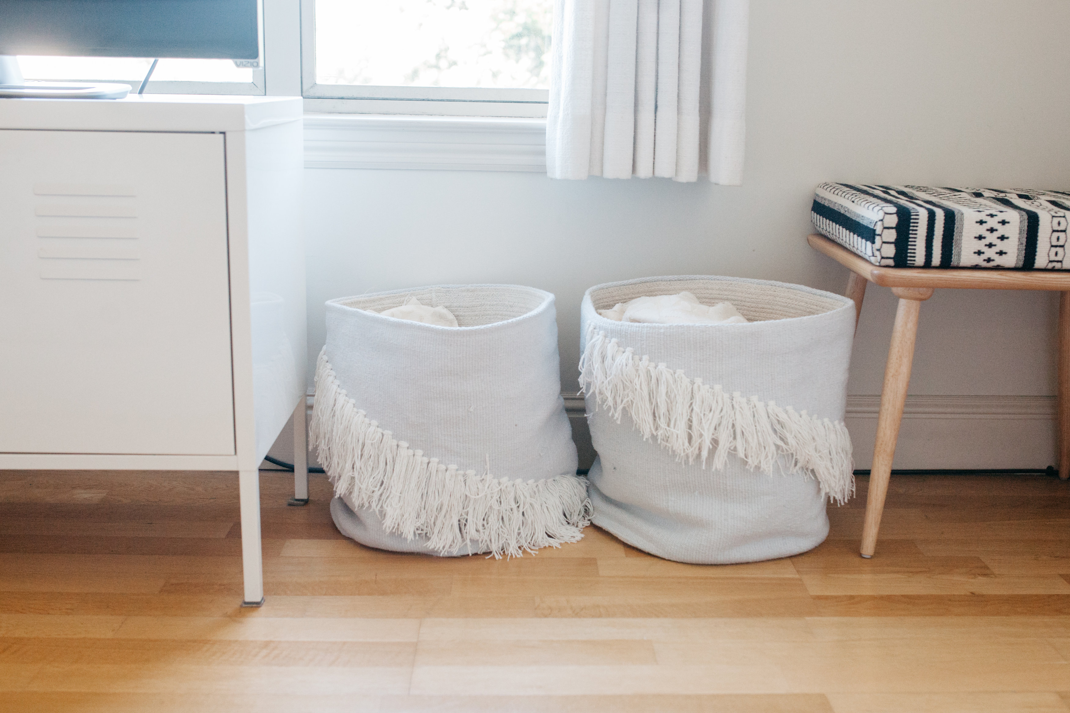 Well I love modern design which is definitely shown in our choice of furniture. I also like to add in fun elements, like those fringed baskets (a recent bargain purchase from Target). I’m a bargain shopper at heart.