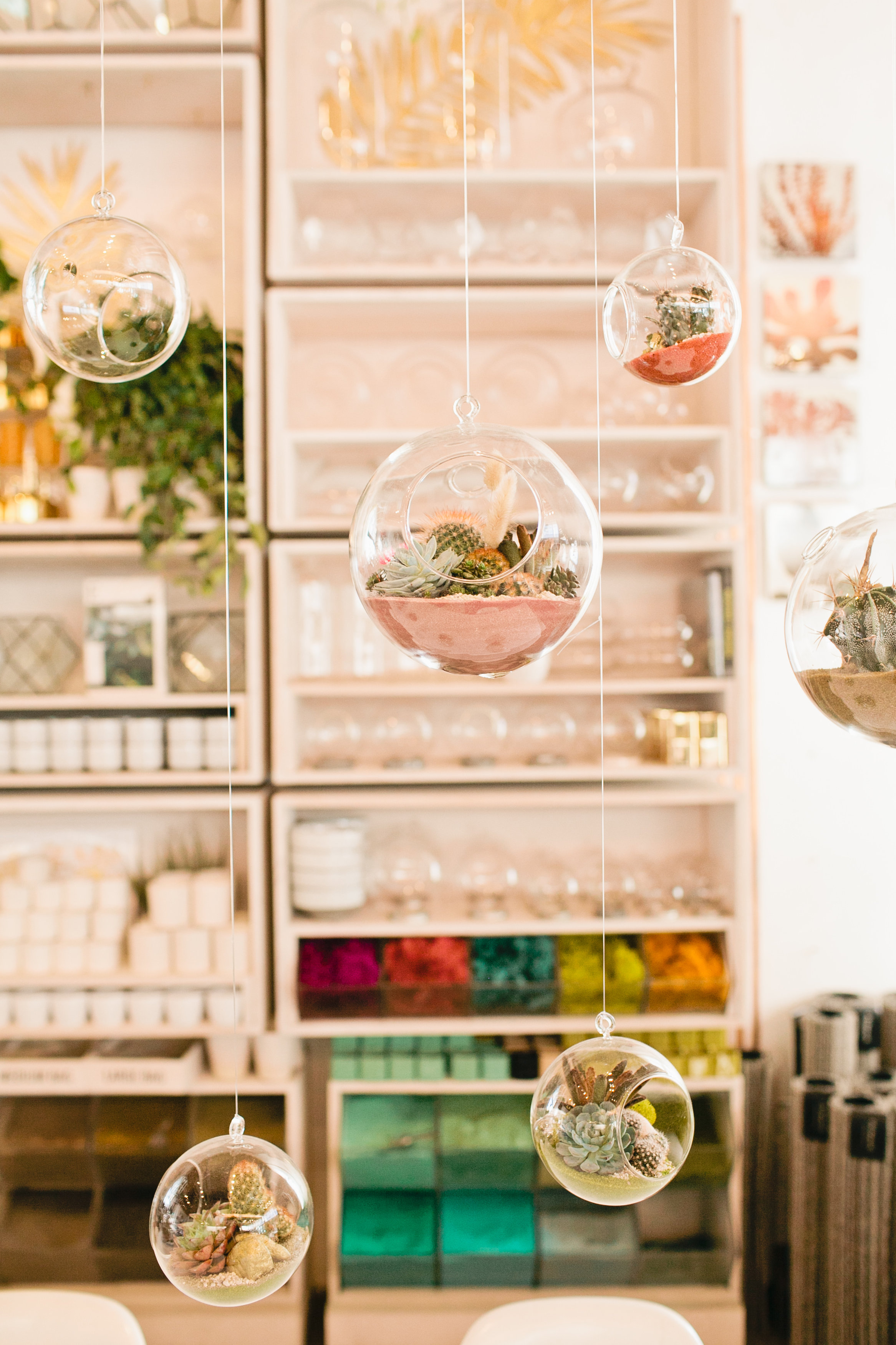 At Pigment plants in general soften an otherwise more industrial space. The matriarch of our collection is a huge fig tree that reaches up in to the rafters. It towers over succulents and other smaller specimen. You can cruise through and admire their architecture or role your sleeves up and get creative at the Plant Lab, our in-store terrarium bar. As the terrarium craze hit we initially offered workshops. In time, we wanted customers to be able to build with us any time they wanted and the Plant Lab was born. Like Charlie in the Chocolate Factory, we wanted it to feel like a wonderland. Colored sands, mosses and rocks line the walls in a rainbow of color engaging adults and kids alike. It’s a go-to for gifting as customers can DIY or order up from one of our associates.