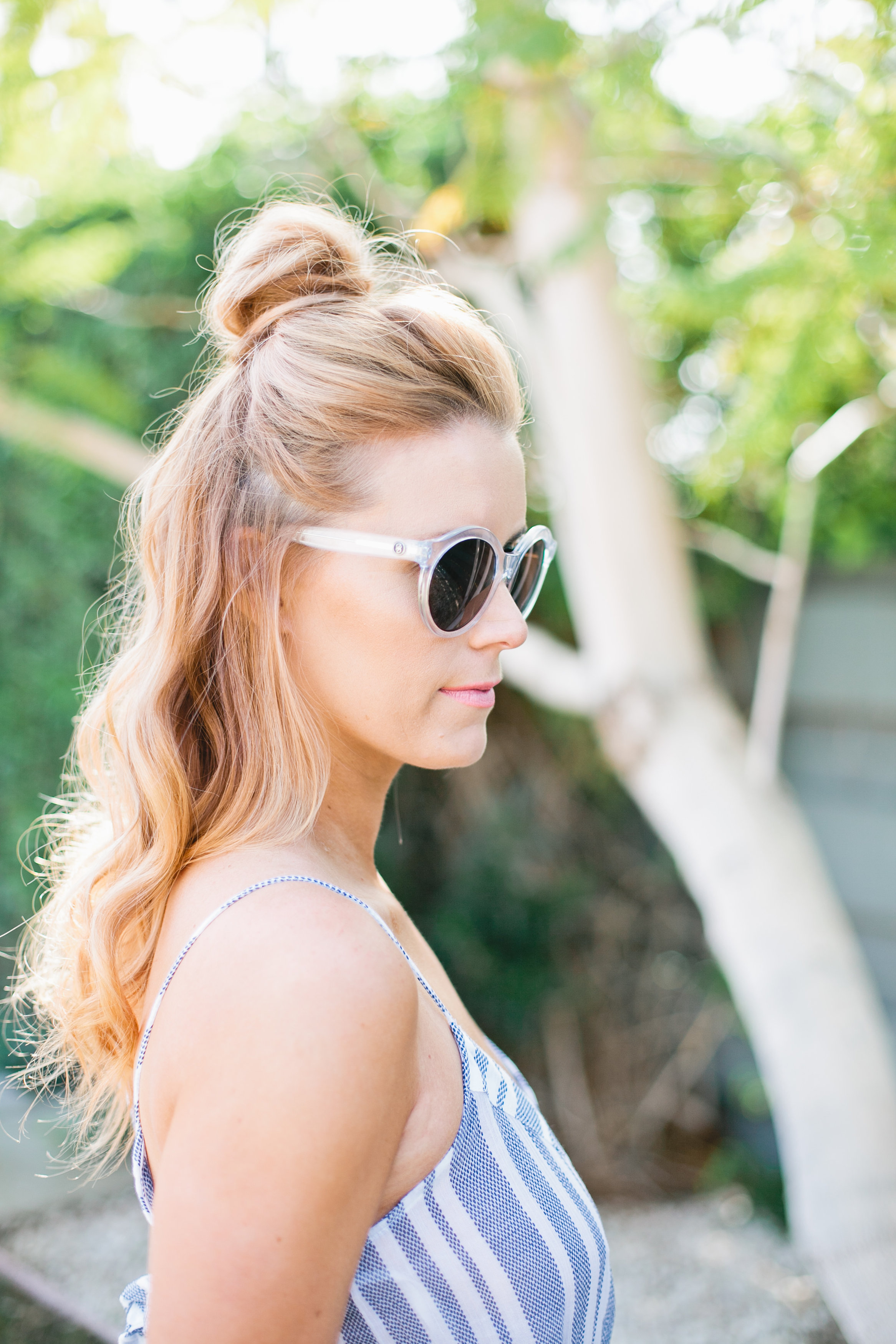 The next look, I fall in love with it more and more everyday. Being 5″2, I’m sorta limited to things I can wear off the rack. I thought a romper would be to long and make me look childish. But not the case at all. 1st, this fabric is incredibly light and soft. Not your normal romper that creeps up your backside. 2nd.. this chambray blue striped print reminds me of when I was little and my mom use to dress all of us girls in matching stripe numbers for Easter. It just screams Easter lunch with family and friends, but way cooler. And 3rd… its by Tularosa. Enough said. You need this Amelia Romper.