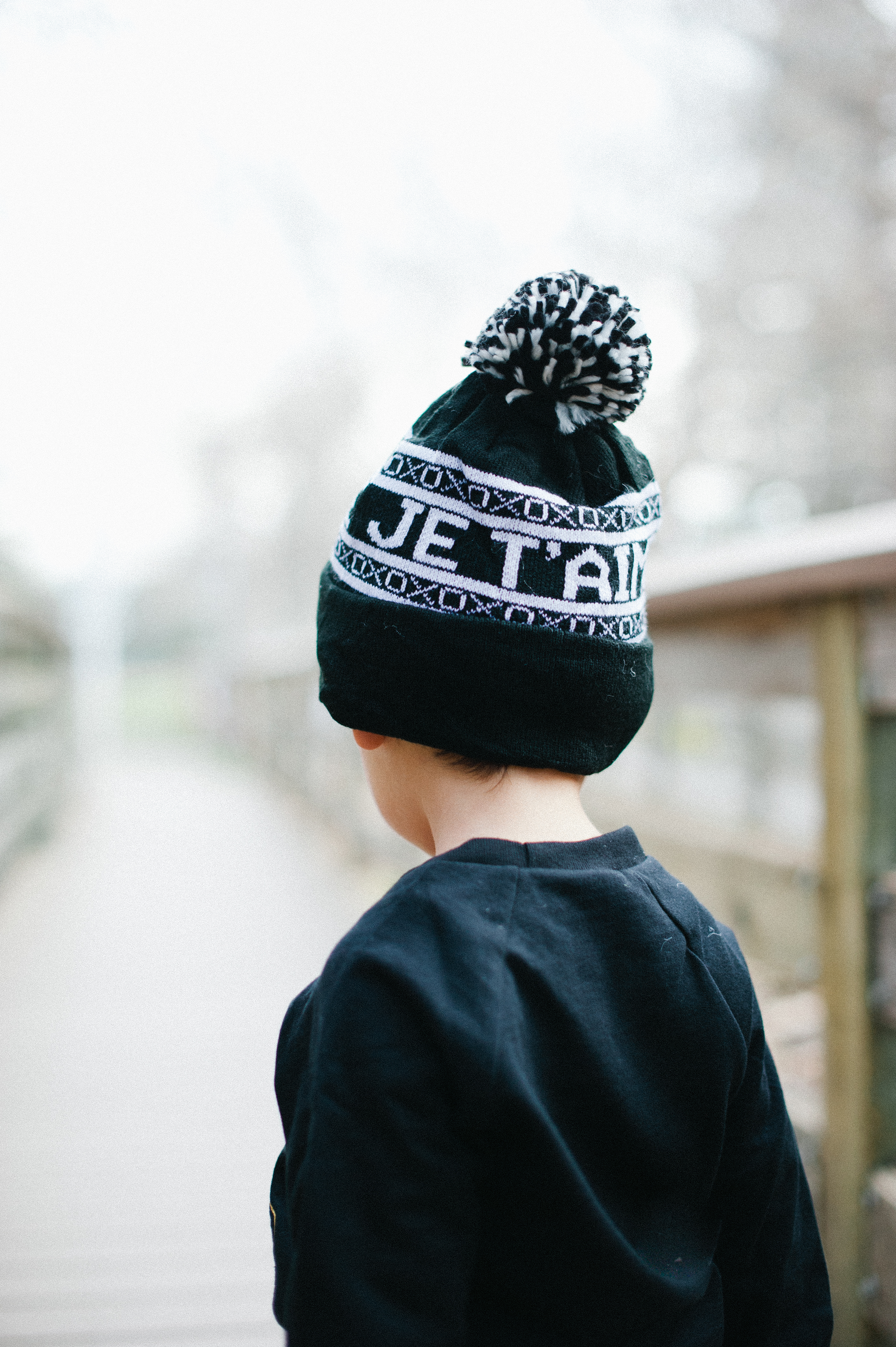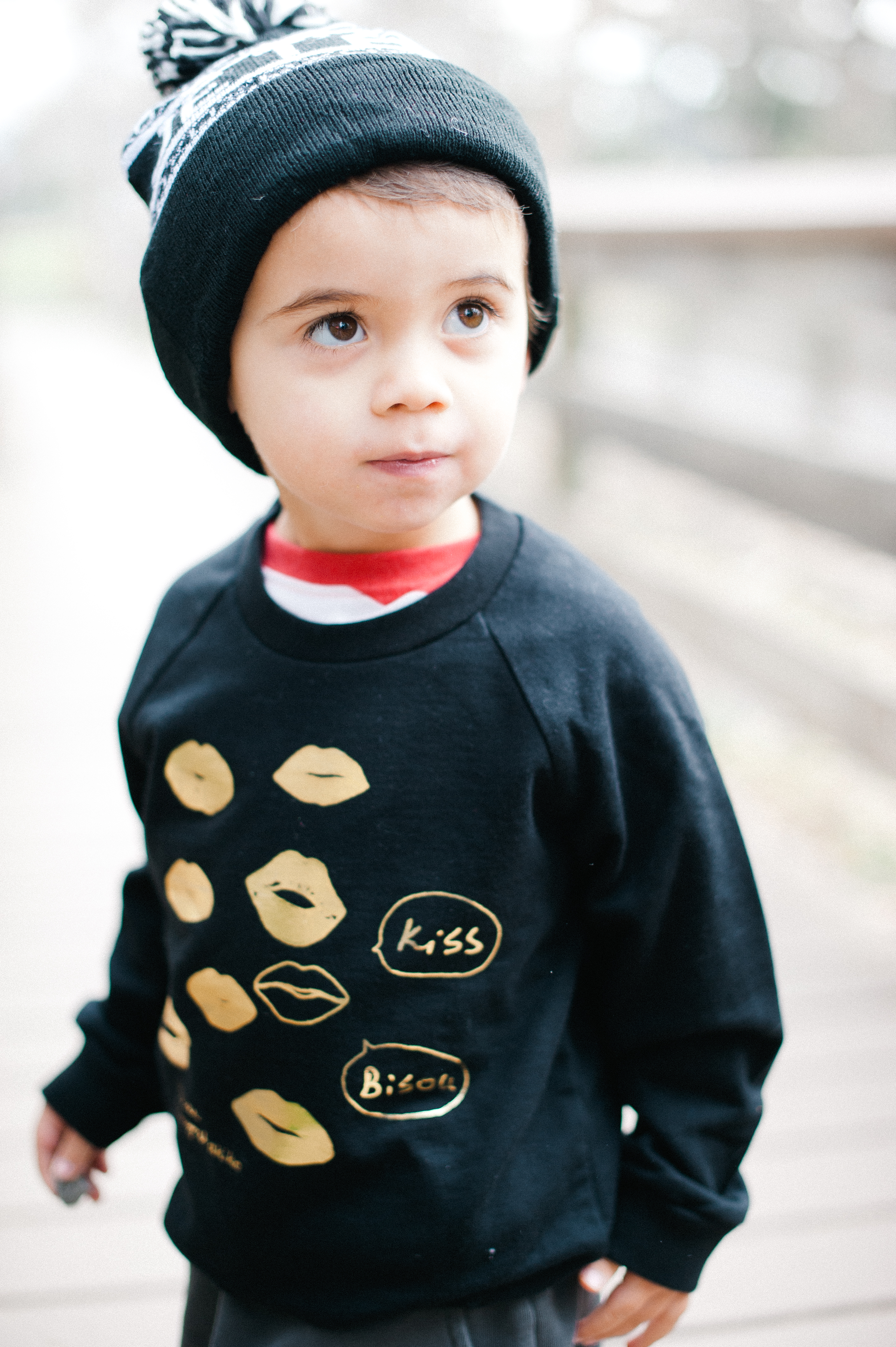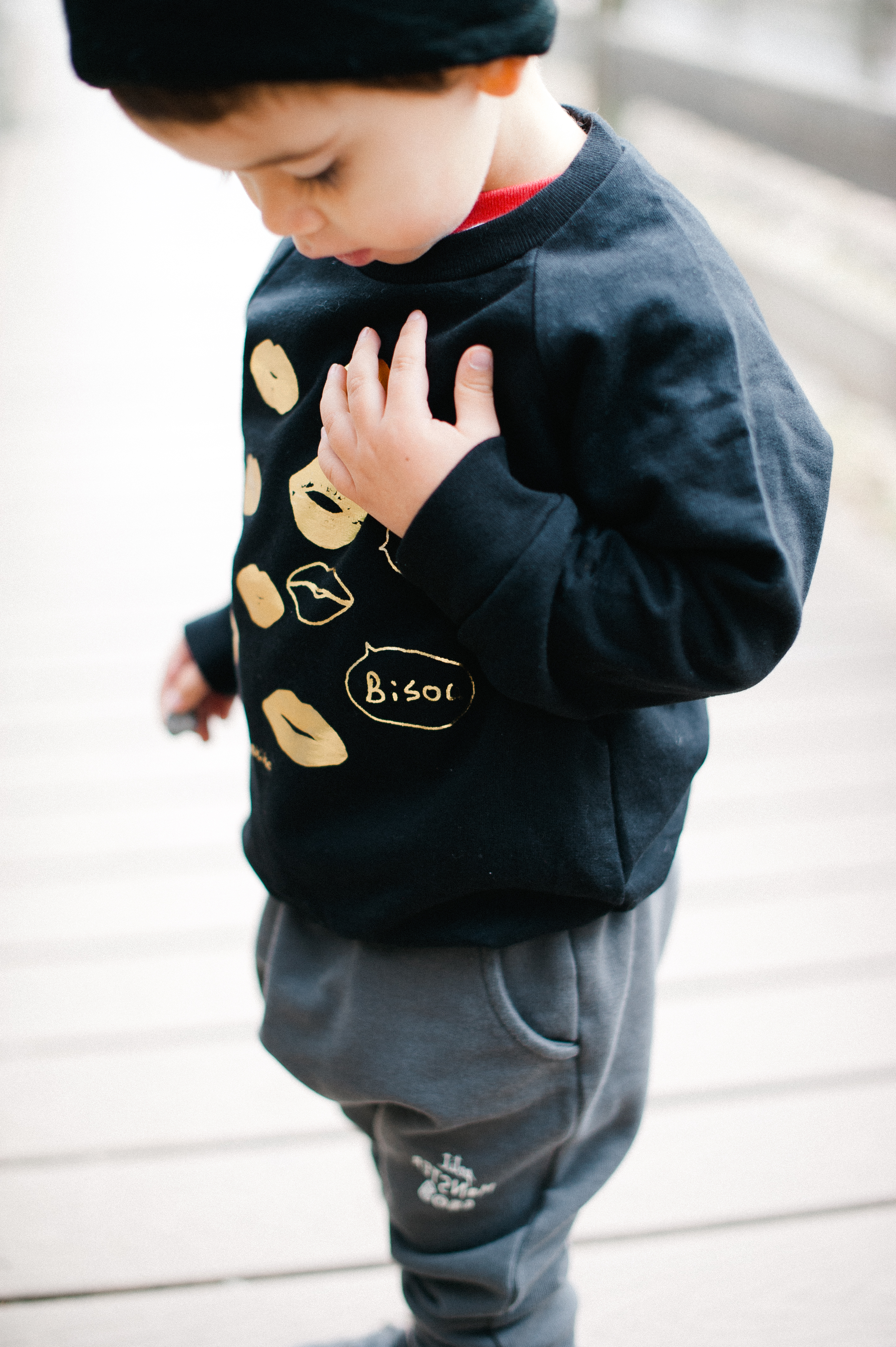 This little man is sporting the Gold Kisses Fleece Raglan Sweatshirt + Petit Monster Black Trousers accessorized with the Je T’aime Kids Beanie in black.