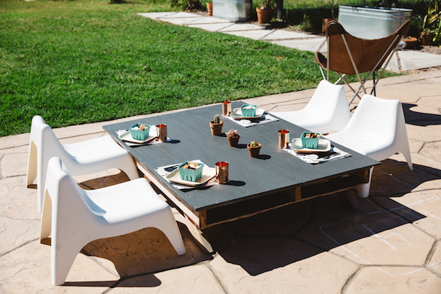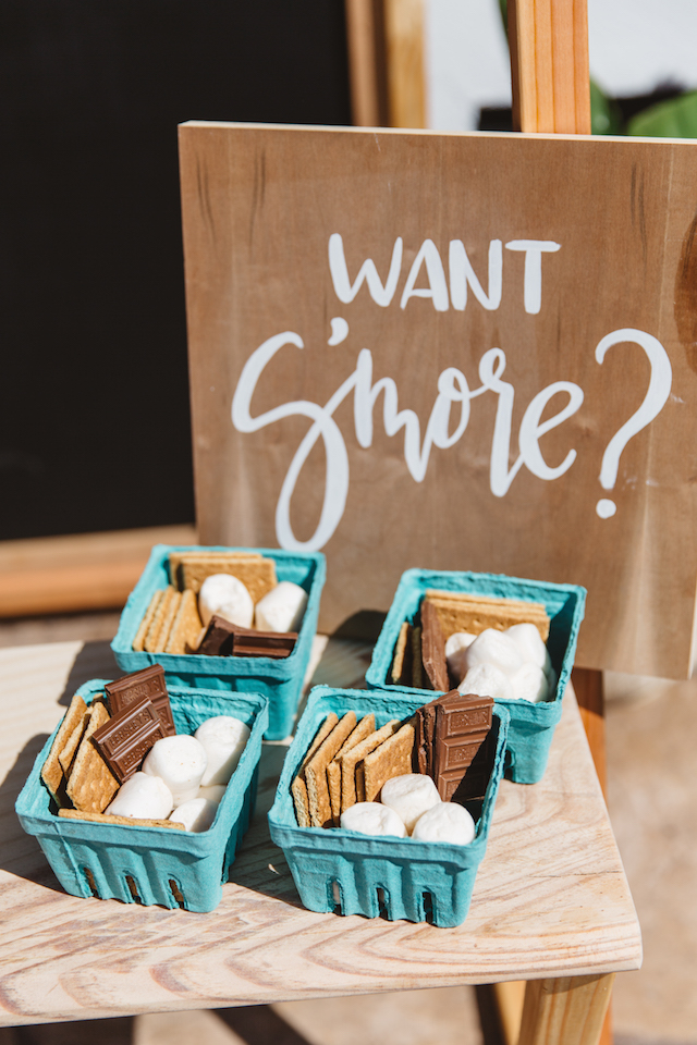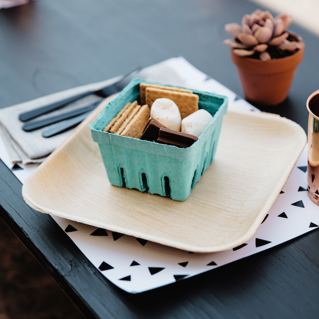 The table set up is so perfect! I love those tiny white chairs!! We found a pattern that we used for the placemats and added some neutral accessories. The turquoise s’mores boxes were the pop of color we needed! I think my favorite is the matte black plastic flatware though!