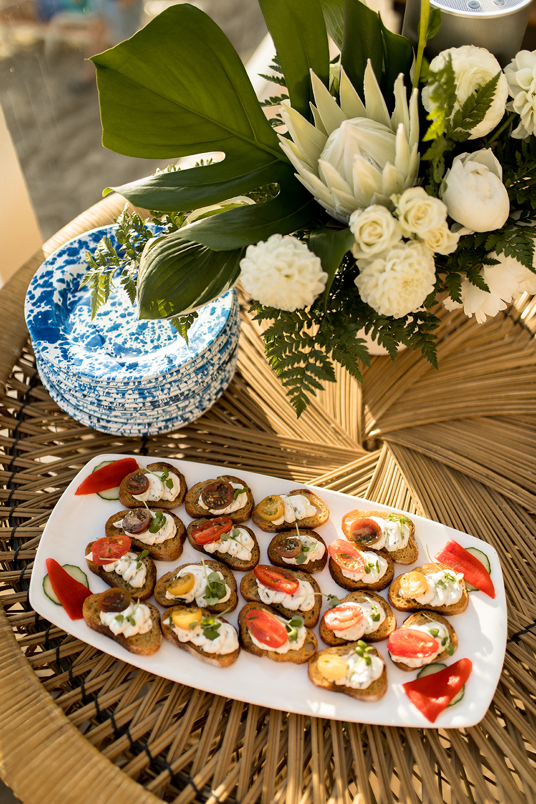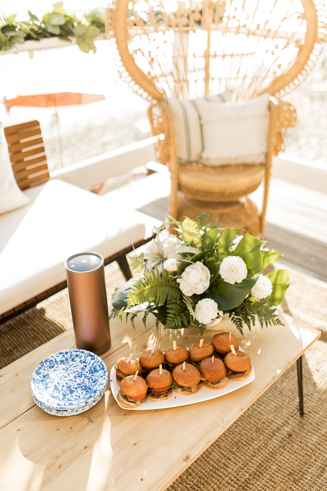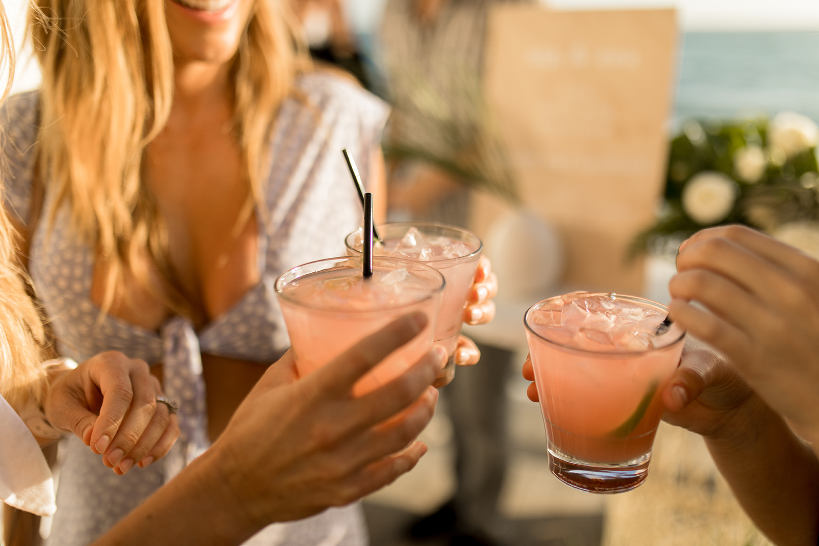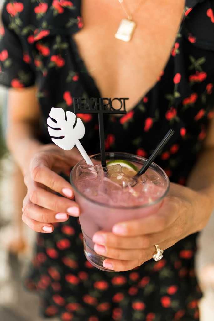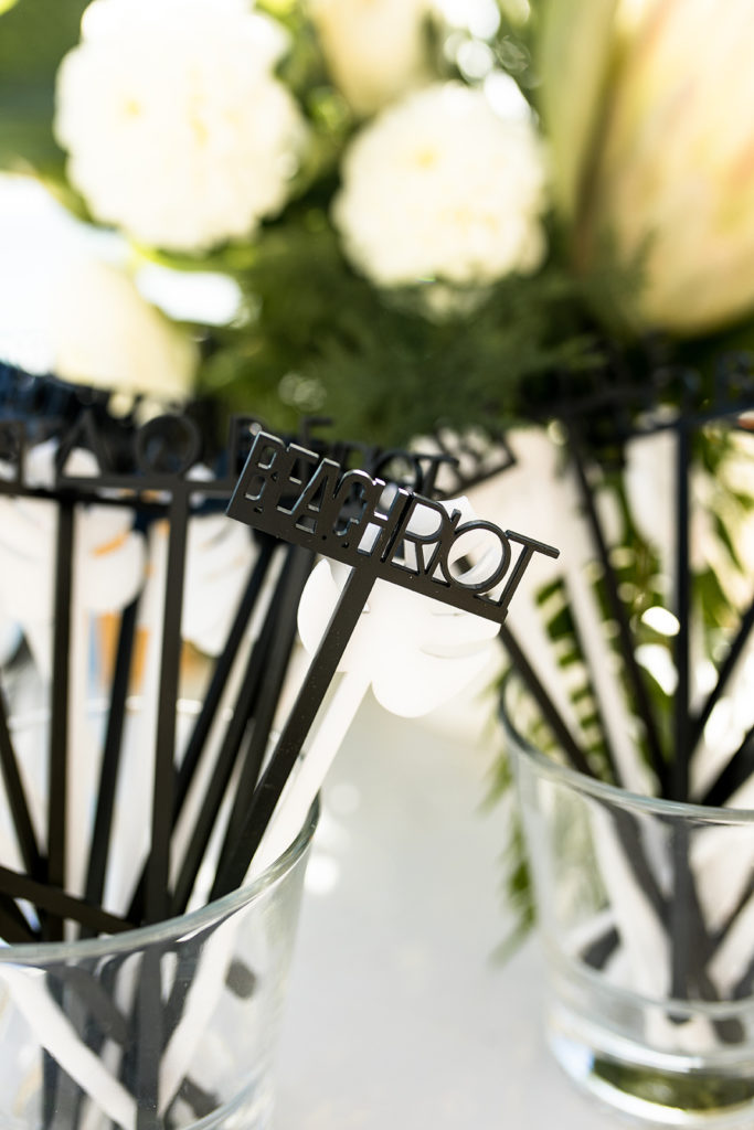 Entering the party you were greeted with a simple sign – pure tropical chic!  Thanks Poppy Jack Shop for always adding the special details to our events, including those cute drink stirrers you see…  I also totally obsessed over the florals by Anna Creative Florals.  She nailed the vision for the day and her florals were the perfect touch to the event.