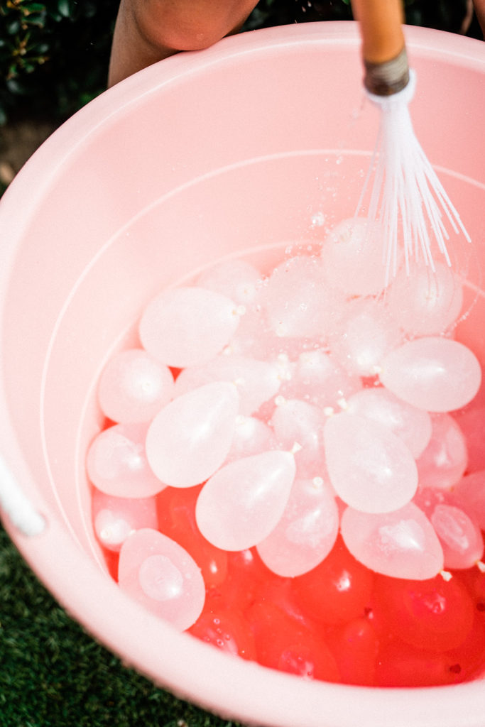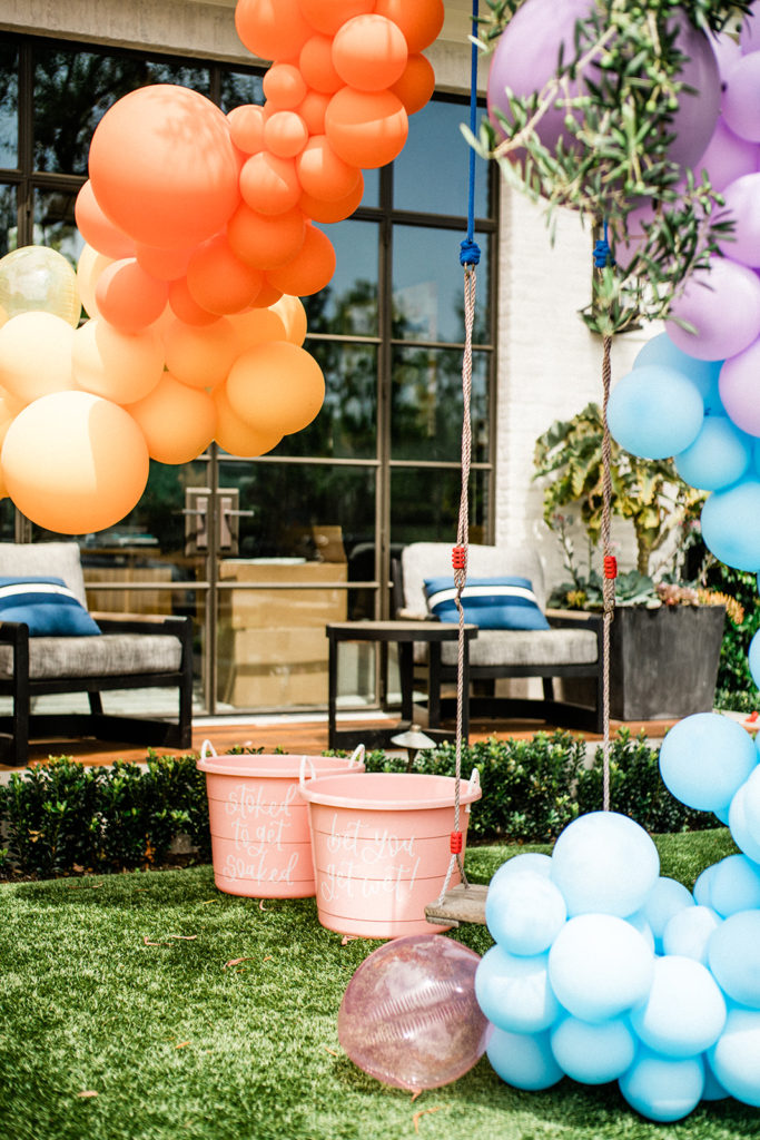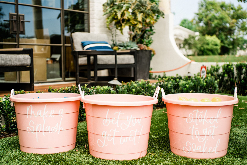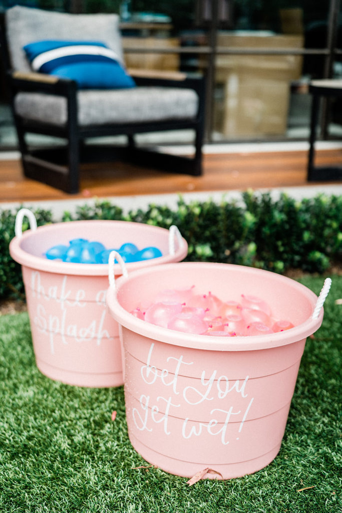 You may have noticed me in the background filling water balloons in the photos above, haha! about 600 water balloons to be exact! All going in these cute buckets from Target with fun wording by Poppy Jack attached!