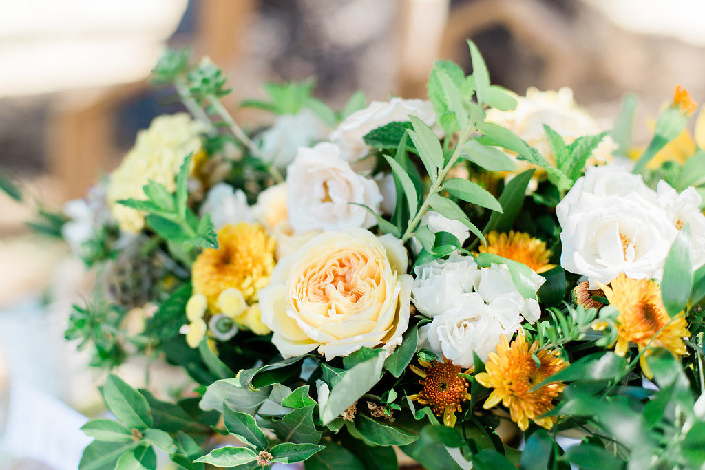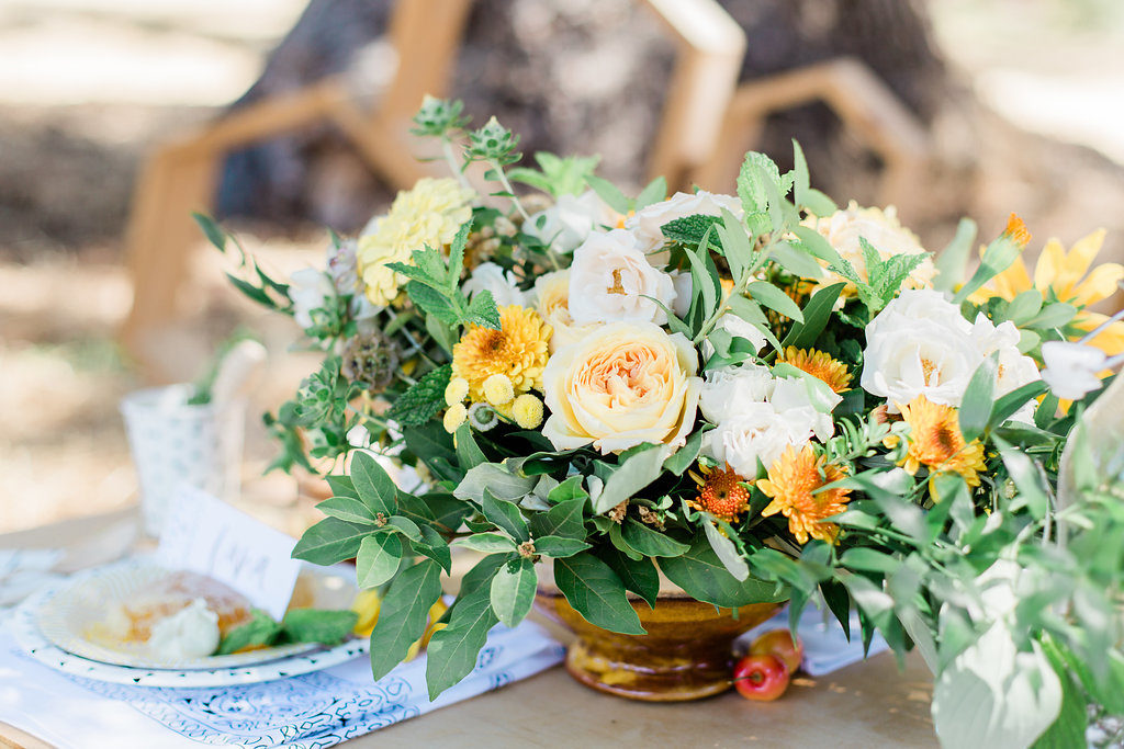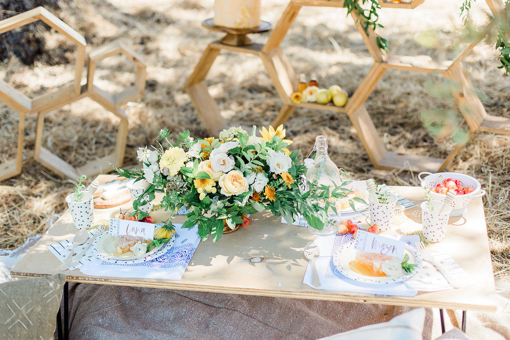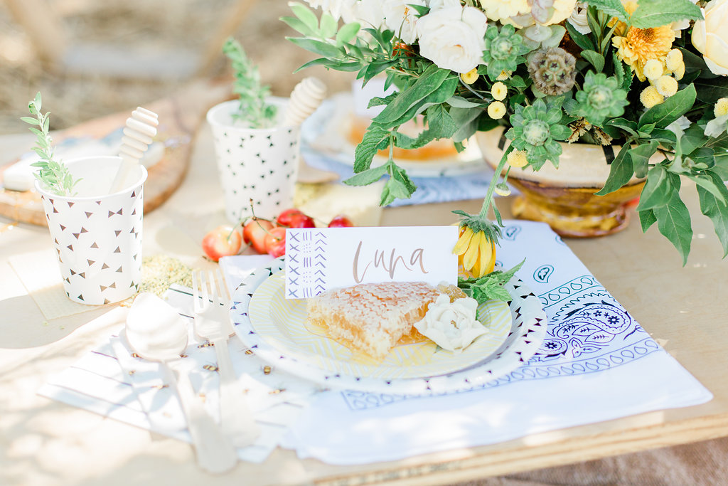 Bloomande created this pretty neural golden toned arrangement for the kid’s table. I love how it really brings out the golden and yellow tones perfectly. Along with its beautiful organic look, this arrangement also had herbs tucked in which made it smell so good! Nestled in the middle of our sweet bee themed tablescape, it was right at home. What bee doesn’t like flowers?!