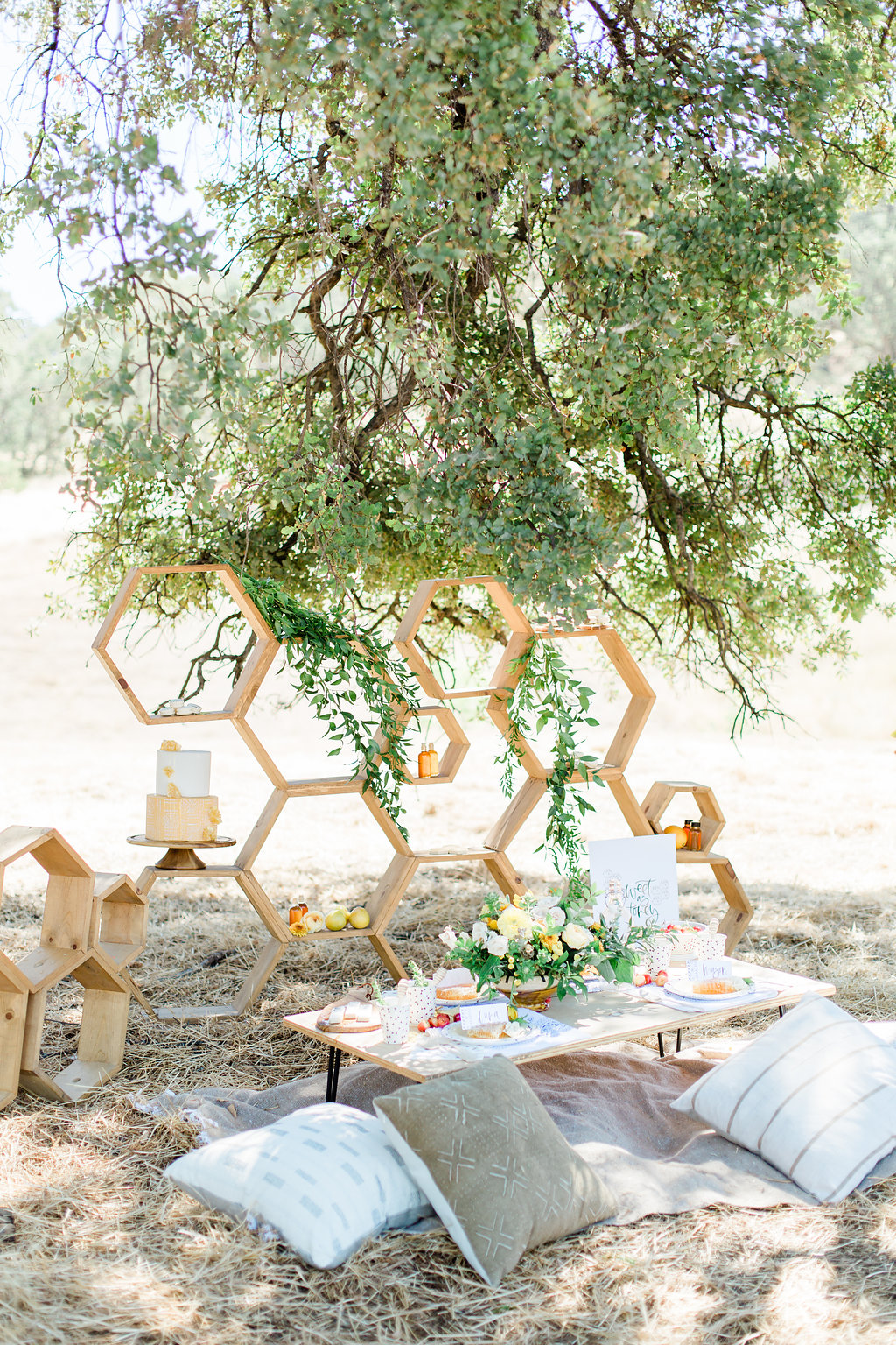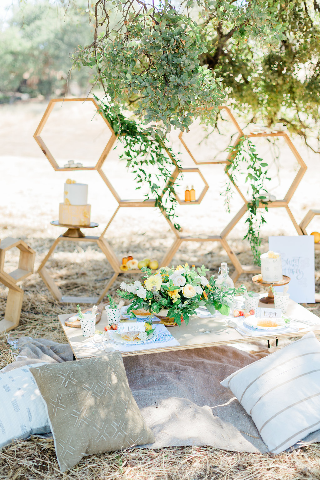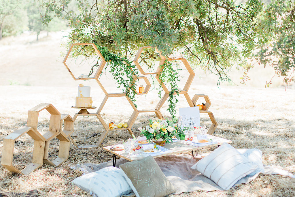 With it being a bee theme this hexagon wooden backdrop made by Bloomande was the perfect background piece. Accompanied by our favorite essentials we use all the time, Gunn & Swain blankets and Boho Pillows in neutral tones, we have ourselves a cute little scene right here.