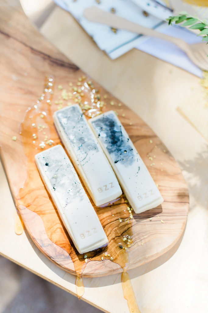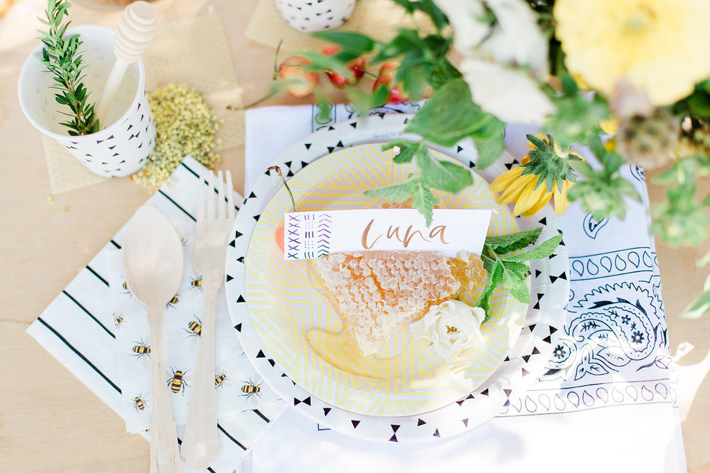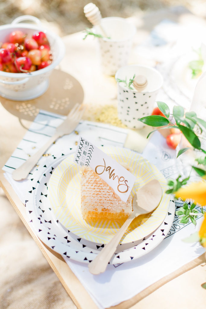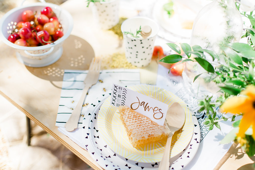 Honeycomb placeholders are where it’s at people! Also beeswax used as a coaster! Plus, bring in the bee pollen and honey drippers to round out your bee details for one cute tablescape.