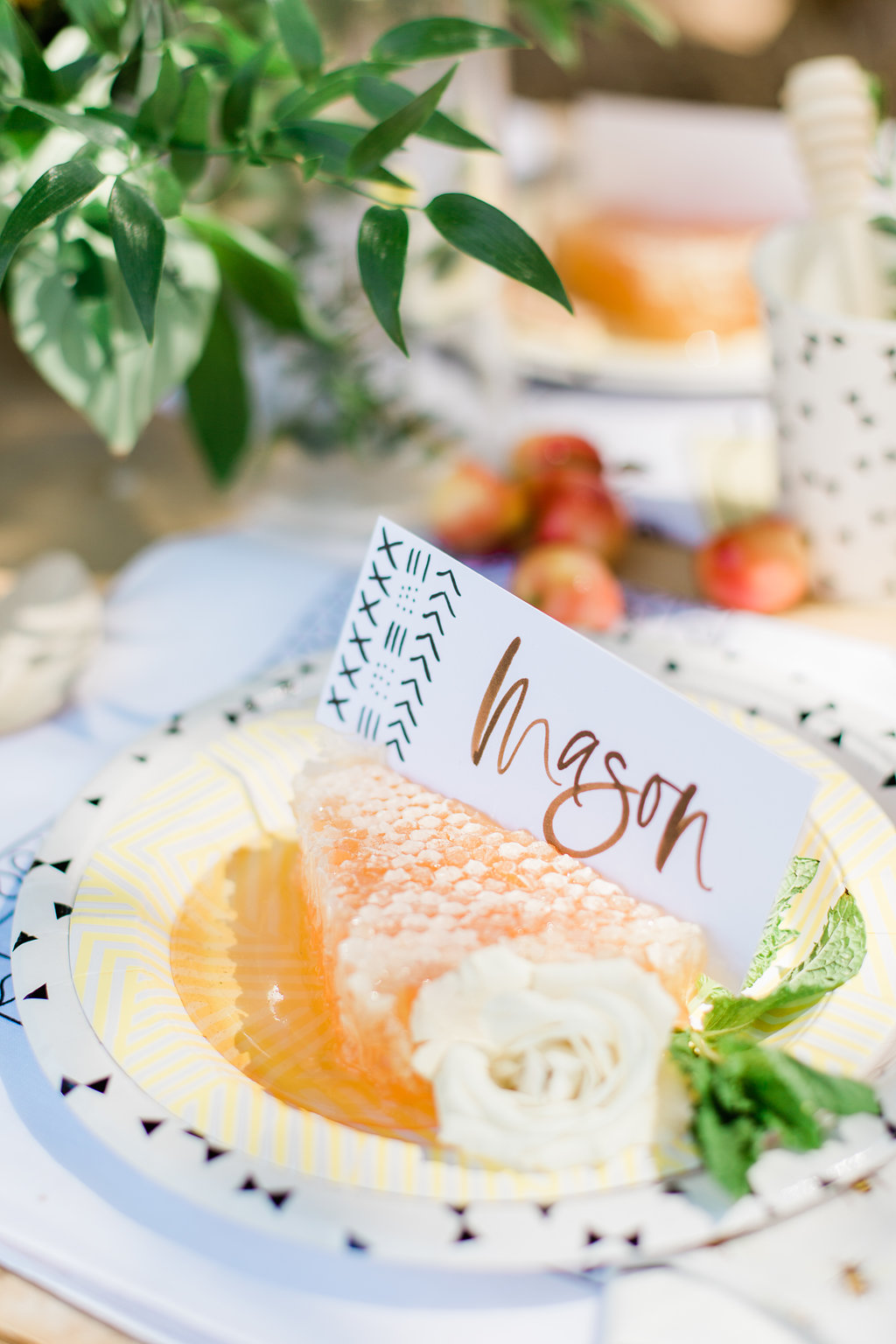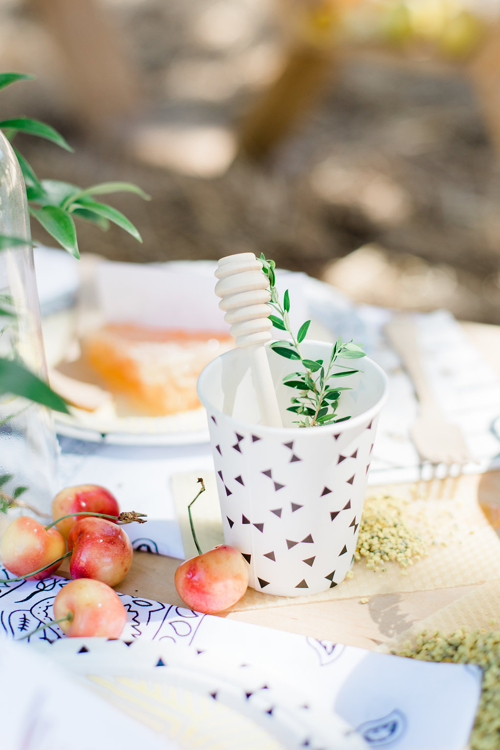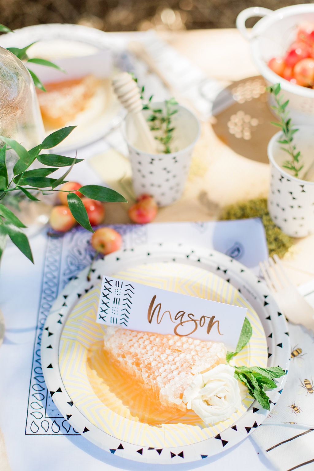Honeycomb placeholders are where it’s at people! Also beeswax used as a coaster! Plus, bring in the bee pollen and honey drippers to round out your bee details for one cute tablescape.
