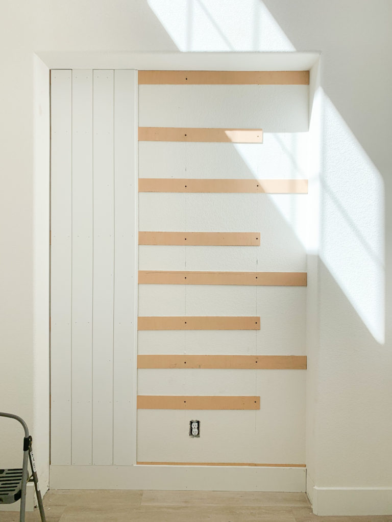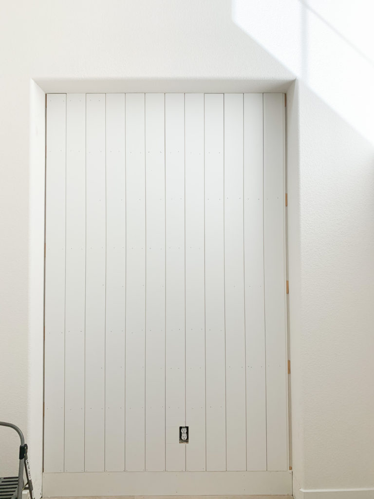 Step 2: Cut and install the shiplap boards. Cut the shiplap board to size with miter saw and install using an 18 gauge brad nailer, making sure to drive the nails into the 1/4 inch backing that was installed in step one.