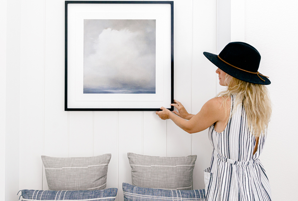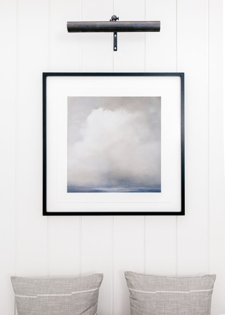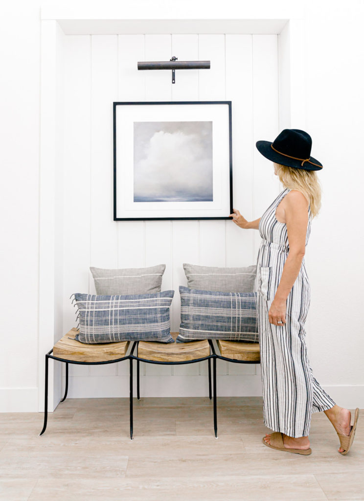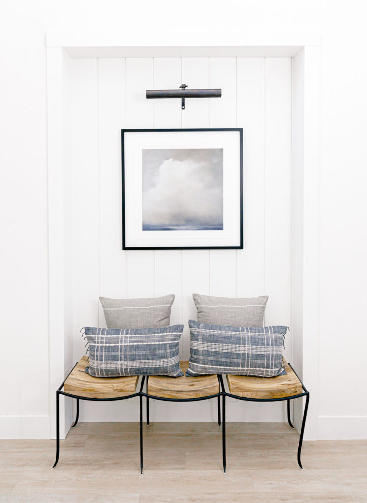He did a great job! Now, I currently have him in the laundry room with you guessed it, more shiplap! But that will most likely be the end of the vertical shiplap chapter in our house, can’t go crazy. When Studio McGee came out with their 1st collection at Target, I saw these woven plaid pillows and bought up a TON! They are still available, hurry and shop below to get them! The woven textured stripe is sadly sold out! I wasn’t sure exactly where they were going to go, but I would find a place. They are the perfect addition to the wooden metal bench. And remember that light? There it is right above the Quiet Dawn Art Print from Minted. I love how all the blues flow together.