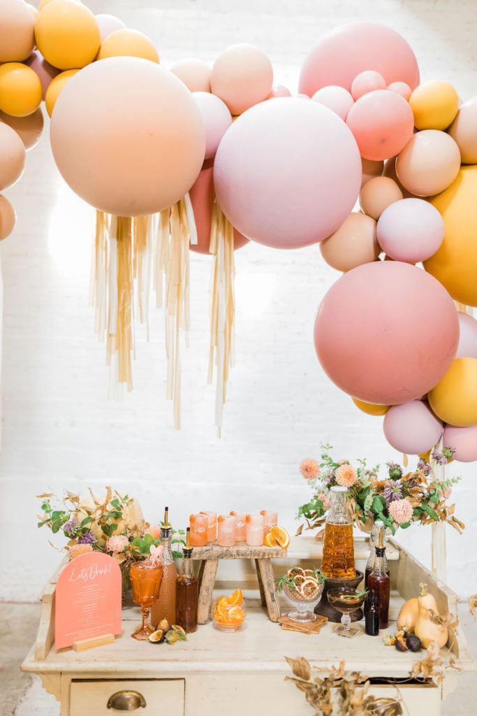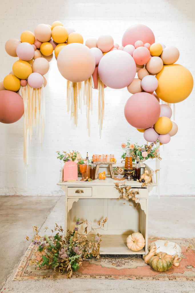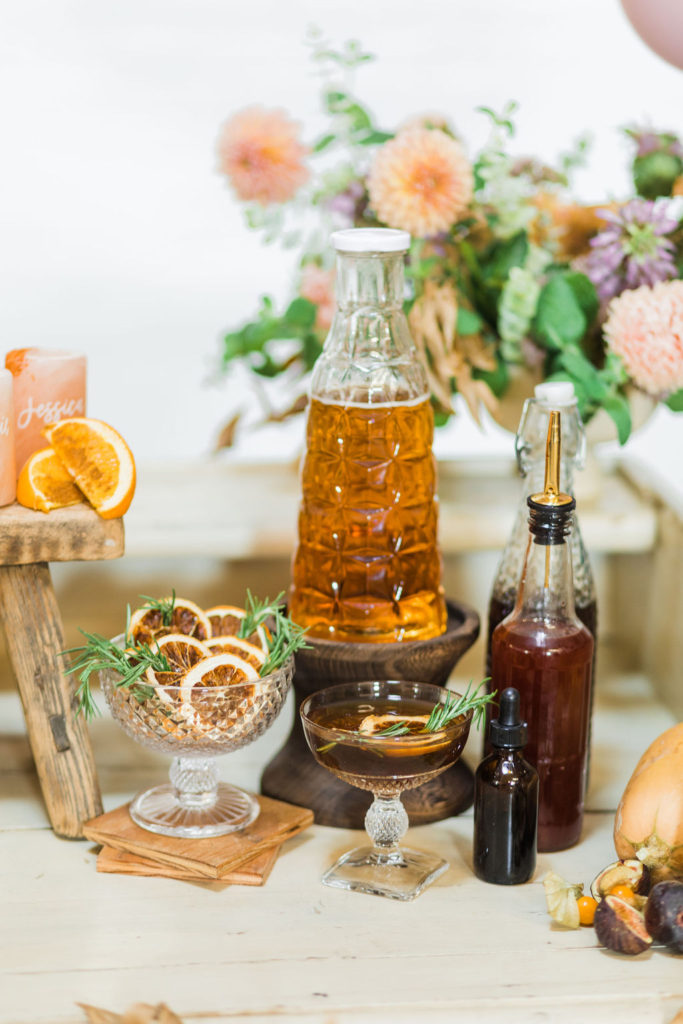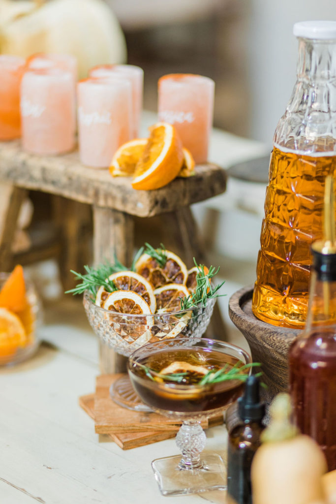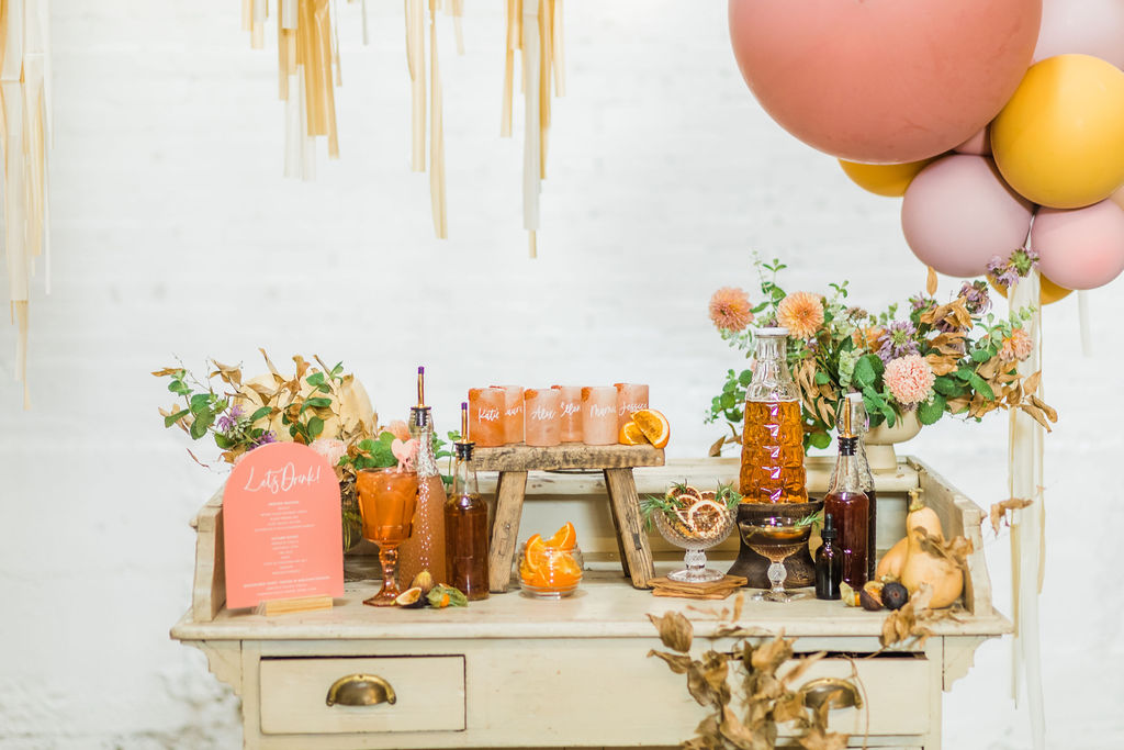 The lovely ladies at Bottles & Blooms handled the cocktails for us. They always come up with fun themed cocktails that work with our parties or shoots. In this case, they created three delicious cocktails – Sweater Weather, Autumn Sunset, and Marigolden. Recipes coming up, but first let’s check out the decor…