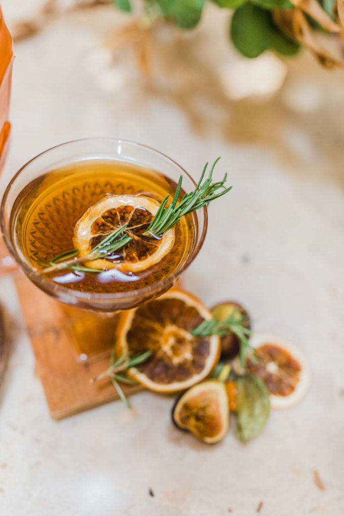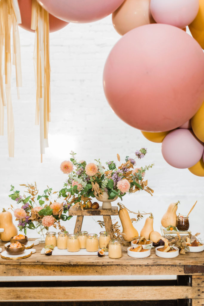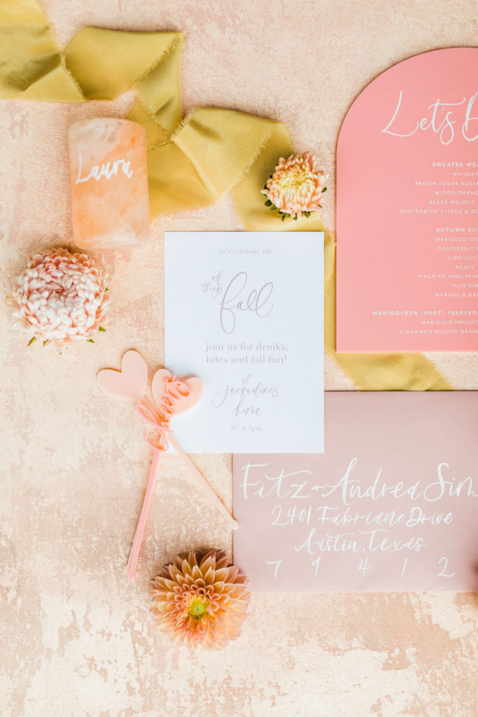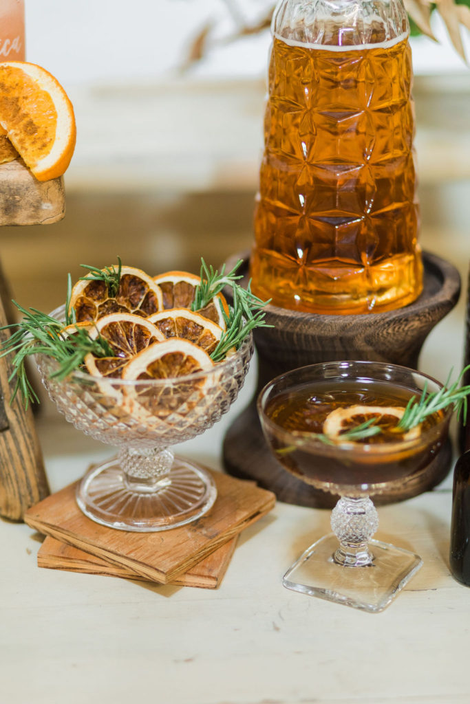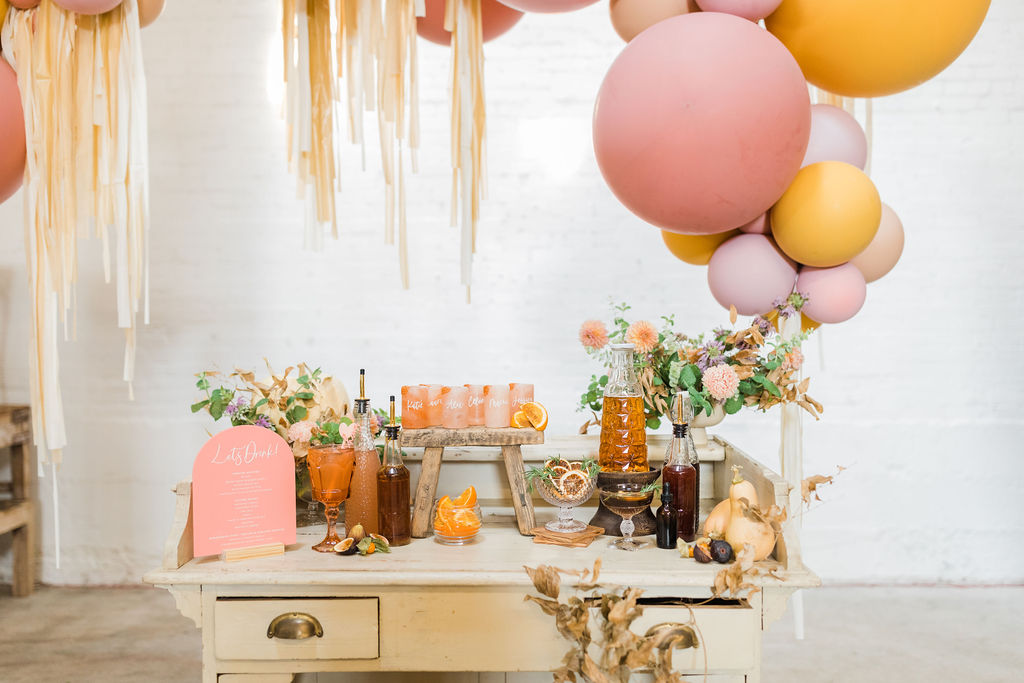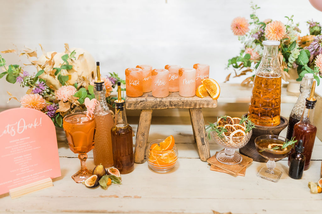 The lovely ladies at Bottles & Blooms handled the cocktails for us. They always come up with fun themed cocktails that work with our parties or shoots. In this case, they created three delicious cocktails – Sweater Weather, Autumn Sunset, and Marigolden. Recipes coming up, but first let’s check out the decor…