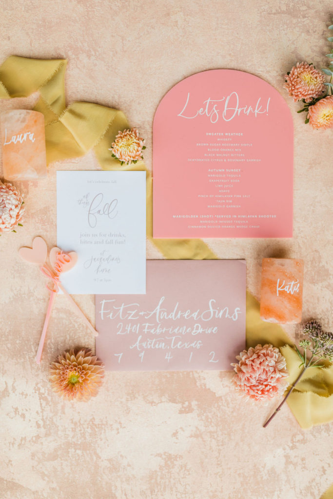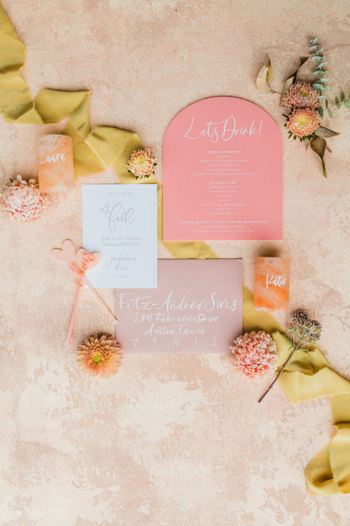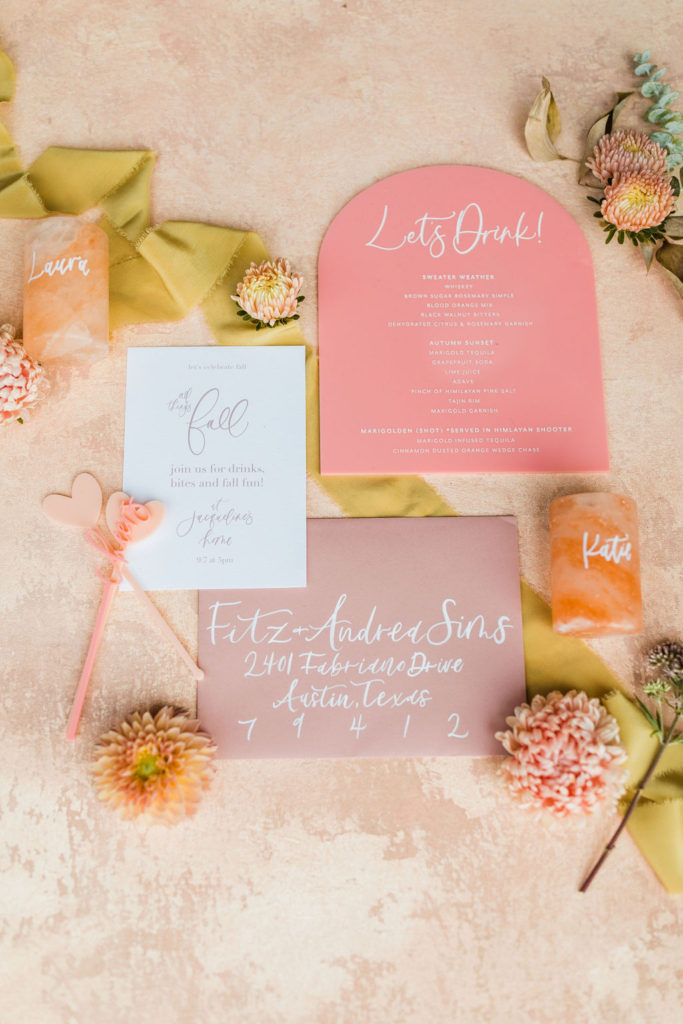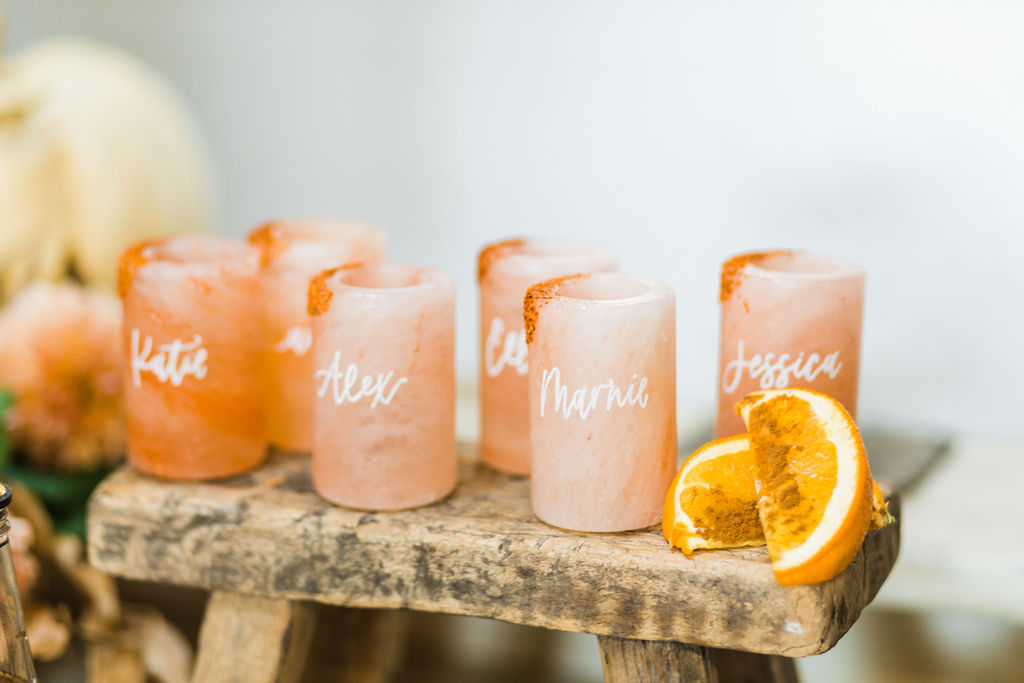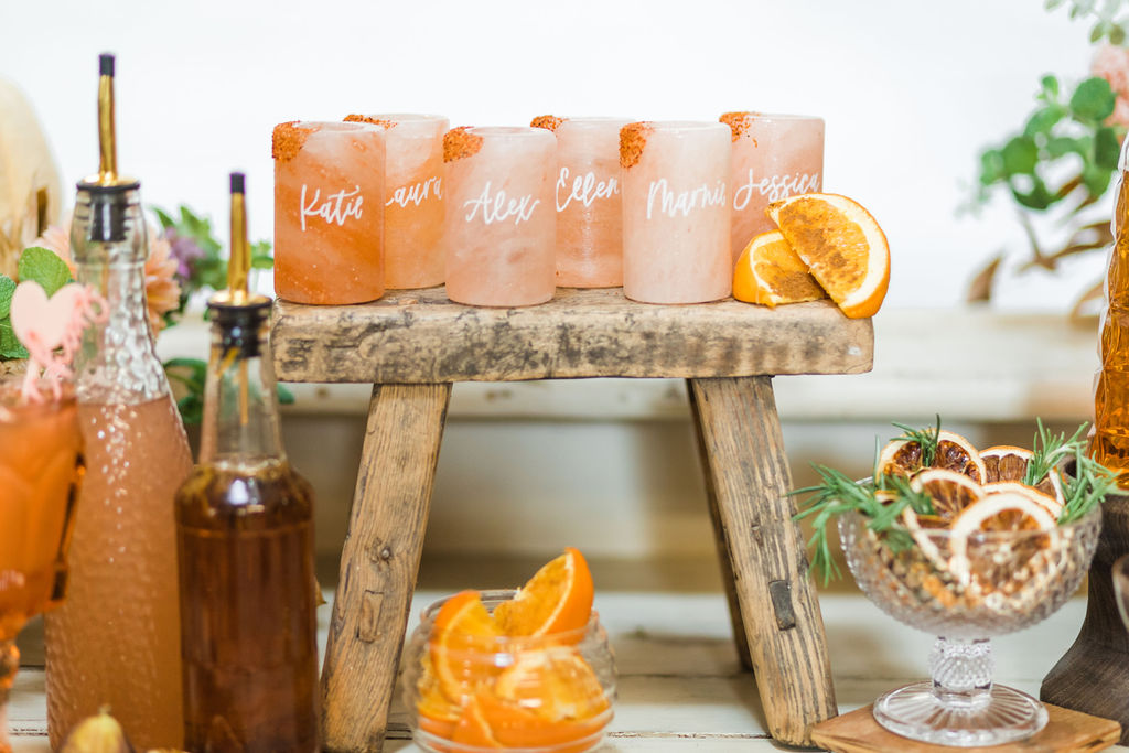 Every amazing event starts with a pretty invite!!! All of the details are by the incredible Aislinn from Proper Letter. She did the simple yet pretty invite, calligraphy on the dusty rose envelope, stir sticks, cocktail menu and customized Himalayan shot glasses. More on those later, but can we talk about how gorgeous this all is together?! Styled on a Chasing Stone styling mat with ribbon from Party Crush Studio and florals from Third & Park.