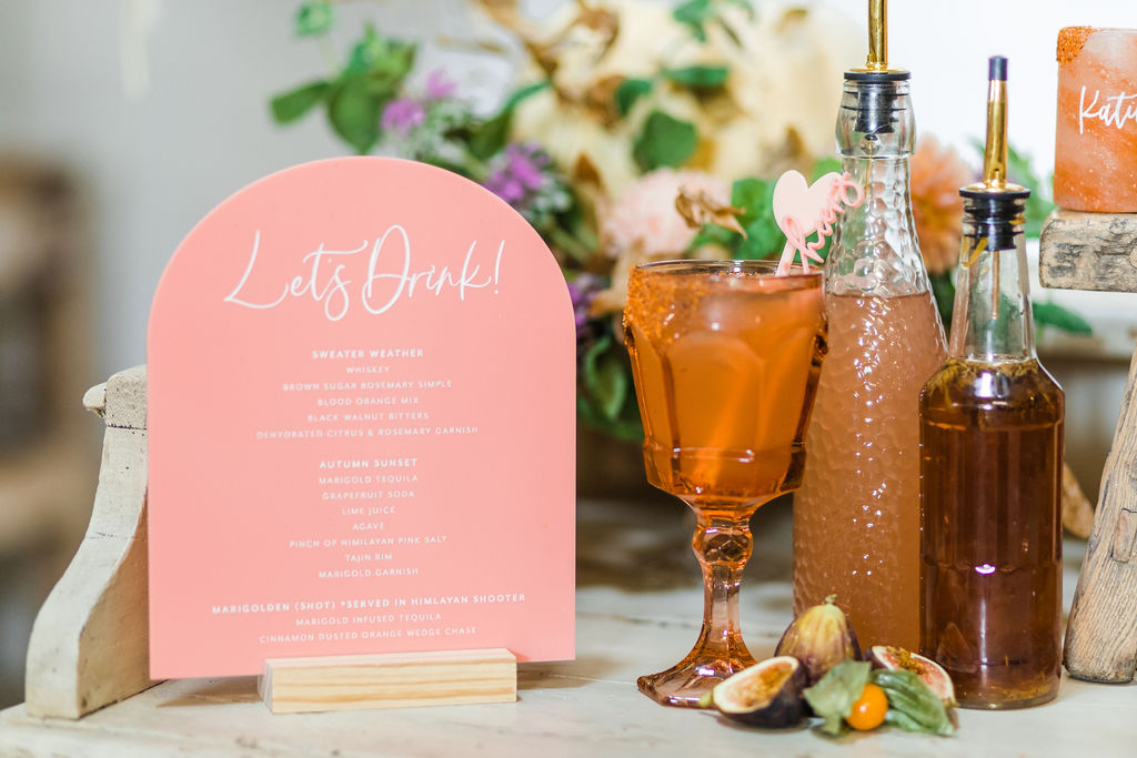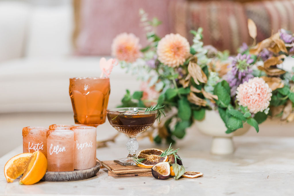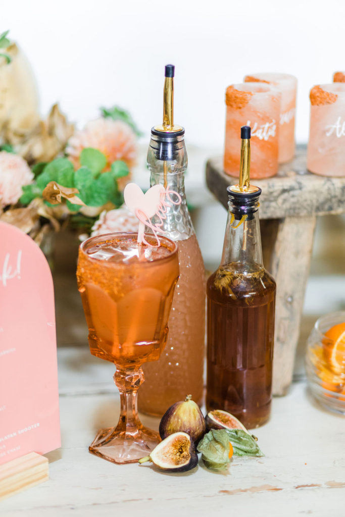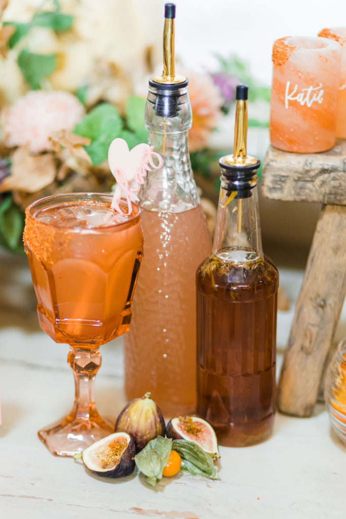 There’s that pretty pink menu and the stir sticks Proper Letter created for us! Looks perfect on our bar set up! And I love the way Bottles & Blooms add in all those fun details when they style like figs, rosemary, and kumquats!
