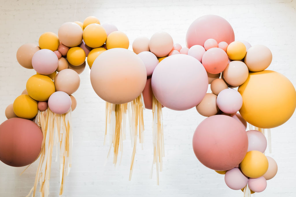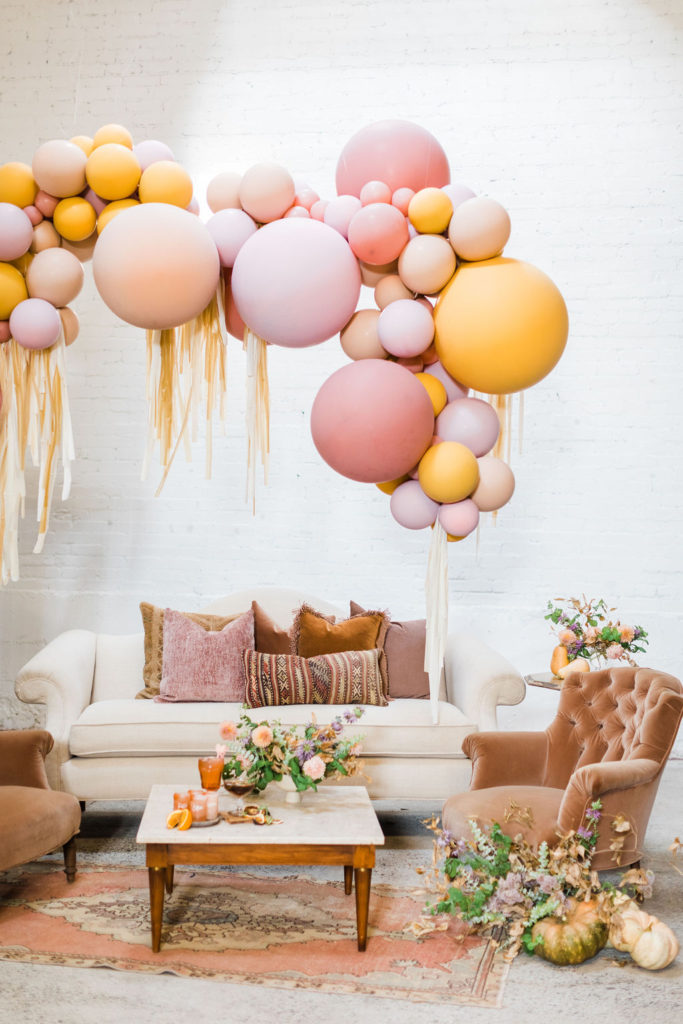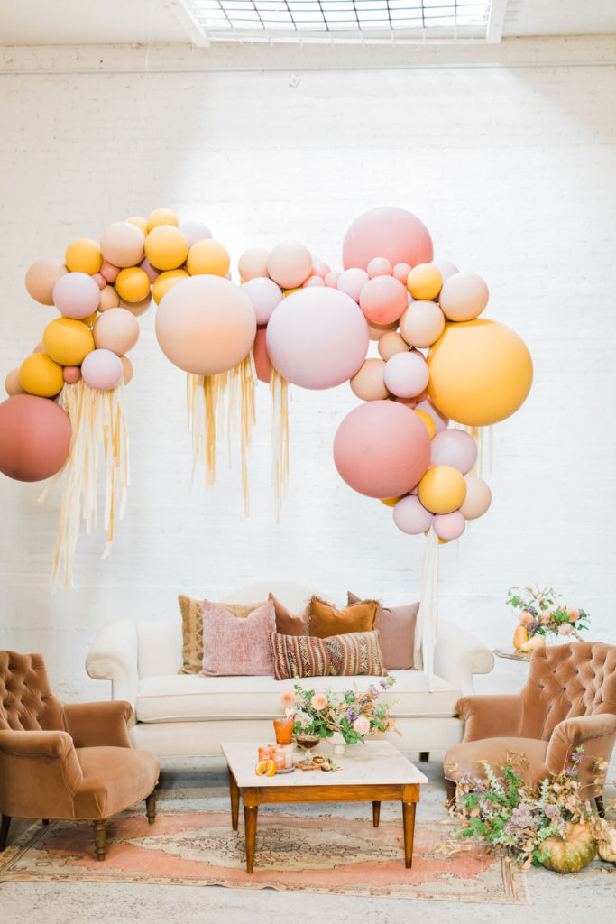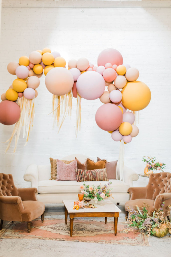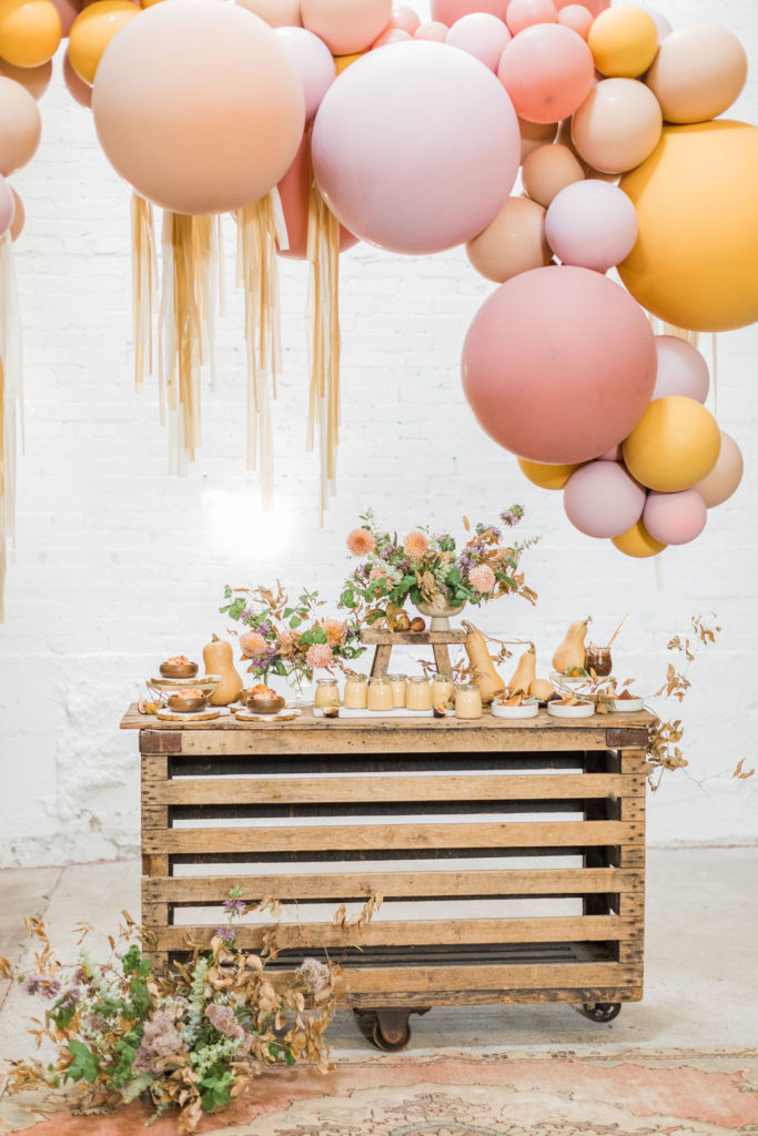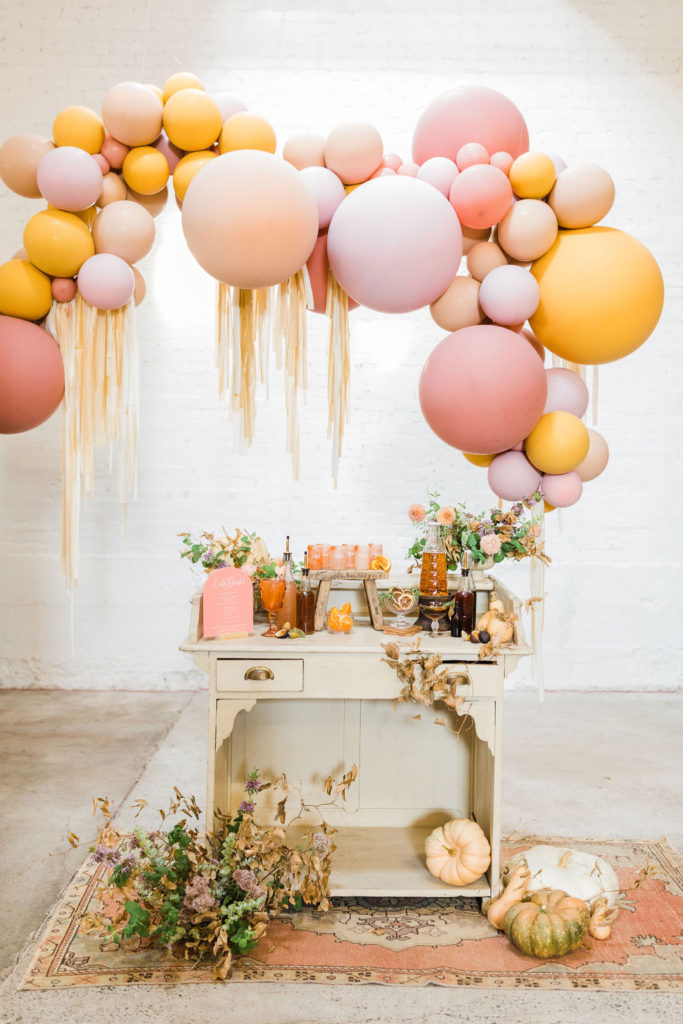 I mean, how cute is this set up?! Of course, we have the pretty balloons by The Pop Shop. Her colors are so fun for this one – a bit of marigold mixed with nude and a mix of rose-colored prettiness! Add in some fringe and you really have a party!!