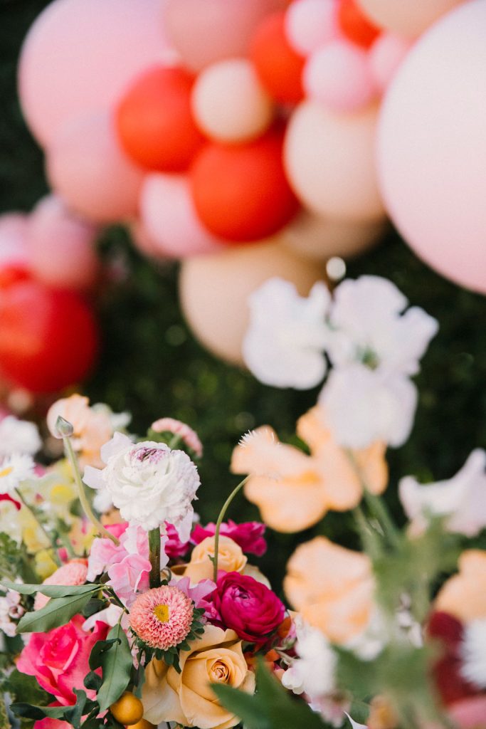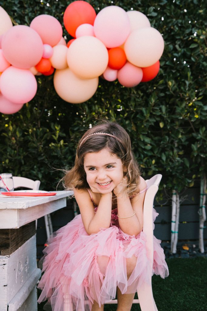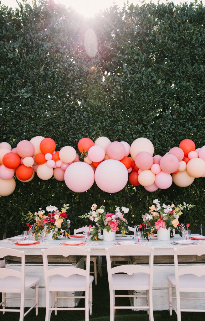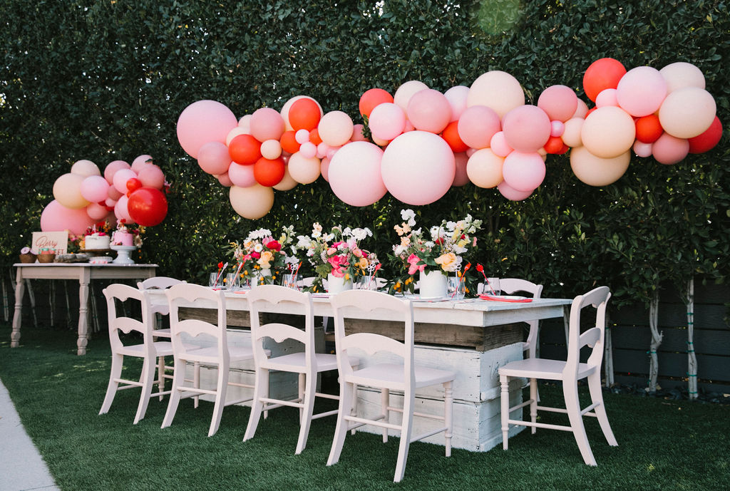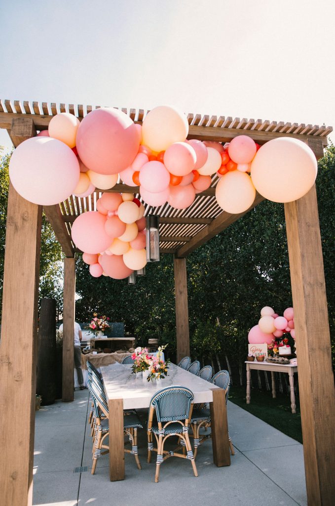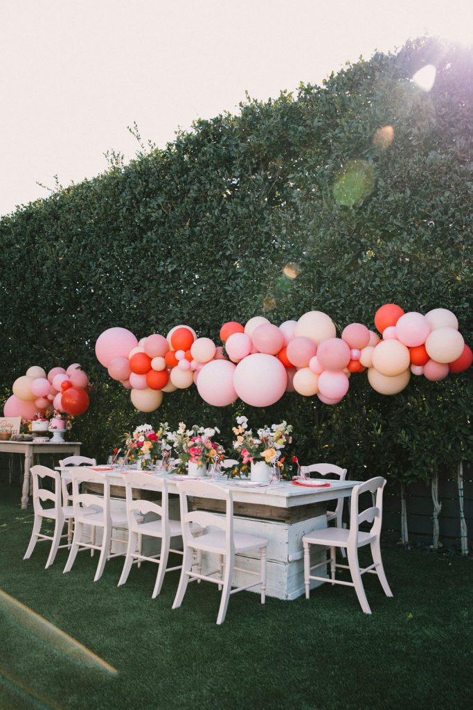 Our adorable table was set in the backyard. I had fun using Sweet Salvage Rentals’ precious pink chairs and a white table layered on crates. They reminded me of something you’d put strawberries in on the farm! There were lots more balloons by The Pop Shop! We weren’t holding back on this one!!
